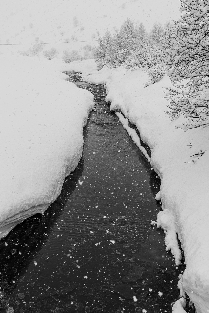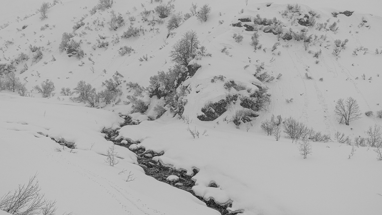 Drei Typen auf Tourenskis überholen uns, den Rucksack gefüllt mit Seilen. Sie wollen Eisklettern gehen zuhinterst im Tal. Vis-à-vis am Hang entdecken wir wieder einen Birkhahn. Und es schneit und schneit, die Sicht ist mässig bis schlecht. Bald sind wir z’Hinderst, die Sicht ist noch schlechter geworden. Von den Bergen im Talschluss hören wir ein ständiges Rumpeln und Poltern, Lawinen donnern nieder, sehen können wir aber nichts. Da, wo die drei anderen hingegangen sind. Verantwortlich sind wir ja nicht für sie, Sorgen machen wir uns trotzdem. Dann tauchen sie aus dem Nebel auf, sie haben ihr Unternehmen aufgegeben, wir sind beruhigt und kehren auf demselben Weg um wie wir hergekommen sind. Von unseren Spuren sieht man nichts mehr, alles ist zugeschneit. Es ist wunderbar, so durchs Schneegestöber zu wandern. Glücklich und zufrieden kommen wir bei unserer Unterkunft an.
