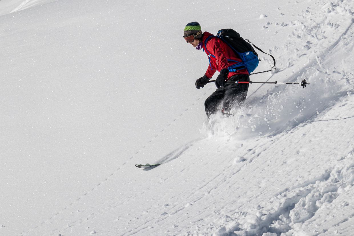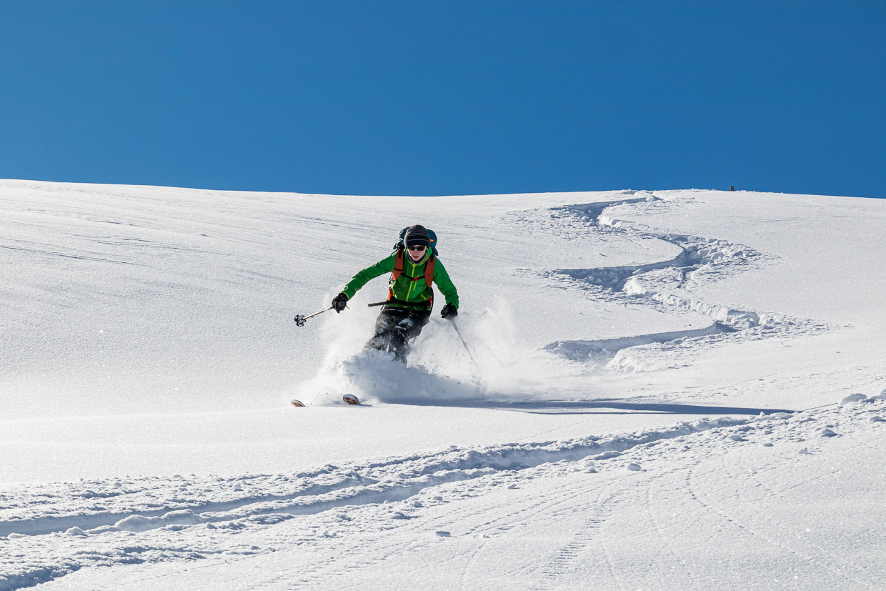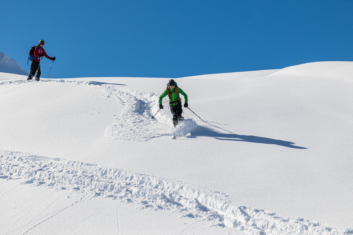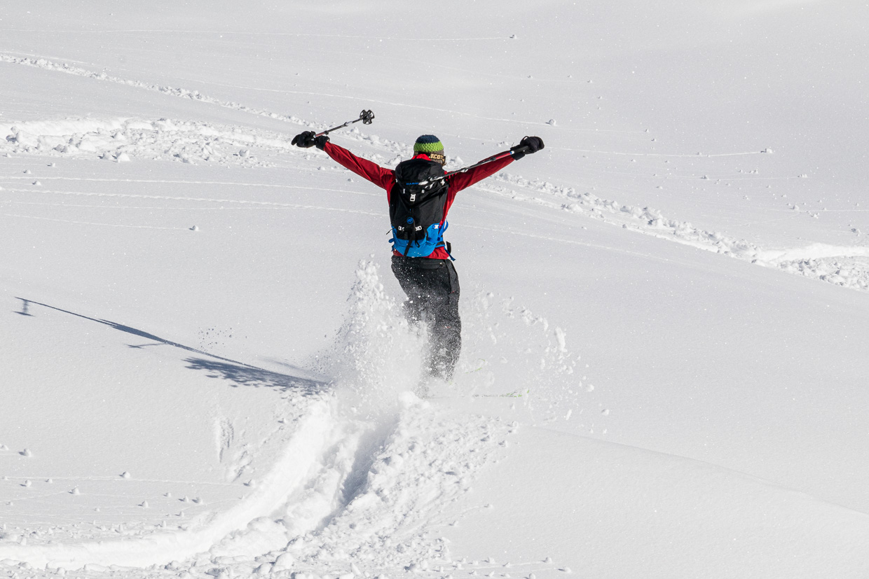 Nach einer Pause machen wir uns bereit für die Abfahrt, legen die Korridore fest, wo wir fahren dürfen. Der Pulverschnee stiebt nur so! Wir schweben die Hänge runter, zeichnen unsere Spuren in den Schnee, kreieren vergängliche Kunstwerke. Und das in der grossartigen Landschaft des Naturparkes Beverin. Bei den Fallätscher Hütten lockt eine Wechte Fabian, er springt in den jungfräulichen Pulverschnee. Weiter unten ist der Schnee schon etwas schwerer, leicht deckelig, aber es geht noch zum Fahren. „Das war die schönste Abfahrt, die ich gemacht habe“, meint das Geburtstagskind. Das passt doch als Geschenk.