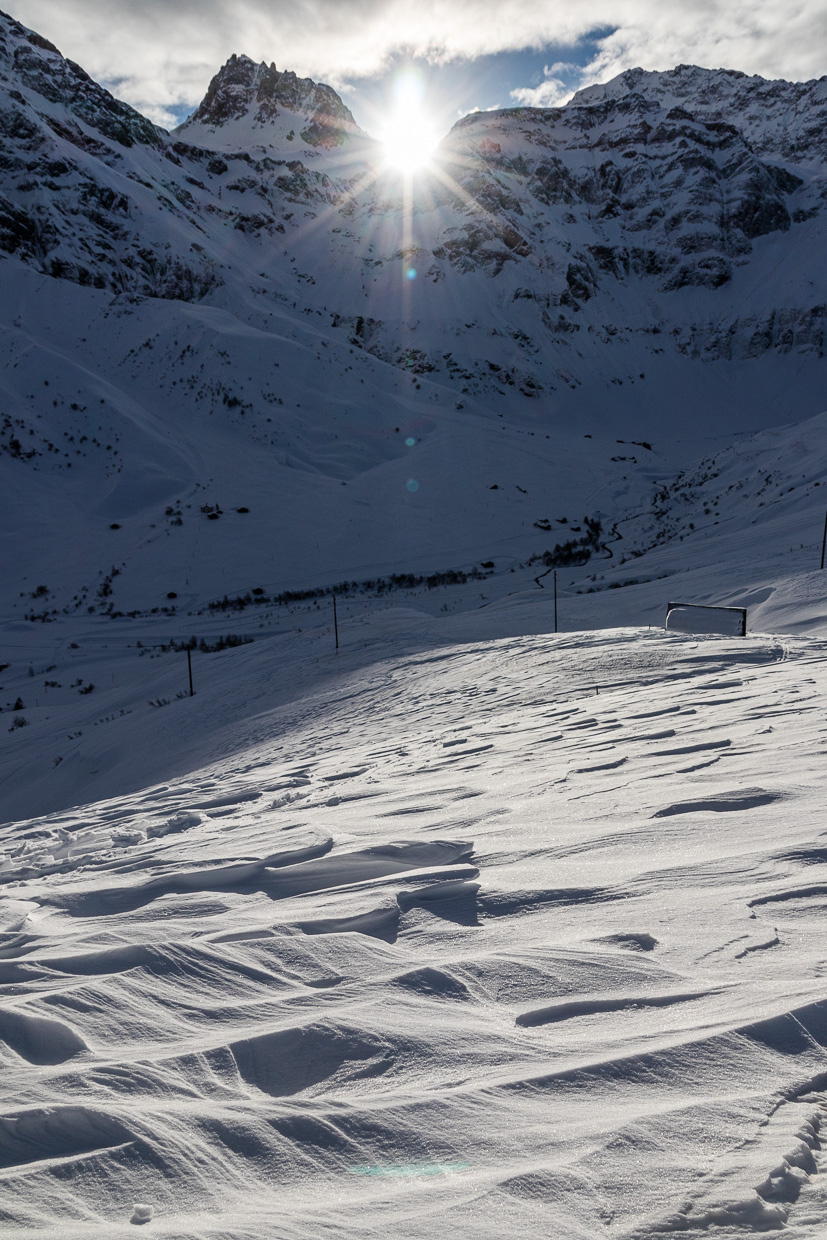 Der folgende Tag ist das pure Gegenteil: Blauer Himmel, der Pulverschnee lockt, obwohl es noch dunkel ist, als wir aus dem Fenster schauen. Wir gehen in den Frühstücksraum, dort prangt eine Girlande: „Happy Birthday“ ruft sie uns entgegen, denn Silvan hat heute Geburtstag. Was für aufmerksame Gastgeber!