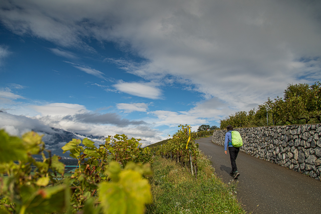 Sollte das Wetter mal nicht so toll sein, Villars in Nebel gehüllt, kann man mal probieren, ob es im Tal besser ist. Zum Beispiel auf der Schlechtwettertour um den Montet, durch Rebberge, Kastanienhaine und Wälder.