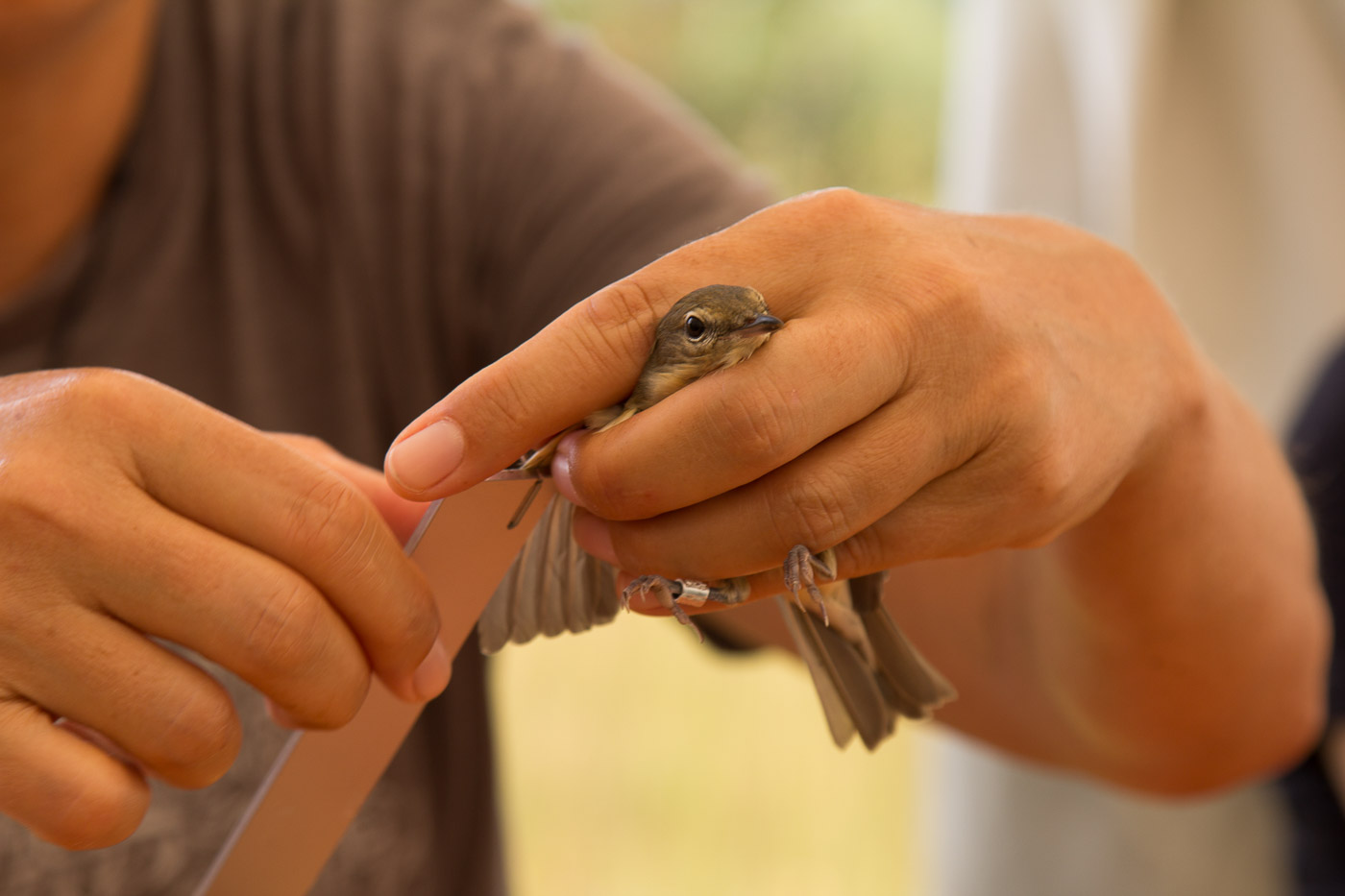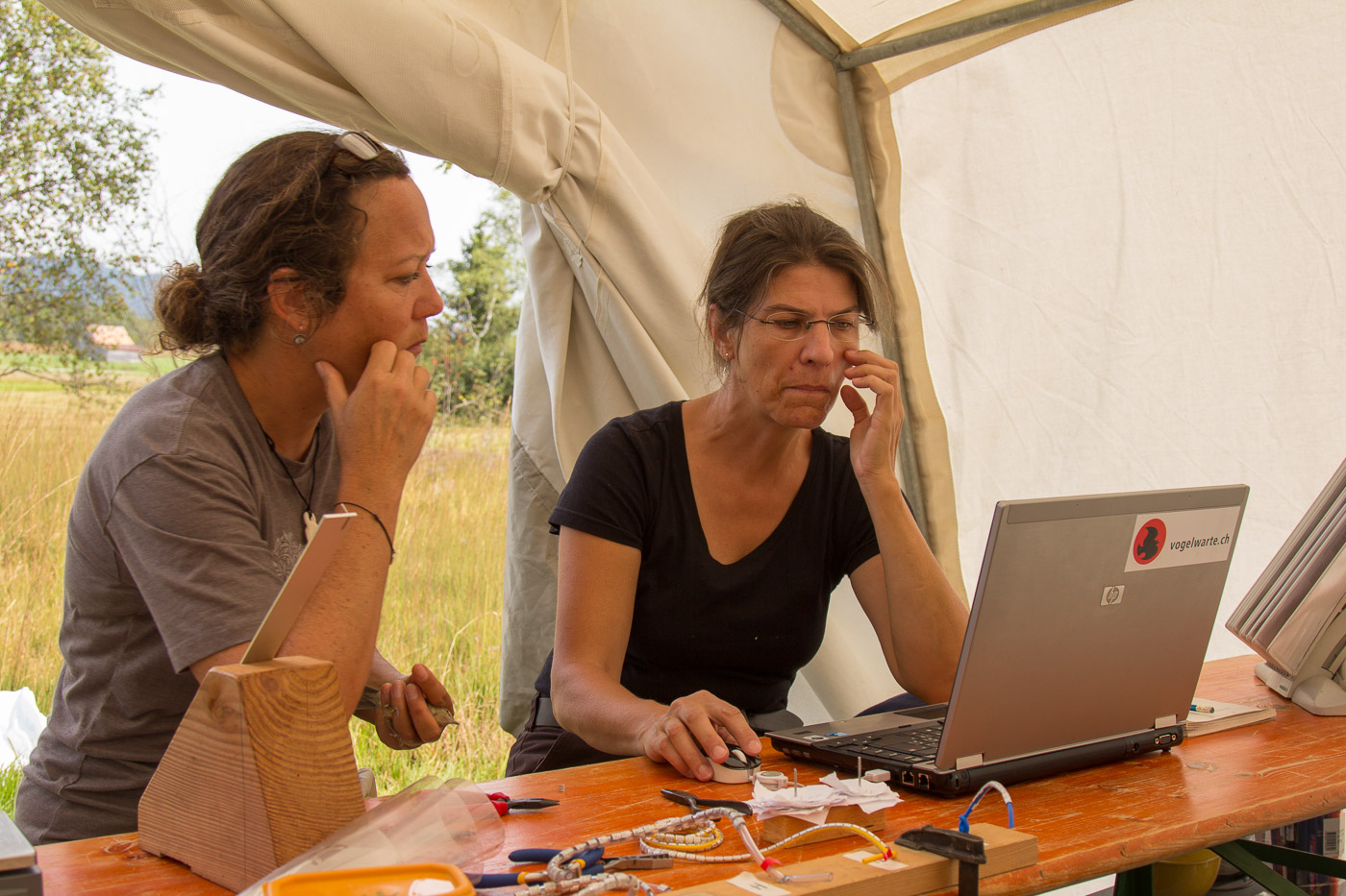 Zurück beim Zelt werden sie einen nach dem anderen „bearbeitet“: Zuerst wird die Art bestimmt (was noch das Einfachste ist), danach die anderen wichtigen Parameter ermittelt: Die Flügellänge, der Allgemeinzustand, der mit einem Code angegeben wird, das Gewicht. Dazu wird der Vogel in einen Papiertrichter gesteckt. Das sieht ein wenig brutal aus, aber so verhalten sie sich ruhig. Zu guter Letzt befestigen die Beringer den Ring vorsichtig, der mit dem Kürzel der Vogelwarte Sempach und einem Code versehen ist. All diese Daten werden in einer zentralen Datenbank erfasst. Diese Arbeit dürfen nur ausgebildete Fachleute durchführen, die dafür Kurse besuchen müssen. Die Beringungen werden während einer Woche durchgeführt, ehrenamtlich, manche „opfern“ dafür ihre Ferien.