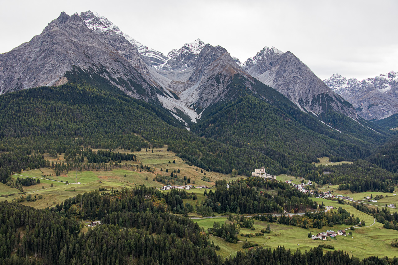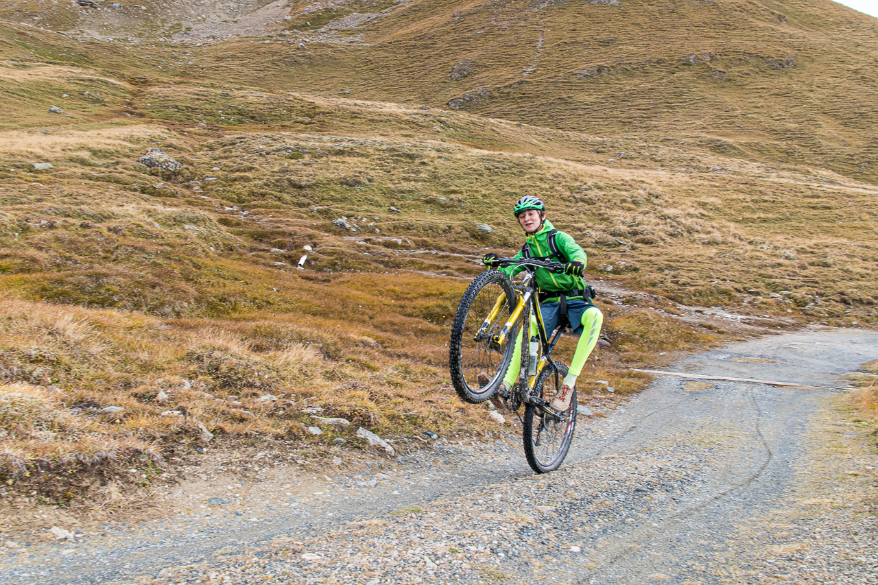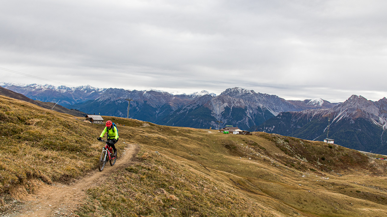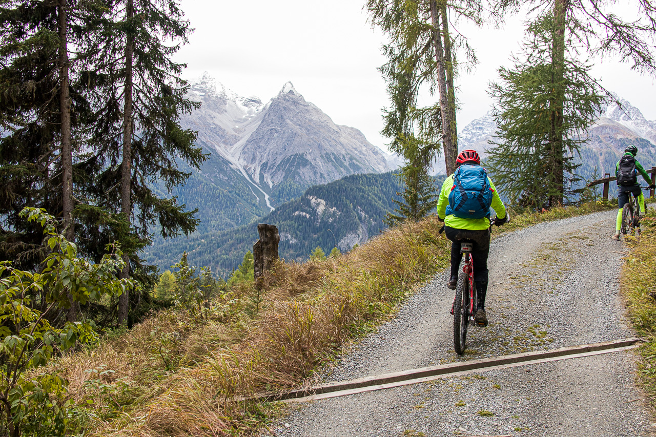 Es ist ziemlich kalt, die Gipfel sind frisch verschneit nach dem Regen des vergangenen Tages. Silvan, der heute nicht aufs Bike will, weil er schlecht geschlafen hat, kommt freudenstahlend vom Bahnhof zurück, er hat die Kamera wieder, die er tags zuvor am Bahnhof Susch vergessen hat. Er macht sich nun einen ruhigen Tag, während wir mit der Gondelbahn nach Motta Naluns fahren, wo die Runde beginnt. Jedoch geht es nicht gleich abwärts, sondern zuerst aufwärts, und zwar ziemlich steil. Es hat viel Verkehr, man wähnt sich im Dorf selber. Ständig fährt ein Auto vorbei, obwohl wir uns hier eigentlich mitten im Skigebiet bewegen. Es ist kalt, die Sonne, die sich am Morgen noch gezeigt hat, ist wieder hinter den Wolken verschwunden. Zum Glück gibt es ein Restaurant unterwegs, wo wir uns aufwärmen. Von dort hätte man eine tolle Aussicht, wenn das Wetter besser wäre.