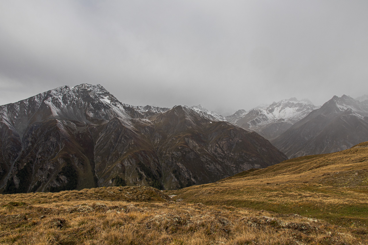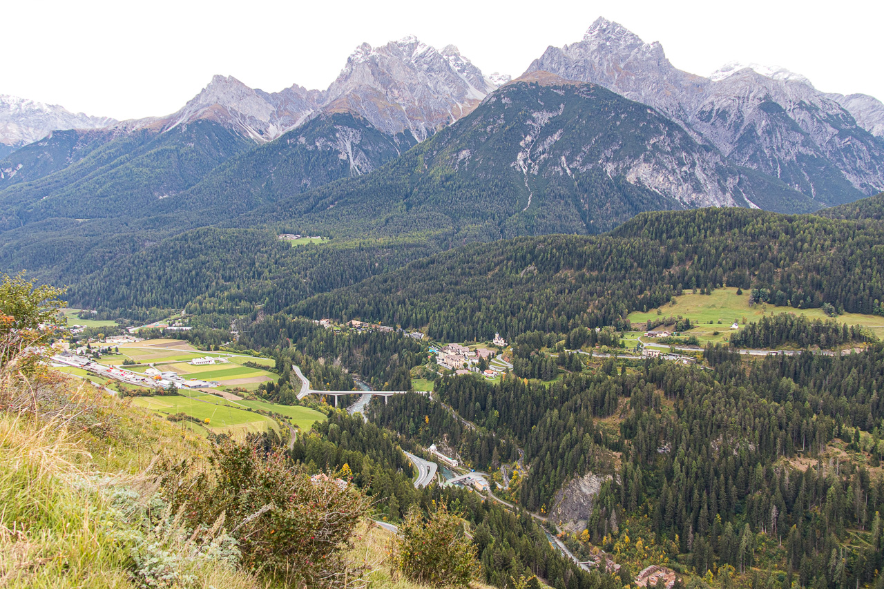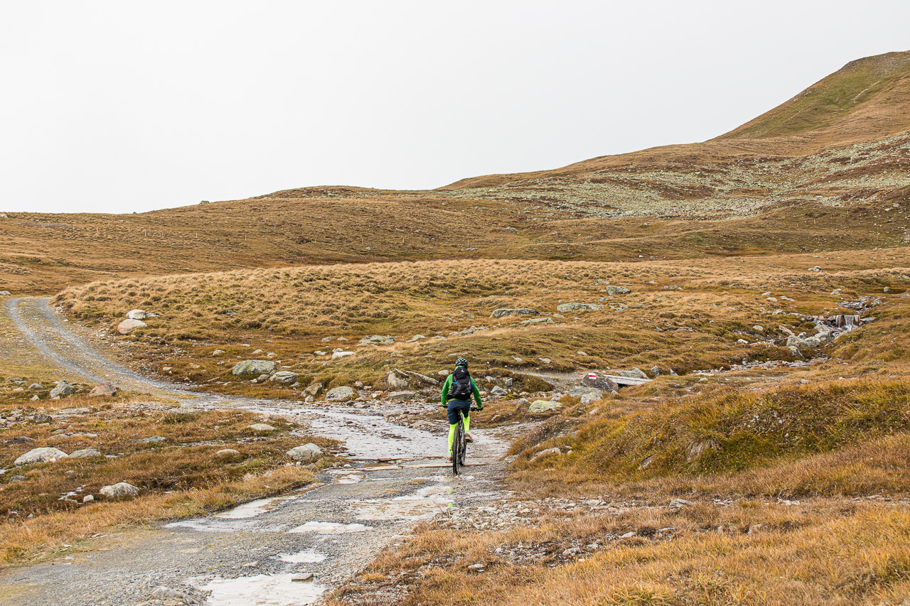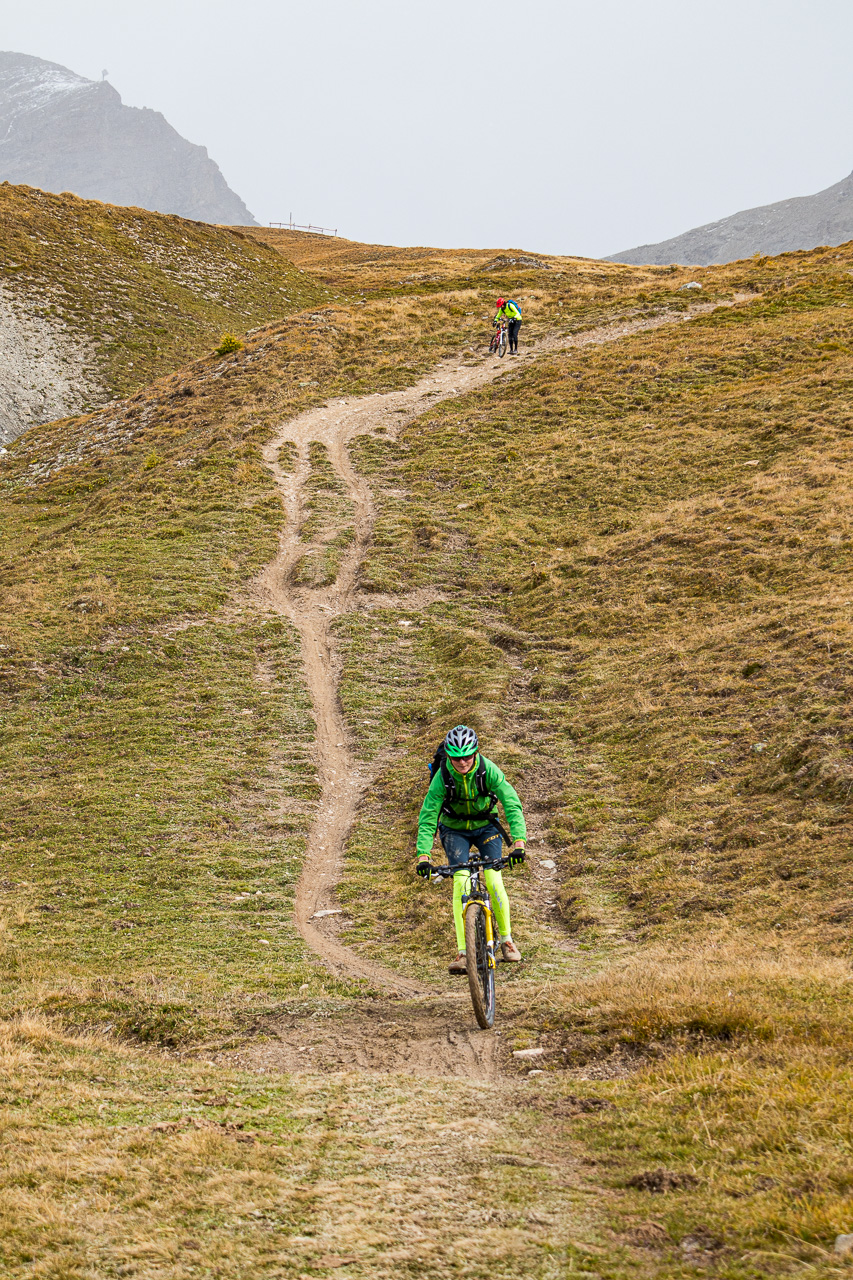Es ist ziemlich kalt, die Gipfel sind frisch verschneit nach dem Regen des vergangenen Tages. Silvan, der heute nicht aufs Bike will, weil er schlecht geschlafen hat, kommt freudenstahlend vom Bahnhof zurück, er hat die Kamera wieder, die er tags zuvor am Bahnhof Susch vergessen hat. Er macht sich nun einen ruhigen Tag, während wir mit der Gondelbahn nach Motta Naluns fahren, wo die Runde beginnt. Jedoch geht es nicht gleich abwärts, sondern zuerst aufwärts, und zwar ziemlich steil. Es hat viel Verkehr, man wähnt sich im Dorf selber. Ständig fährt ein Auto vorbei, obwohl wir uns hier eigentlich mitten im Skigebiet bewegen. Es ist kalt, die Sonne, die sich am Morgen noch gezeigt hat, ist wieder hinter den Wolken verschwunden. Zum Glück gibt es ein Restaurant unterwegs, wo wir uns aufwärmen. Von dort hätte man eine tolle Aussicht, wenn das Wetter besser wäre.