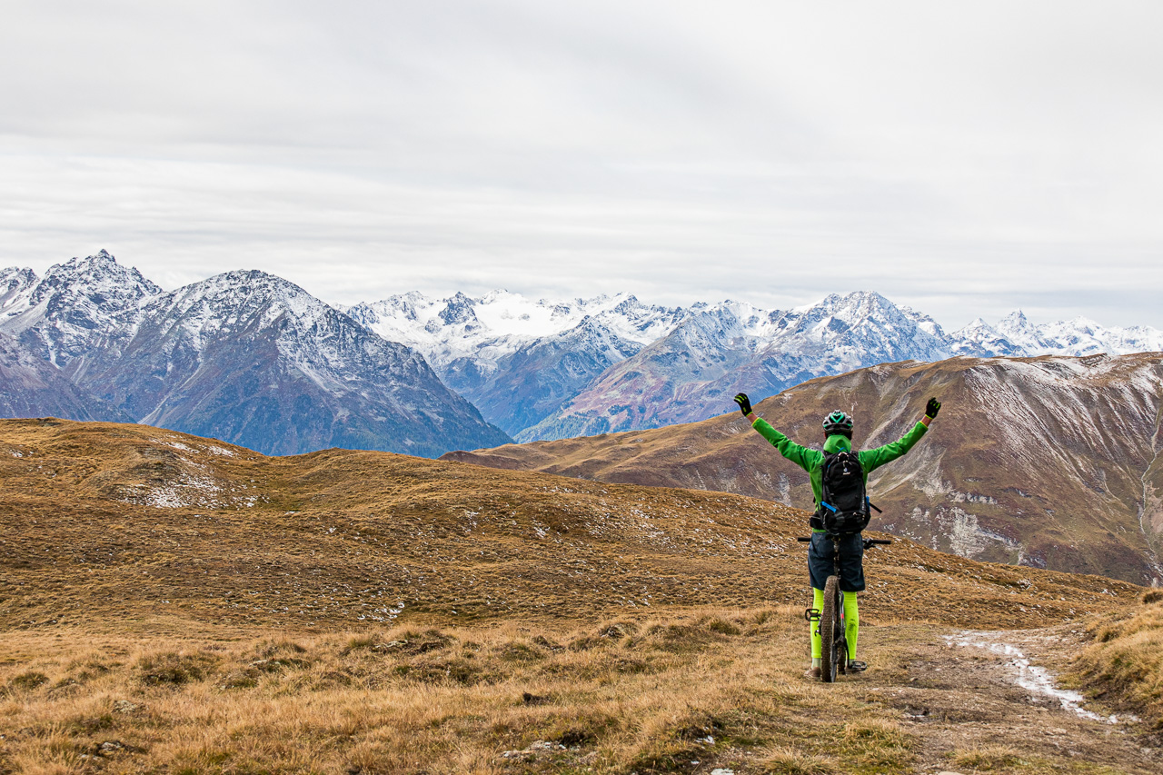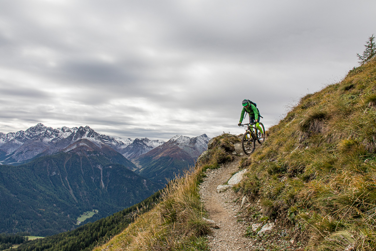 Bei der Vorbereitung für die Ferien habe ich die anderen aufgefordert, Vorschläge zu bringen. Fabian wollte natürlich Trails runterjagen, zum Beispiel im Skigebiet Motta Naluns. Seinen Vorschlag setzten wir um, da konnte uns weder die Kälte noch zeitweiser Schneefall stoppen, wir hatten die volle Bikeaction bei Motta Naluns.