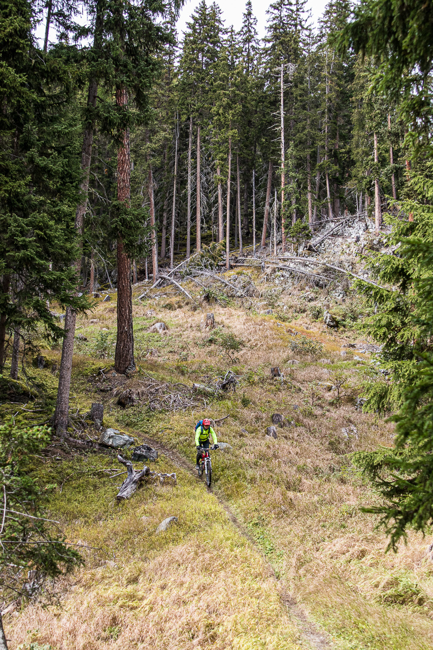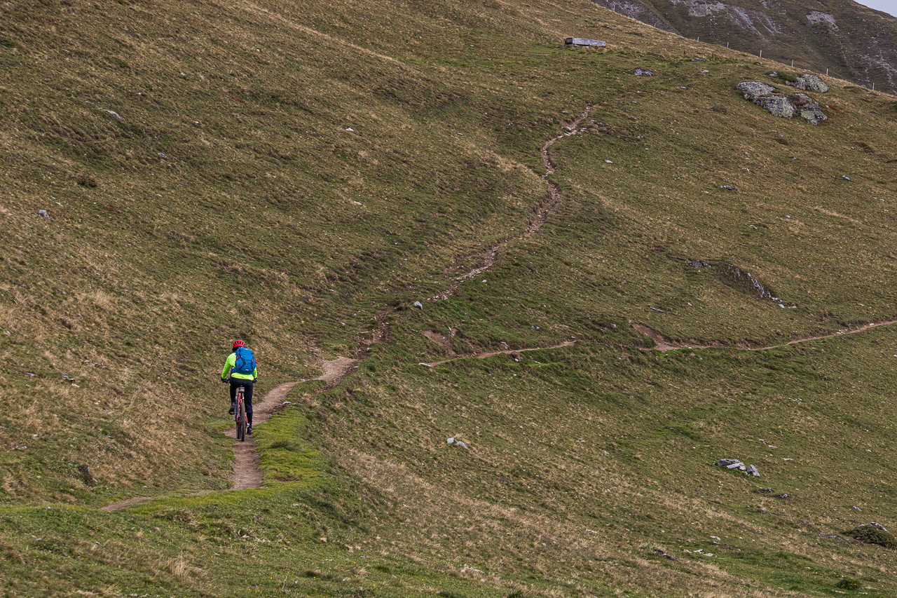 Um die Aussicht zu geniessen, müssen wir jeweils anhalten, aber es lohnt sich. Wir erblicken die Fuorcla Val dal Botsch, es hat weniger Schnee als am Vortag, als wir dort hochstiegen. Auf der Alp Laret ist eine erste Pause fällig, wir essen und lassen den Blick über das Tal und die Berge schweifen. Bis jetzt war der Trail nicht schwierig, finden wir. In der Beschreibung stand etwas von verblockt, davon haben wir nichts mitbekommen. Bei der Weiterfahrt stellen wir fest, dass dieser Teil erst jetzt kommt. Wir müssen uns konzentrieren, enge Passagen zwingen uns immer wieder zum Absteigen. Plötzlich kippt die Frau hangabwärts in die Steine, ich kriege einen Schreck! Sie rappelt sich aber wieder auf, es ist zum Glück nichts Schlimmes passiert.