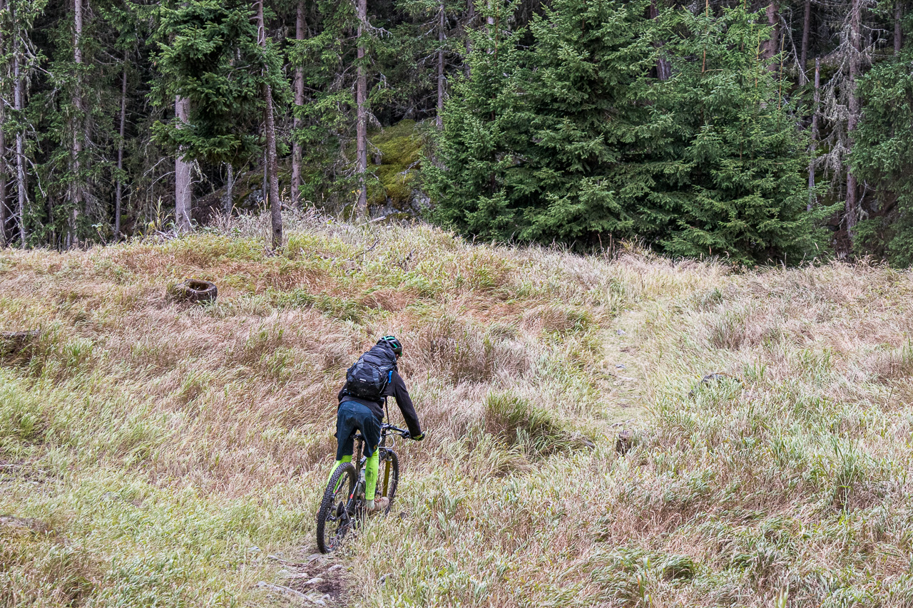 Zur Erholung folgt danach wieder eine Strasse, bevor es in den nächsten Singletrail geht, den aber nur Fabian und ich fahren, die Frau hat langsam genug. Dabei verpasst sie wirklich etwas! Der Trail ist total flowig, wir nehmen Anlieger um Anlieger, schlängeln uns nach unten. Was für ein Spass! Weiter fahren wir wieder zu dritt, es folgt nochmals ein kurzer Aufstieg. Und dann führt da der Trail mitten durch die Waldwiese, den man ohne GPS oder Ortskenntnis nicht finden würde. Nach der Wiese folgen wieder Wurzeln, steile Abfahrten, alles, was das Bikerherz begehrt.