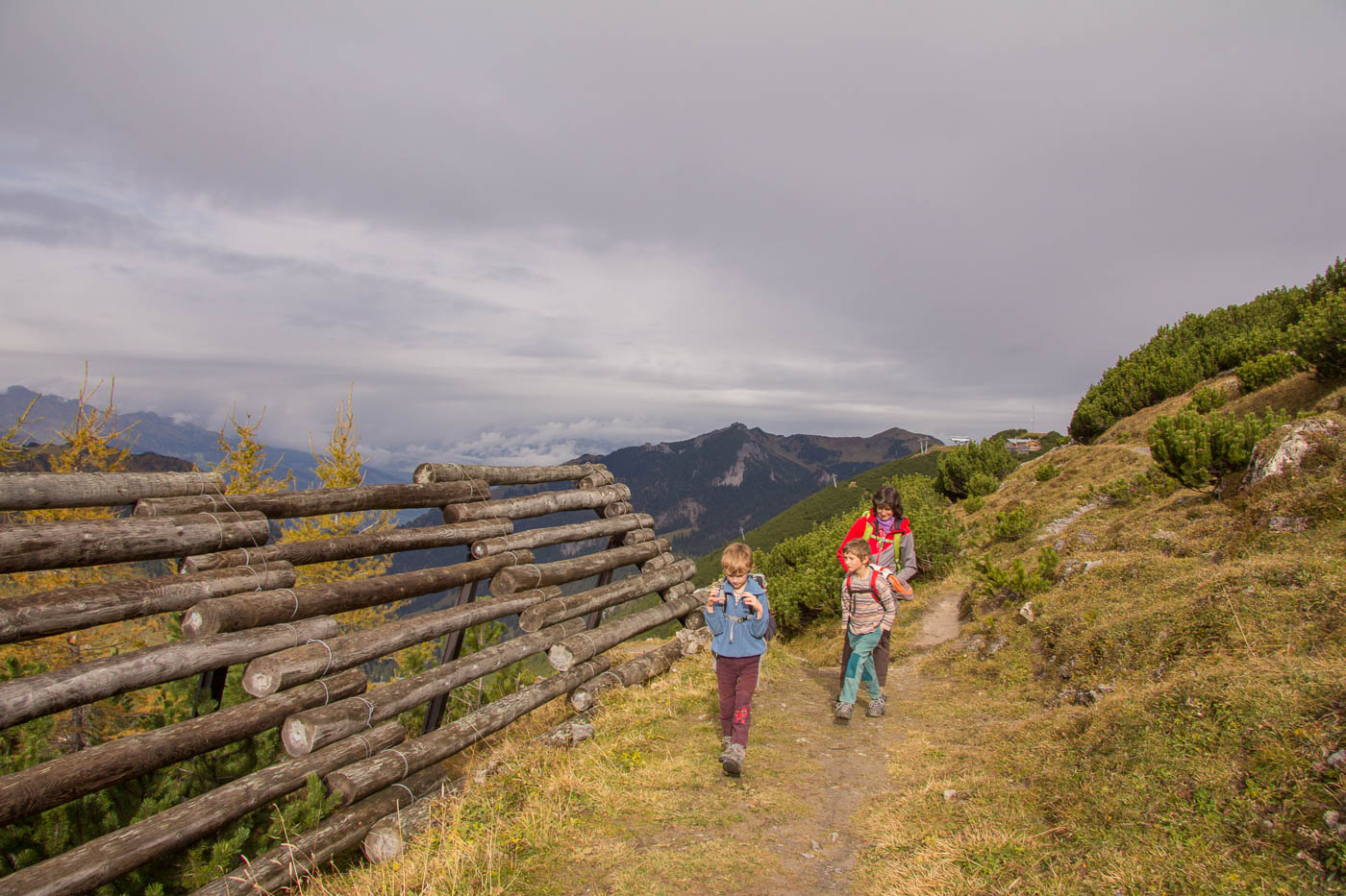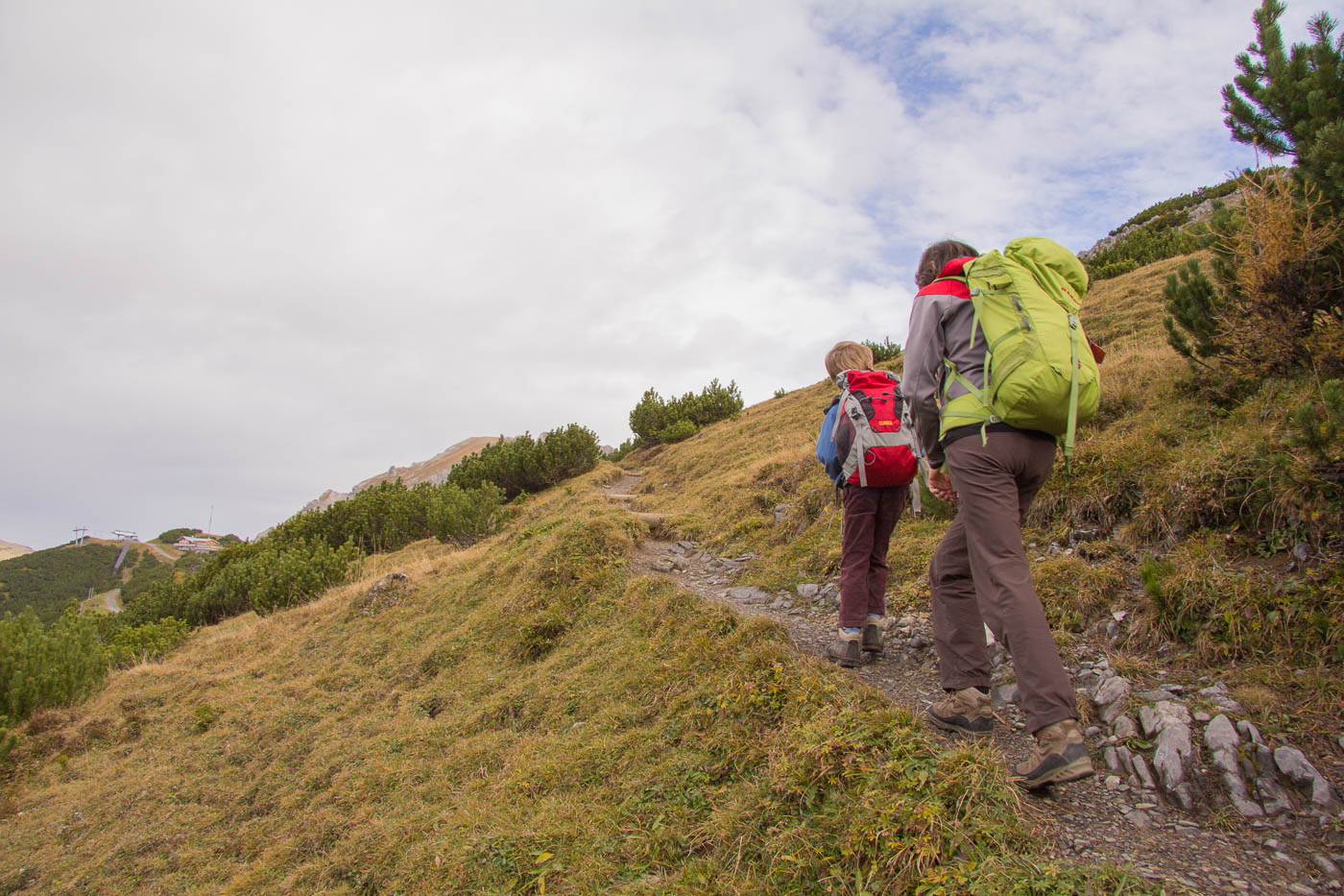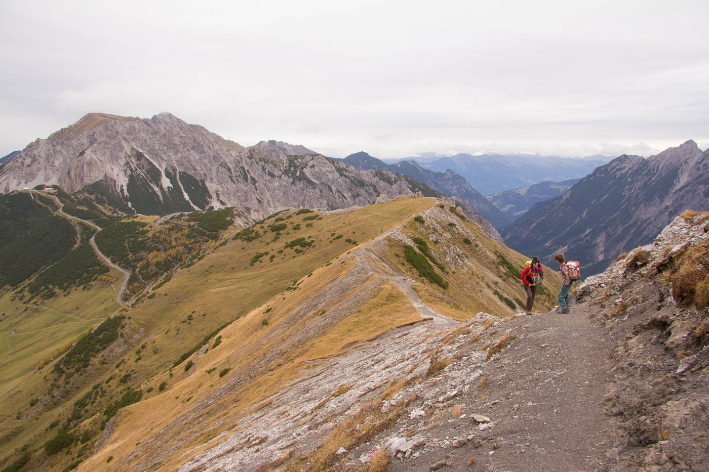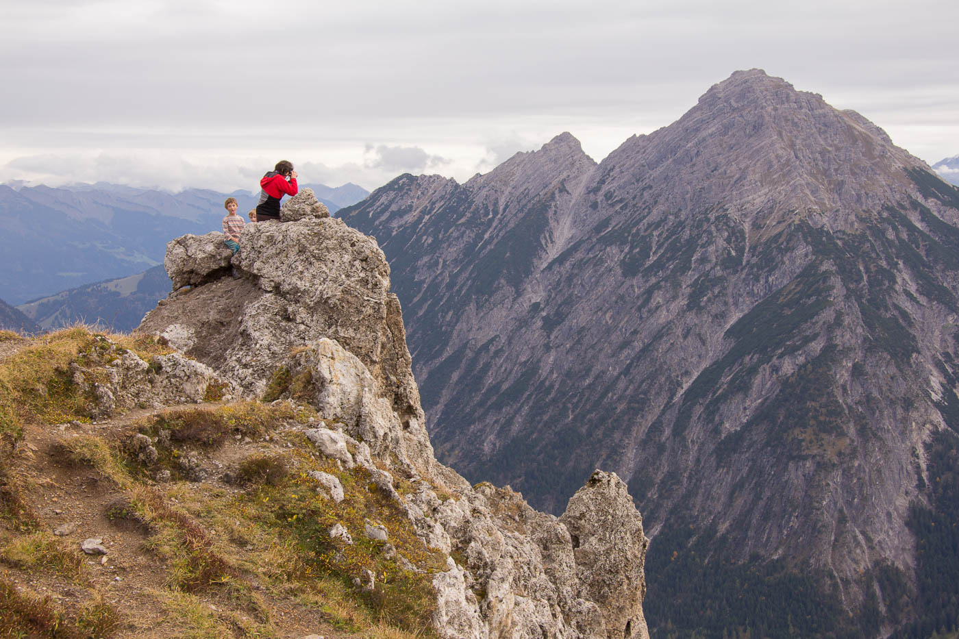 Am nächsten Morgen starteten wir Richtung Augstenberg, die Wetterzeichen sahen (noch) nicht allzu schlecht aus. Der Weg führte zuerst über Alpweiden, dann durch Bergföhrenwald und Lawinenverbauungen. Bergföhren unterscheiden sich von Arven dadurch, dass zwei Nadeln zusammen dem Ast entwachsen, bei der Arve sind es fünf. Später, auf dem Grat, wurde es aber immer dunkler. Im Rheintal zog eine Regenfront auf. Wir planten kurz um und bestiegen den Spitz, der quasi am Weg liegt, damit wir trotzdem noch einen Gipfel gemacht haben.
