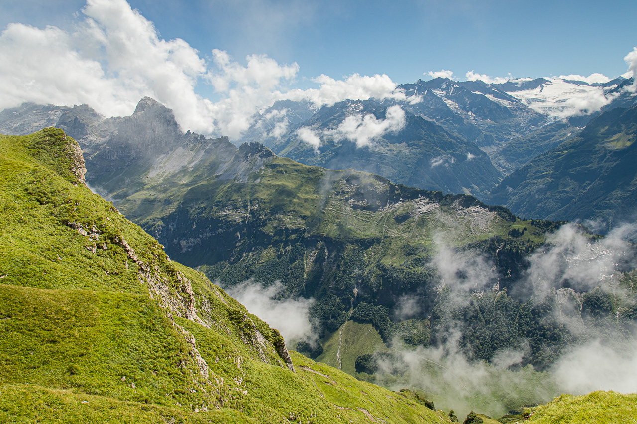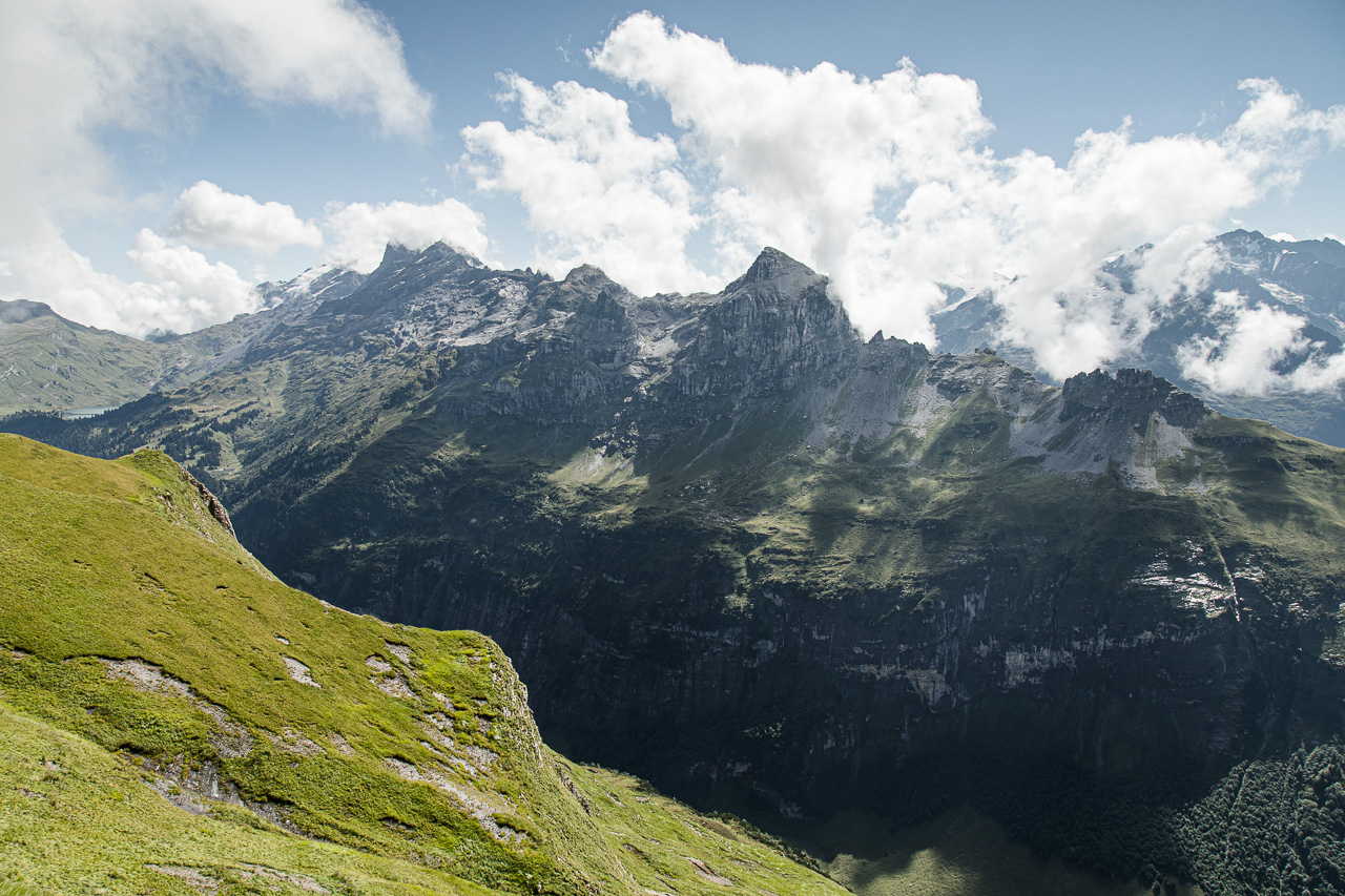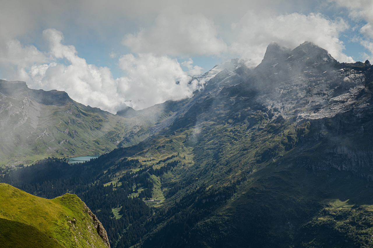 Wir steigen ein Tälchen hoch unter dem Skilift durch. Bald erblicken wir auch den Tannsee. Nach einem kurzen Halt erreichen wir die Bergstation des Skiliftes. Von dort sind es nur noch ein paar Meter aufs Balmeregghorn, wor wir von der Innerschweiz ins Berner Oberland übertreten. Eine Gruppe, dem Anschein nach ein Turnverein, besetzt diesen schon, aber es hat genug Platz für alle. Wir bewundern die Aussicht, im Osten sehen wir den Jochpass, wo es nach Engelberg geht, südöstlich erheben sich die wolkenumschwärmten Gadmer Dolomiten mit dem Tällistock und den Wendenstöcken, weiter hinten der markante Titlis. Im Süden stehen die schnee- und gletscherbedeckten Gipfel des Berner Oberlandes. Und von unserem Gipfel schlängelt der Weg dem Hang entlang, dem wir nun folgen werden.