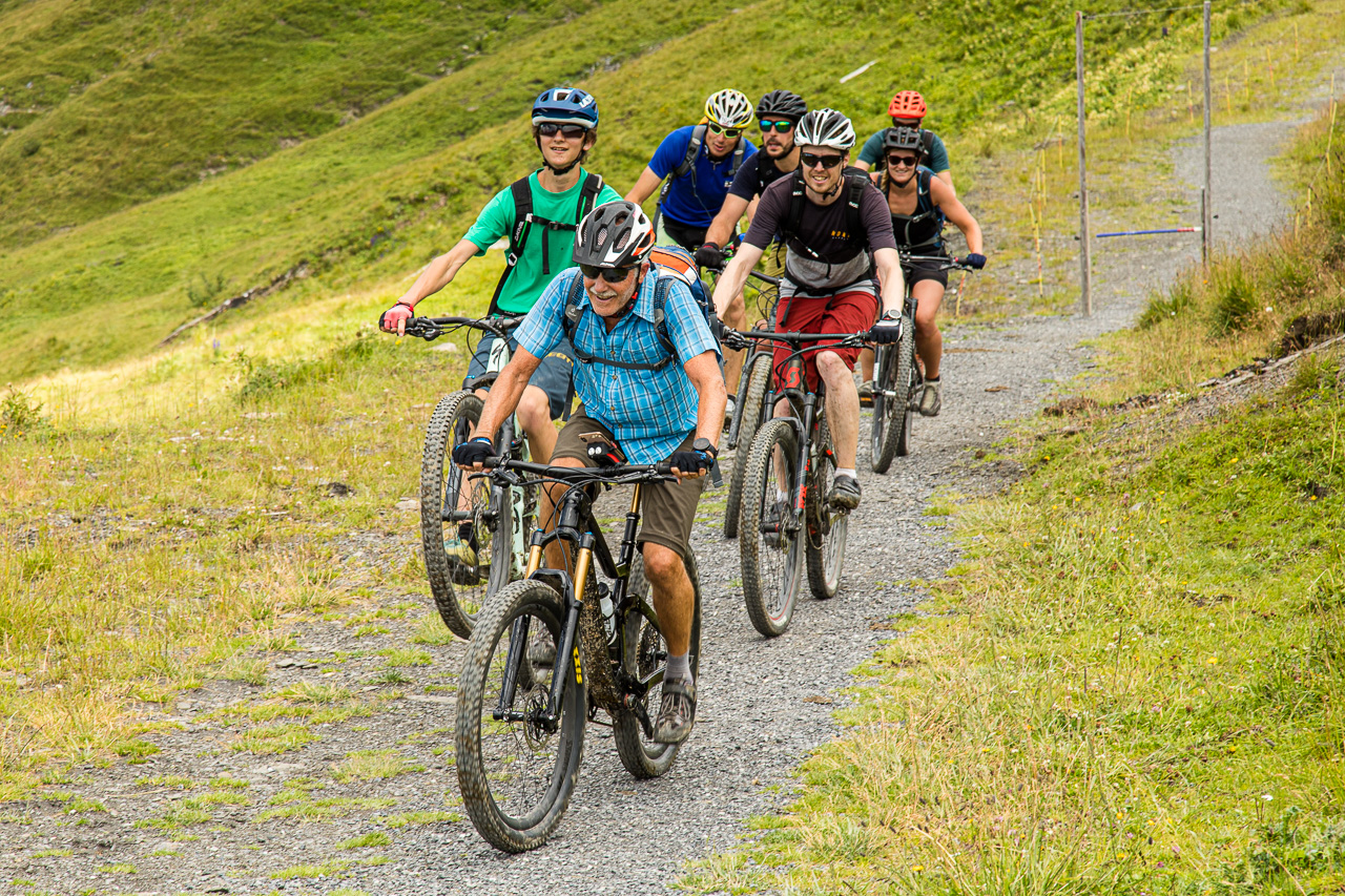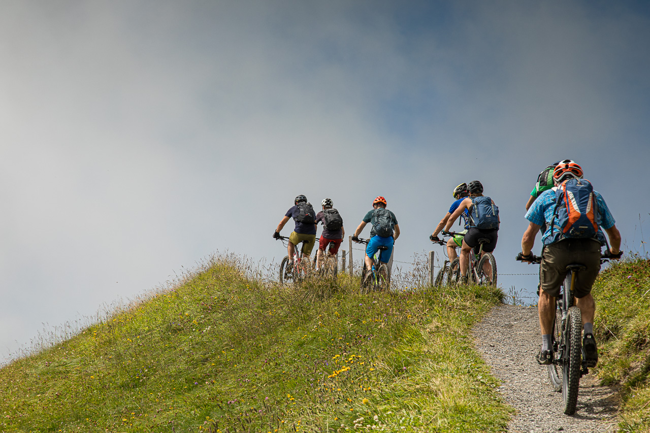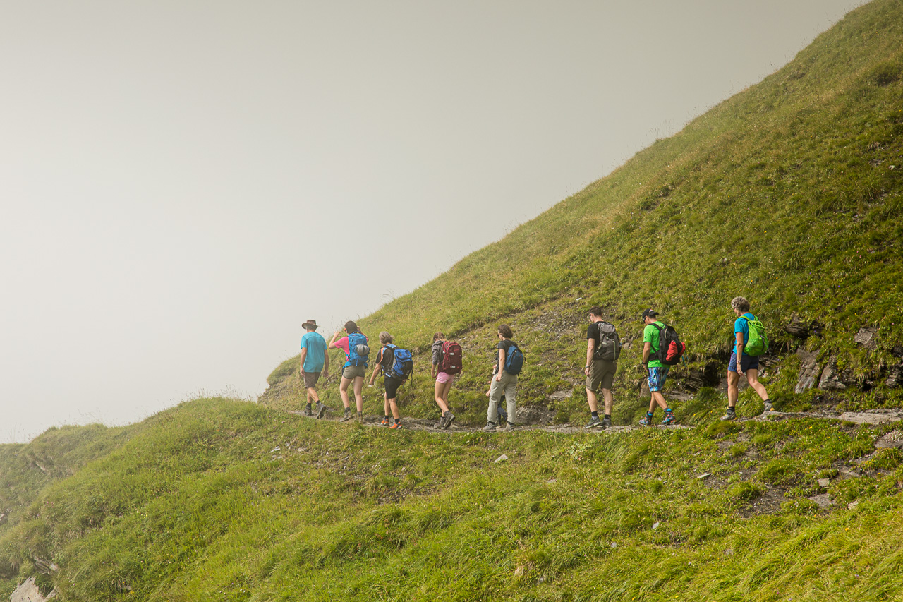 Der Weg sieht vom Gipfel eindrücklich aus, linkerhand scheint es ziemlich schnell ziemlich steil zu werden. Zum Glück habe ich berggängige Leute dabei. Doch es zeigt sich schnell, dass die Sache nur halb so wild ist. Trotzdem mahnt uns der vorbeifliegende Rega-Helikopter zur Vorsicht, wir wollen nicht Kunde werden. Der Nebel wird dichter, reisst dann wieder auf, spielt mit uns. Manchmal sehen wir die anderen Berge, eindrücklich die Szenerie. Rechts von uns wird es flacher, das bedeutet, dass wir uns der Planplatten, unserem Ziel, nähern. Tatsächlich es reisst für einen Moment auf, wir blicken auf den Brienzersee und den Kessel des Skigebietes Hasliberg. Und da unten auf der Strasse das sind doch… genau, unsere Bikergruppe mit Fabian, die bei der Käserstatt gestartet ist.