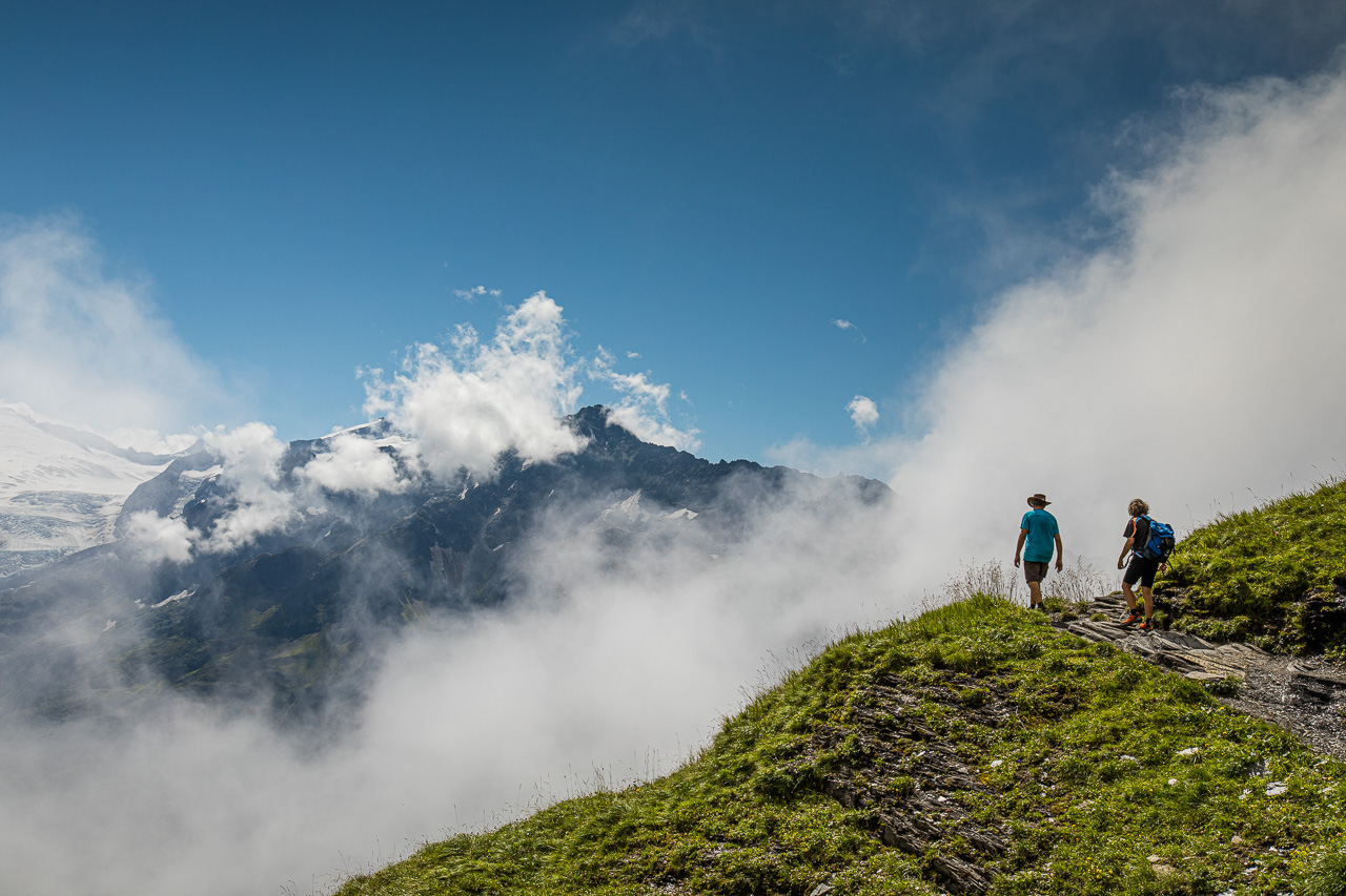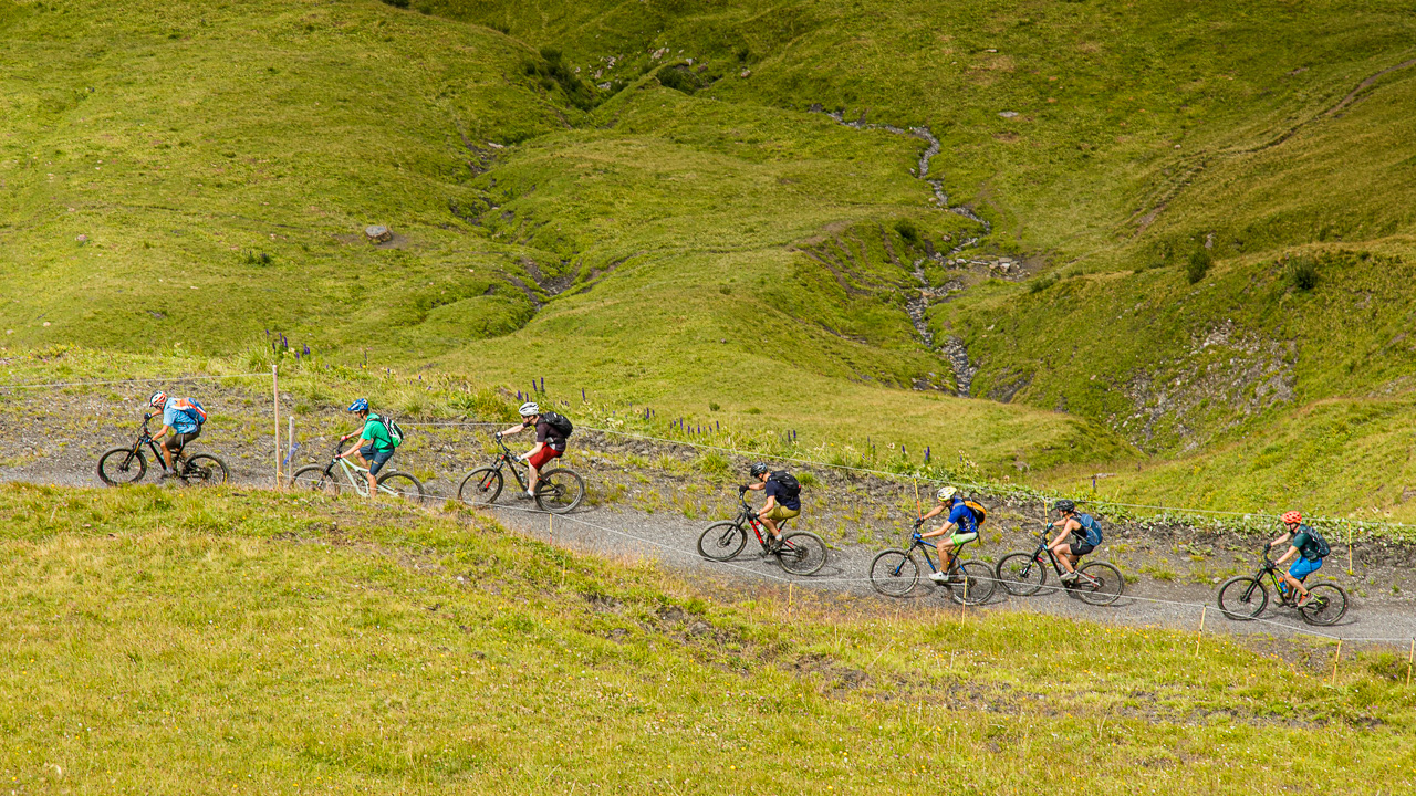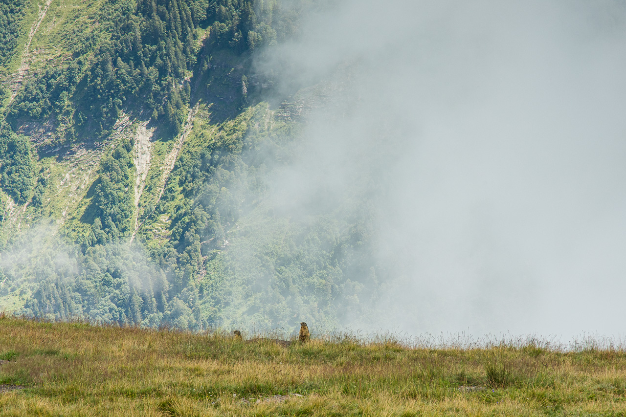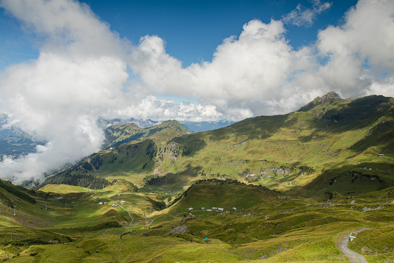Der Weg sieht vom Gipfel eindrücklich aus, linkerhand scheint es ziemlich schnell ziemlich steil zu werden. Zum Glück habe ich berggängige Leute dabei. Doch es zeigt sich schnell, dass die Sache nur halb so wild ist. Trotzdem mahnt uns der vorbeifliegende Rega-Helikopter zur Vorsicht, wir wollen nicht Kunde werden. Der Nebel wird dichter, reisst dann wieder auf, spielt mit uns. Manchmal sehen wir die anderen Berge, eindrücklich die Szenerie. Rechts von uns wird es flacher, das bedeutet, dass wir uns der Planplatten, unserem Ziel, nähern. Tatsächlich es reisst für einen Moment auf, wir blicken auf den Brienzersee und den Kessel des Skigebietes Hasliberg. Und da unten auf der Strasse das sind doch… genau, unsere Bikergruppe mit Fabian, die bei der Käserstatt gestartet ist.
