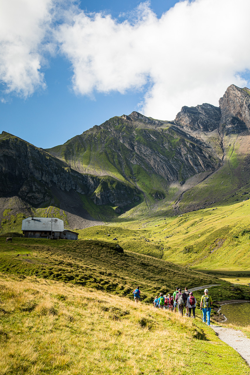 Weit gefehlt. 19 Personen begrüsse ich auf der Melchsee-Frutt, so eine grosse Gruppe hatte ich noch nie geleitet! Die Senioren, die dabei sind, lächeln nur milde. Sie sind manchmal 30, 40 oder noch mehr Personen! Nun denn, wir starten also, der Jüngste sechs Jahre alt, der Älteste über 70, eine interessante Gruppe. Aber ich kannte alle und wusste, dass das geht. Wir steigen ab zum Melchsee, umrunden den halb. Und genau beim Skilift Balmeregghorn müssen wir abzweigen, aber irgendwie erwischen wir doch nicht die richtige Abbiegung. Es ist nicht ganz einfach, eine Gruppe zu führen und gleichzeitig zu fotografieren. Meine Frau hat sich eigentlich bereit erklärt, auf die hintersten zu schauen, nun finde ich mich am Schluss und sie zuvorderst. Wir bemerken aber den Irrtum und steigen über die Weide hoch ohne schlechtes Gewissen, denn die Kühe haben hier wesentlich mehr zertrampelt als wir es je täten.