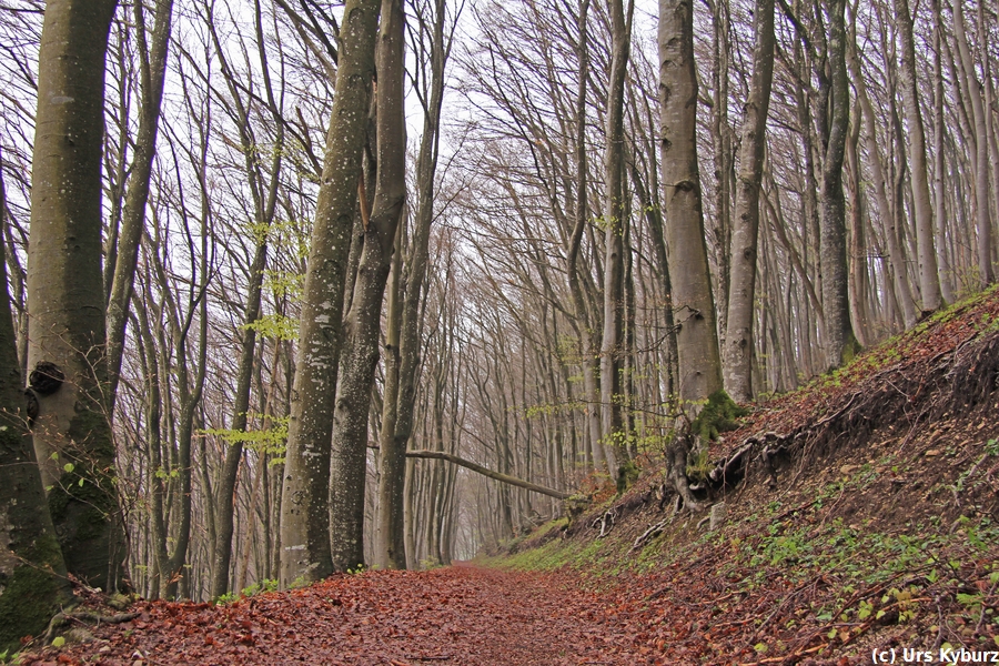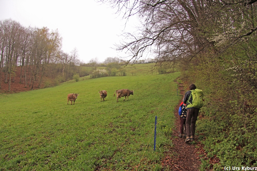 Auf einer Weide grasen Kühe mit Hörnern, was heute eine grosse Ausnahme ist. Die Erklärung erhalten wir beim Herzberghof, der biologisch-dynamisch nach den Vorschriften von Demeter bewirtschaftet wird. Nach diesen dürfen Kühe nicht enthornt werden. Wir wandern weiter durch einen Wald. Wie Säulen stehen die Buchen, zusammen mit dem Nebel umgibt uns eine magische Stimmung. Schon haben wir das Bänkerjoch erreicht. Eine grosszügige Grillstelle würde zu einer Rast einladen, aber erstens ist es noch zu früh für das Mittagessen und zweitens sind die Temperaturen nicht gerade so, dass man länger sitzen möchte. Dafür haken wir noch den zweiten Geocache ab, der hier in der Umgebung versteckt ist.