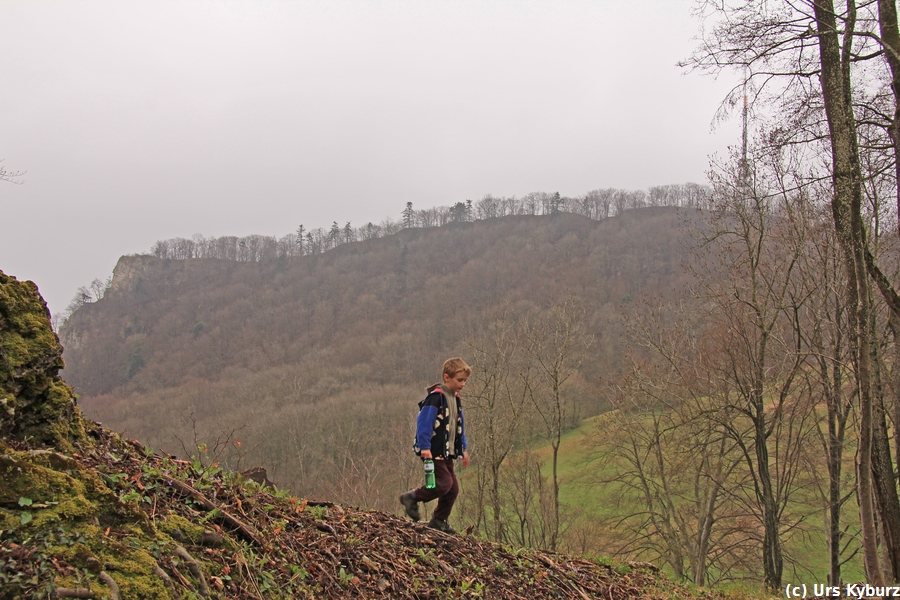Während wir uns stärken, bewundern wir die Aussicht. Wir sähen den halben Alpenbogen von den Berner bis zu den Appenzeller Alpen, das Mittelland Richtung Innerschweiz und Zürich, das Fricktal, den Schwarzwald und die Vogesen. In der Realität lässt uns der Nebel nur bis Aarau schauen, trotzdem geniessen wir die Vogelperspektive, die wir von hier oben haben.