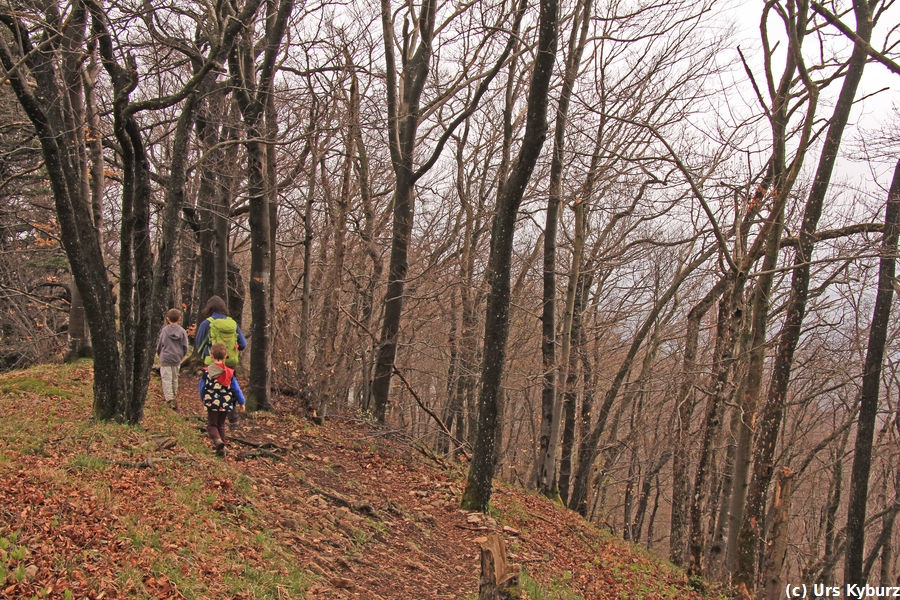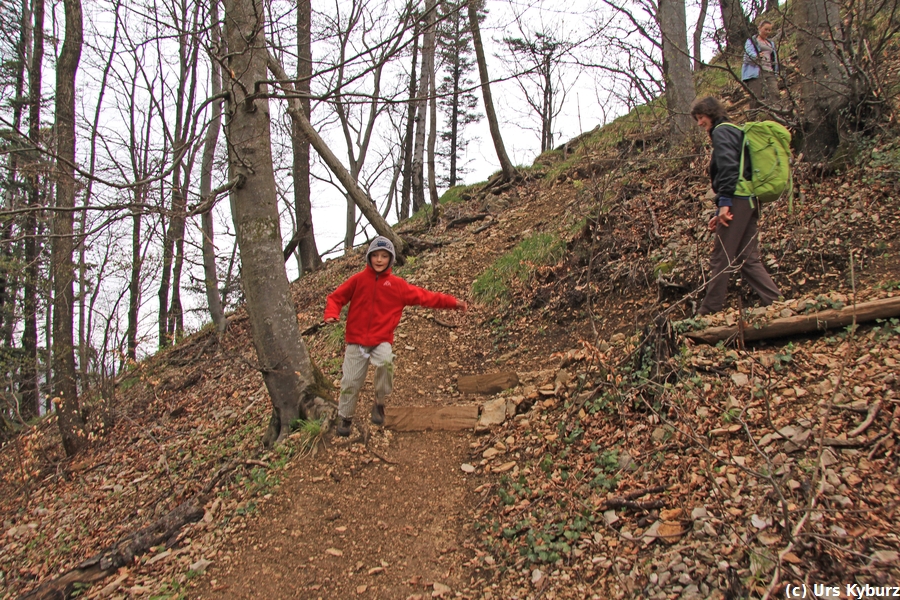 Fabian erhält von der Mutter Erklärungen zur Kartenkunde. Wo sind wir? Wo gehen wir durch? Wo ist das Ziel? Mit diesem Wissen brechen wir auf und wandern auf dem Grat wieder zurück, folgen diesem aber weiter statt wieder nach rechts abzubiegen. Der Weg wird breiter, die Blumen spriessen überall aus dem Waldboden, damit sie noch genügend Licht haben, bevor die Bäume dieses mit ihrem Laub wieder abschirmen. Alle Arten von Vögel zwitschern, da und dort huscht ein Mäuschen vorbei. Allmählich nähern wir uns dem Ziel, doch vorher holen wir noch den letzten Cache dieser Tour.