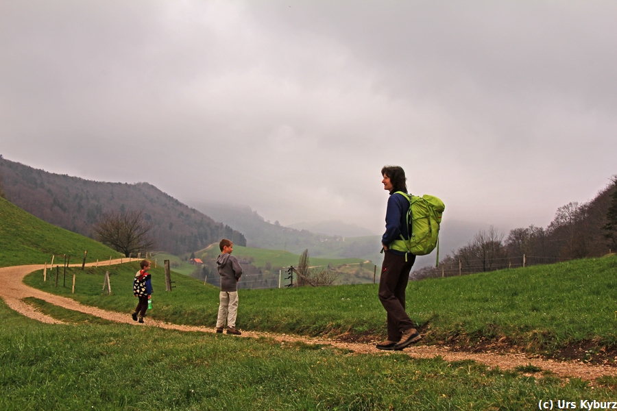 Bei nebligem Wetter entsteigen wir auf der Passhöhe der Staffelegg dem Bus, der uns von Aarau hierher gebracht hat. Da uns noch ein Geocache erwartet, folgen wir nicht dem Wanderwegweiser, sondern nehmen die Strasse weiter unten Richtung Aarau. Bald treffen diese beiden Wege aber wieder aufeinander. Auch den Asphalt haben wir bald hinter uns.