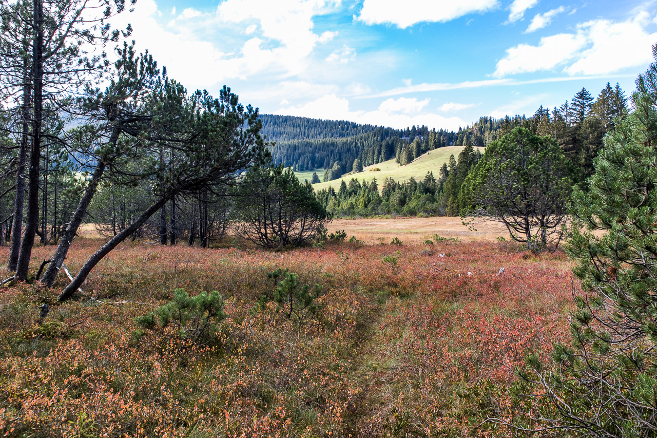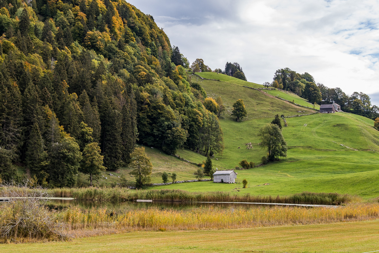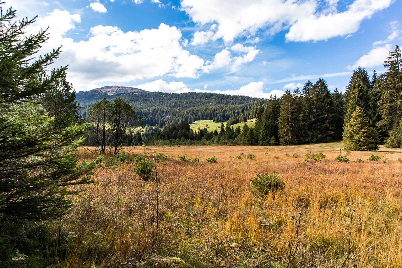 Bei Brand legen wir die Mittagspause ein. Silvan beschliesst, dass er nicht mehr mag (oder keine Lust hat), nochmals 600 Höhenmeter hochzutreten. So trennen wir uns also, Silvan fährt mit der Mutter auf der Thurroute zurück nach Wildhaus, ich fordere nun Fabian. Wir fahren zuerst ein Stück abwärts, dann geht es nur noch hoch, aber in einer angenehmen Steigung. Ab und zu halten wir kurz an, eine richtige Pause machen wir nicht mehr. Unglaublich, wie der Junge Power hat! Bald werde ich ihm nicht mehr folgen können. Höher und höher kurbeln wir, geniessen zwischendurch die Aussicht. Beim Turbenriet halten wir kurz an, das Moor zeigt sich in herbstlicher Farbe, was ich begeistert zur Kenntnis nehme. Ab hier ist es nicht mehr weit bis zum höchsten Punkt auf der Ölbergalp.