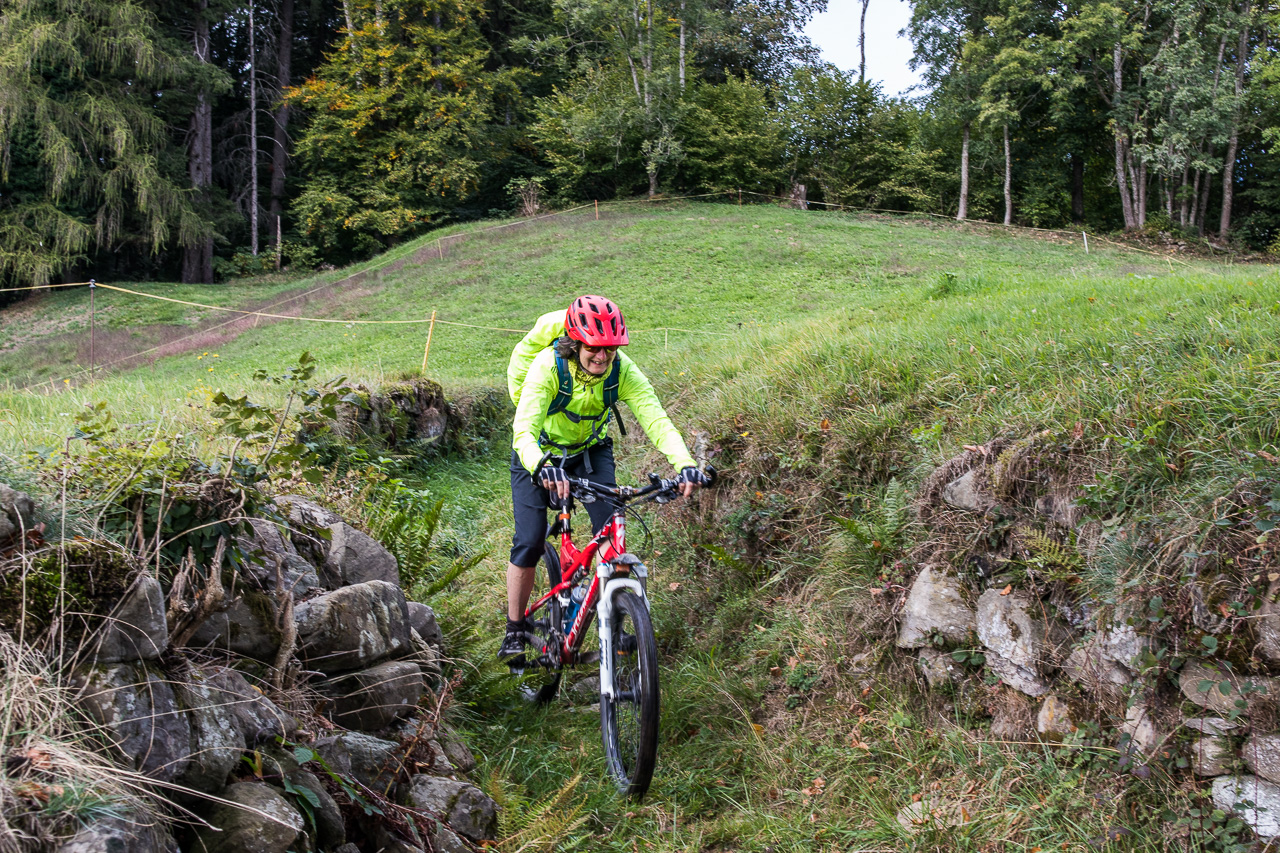 Aber nun ja, es hat meistens einen Grund, warum ein Weg weder als Wanderweg noch als Bikeroute markiert ist. Hier stellen wir auch bald mal fest, warum. Der Weg ist links und rechts von Steinmauern gesäumt. Schlimm sind aber die Brennnesseln, die in den Weg ragen, und die von Gras überwachsenen Steine, die mich zu einem (folgenlosen) Lenkerabgang bewegen. Für die Frau fängt der Horror aber erst nach diesem Trail an, denn der Weg, den wir auf der Karte gesehen haben, führt mitten durch eine Kuhweide. Die Tiere sind aber weit weg und interessieren sich nicht für uns, so dass wir den Wald sicher erreichen. Kurz danach sind wir wieder auf der Route.
