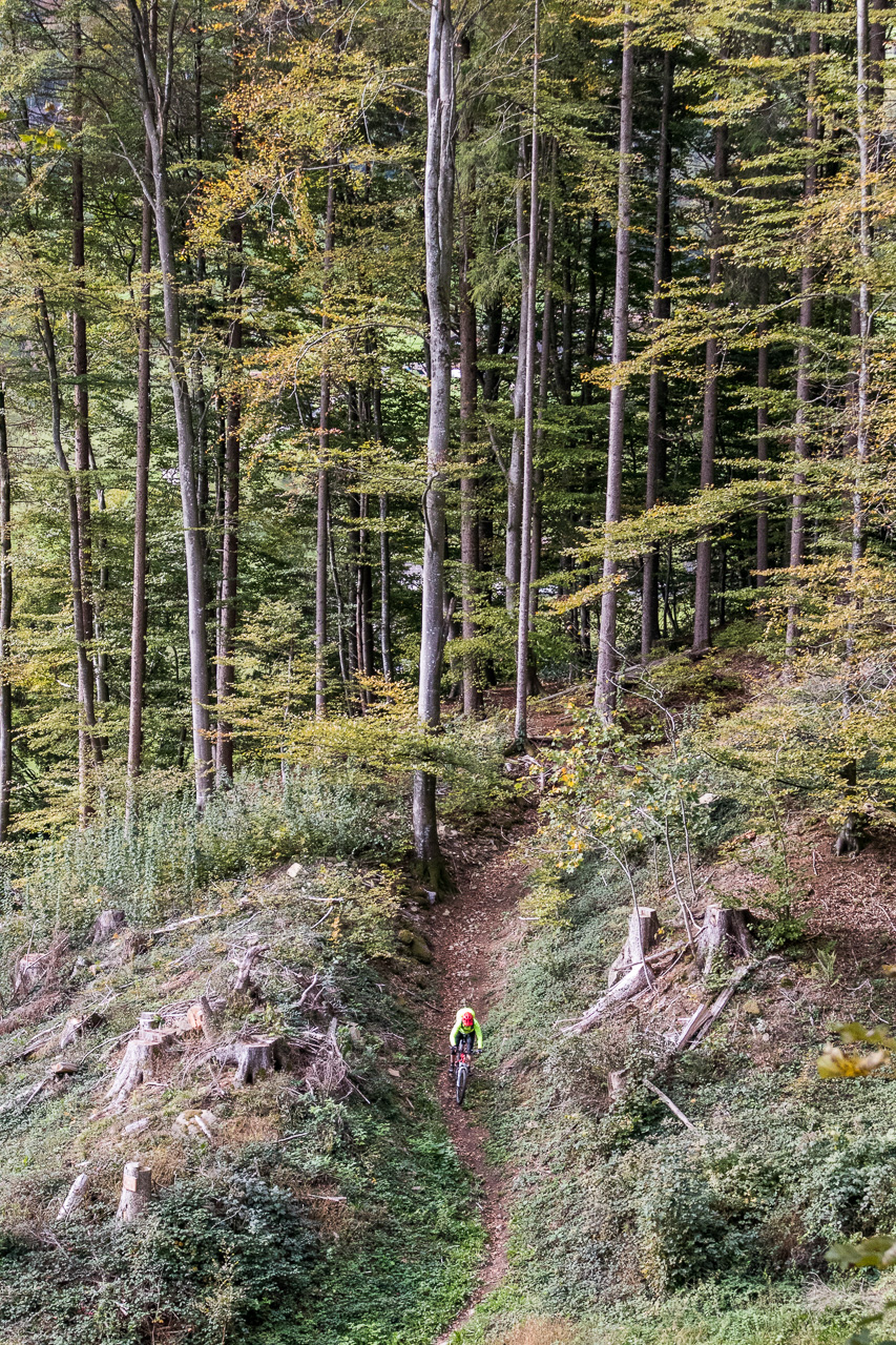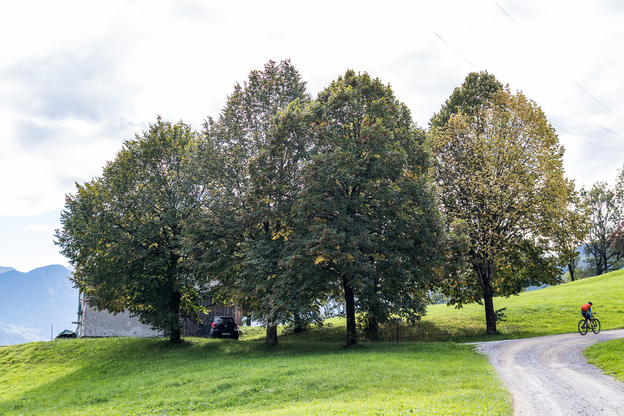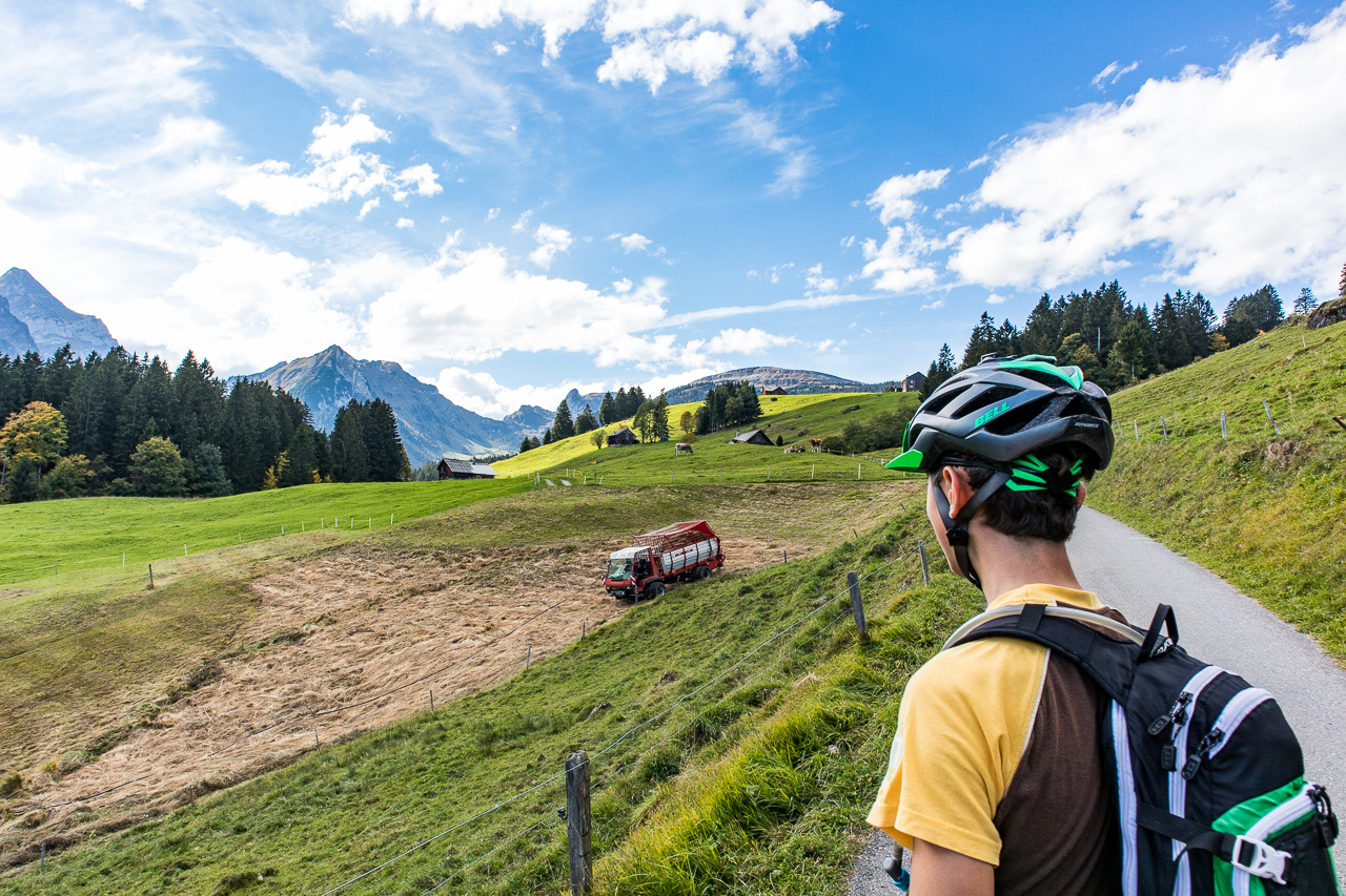 Nun steht die Abfahrt bevor! Zuerst fahren wir auf einer Alpstrasse, dann folgt der in der Beschreibung eingezeichnete Singletrail. Aha. Ein holpriger Wanderweg durch die Wiese, dazu mit Gegenanstieg. Und danach… Asphalt! Rasant fahren wir abwärts, aber es ist halt eben Asphalt, nicht wirklich der Traum eines richtigen Bikers. Fabian hat auf einer App vorher einen Singletrail ausgemacht. Diesen finden wir auch, allerdings ist er mit einem „schönen“, grossen allgemeinen Fahrverbot belegt. Engelchen und Teufelchen kämpfen eine Weile, schliesslich gewinnt das Engelchen und wir fahren den Rest auch noch auf Asphalt. So wird aus dem erhofften Abfahrtserlebnis ein Höhenmetervernichten. Schade um die schöne Tour.