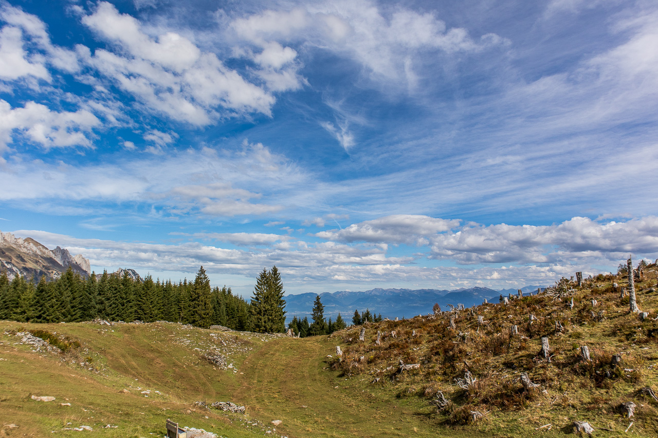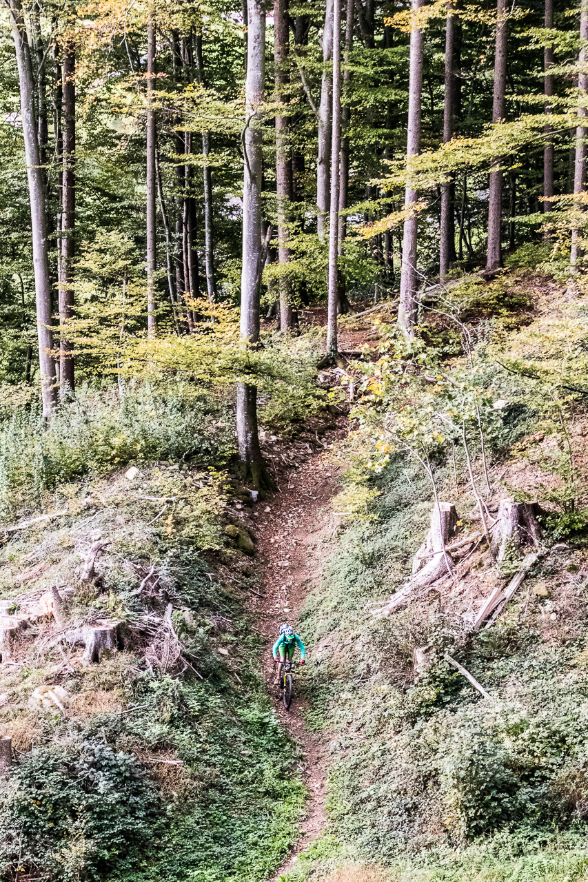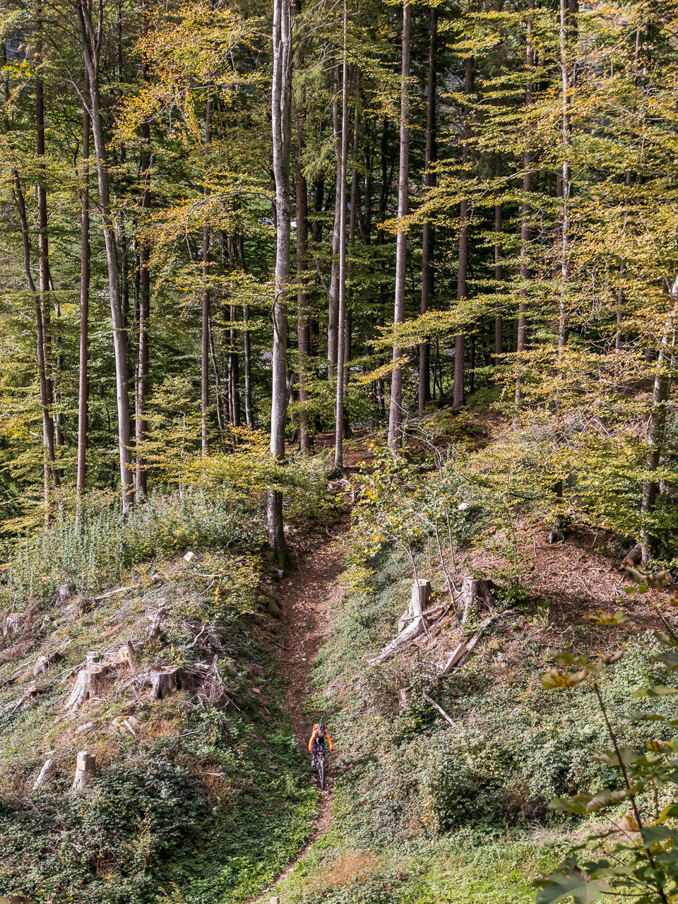 Nun steht die Abfahrt bevor! Zuerst fahren wir auf einer Alpstrasse, dann folgt der in der Beschreibung eingezeichnete Singletrail. Aha. Ein holpriger Wanderweg durch die Wiese, dazu mit Gegenanstieg. Und danach… Asphalt! Rasant fahren wir abwärts, aber es ist halt eben Asphalt, nicht wirklich der Traum eines richtigen Bikers. Fabian hat auf einer App vorher einen Singletrail ausgemacht. Diesen finden wir auch, allerdings ist er mit einem „schönen“, grossen allgemeinen Fahrverbot belegt. Engelchen und Teufelchen kämpfen eine Weile, schliesslich gewinnt das Engelchen und wir fahren den Rest auch noch auf Asphalt. So wird aus dem erhofften Abfahrtserlebnis ein Höhenmetervernichten. Schade um die schöne Tour.