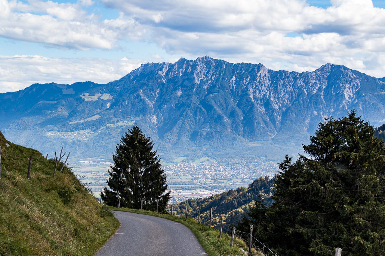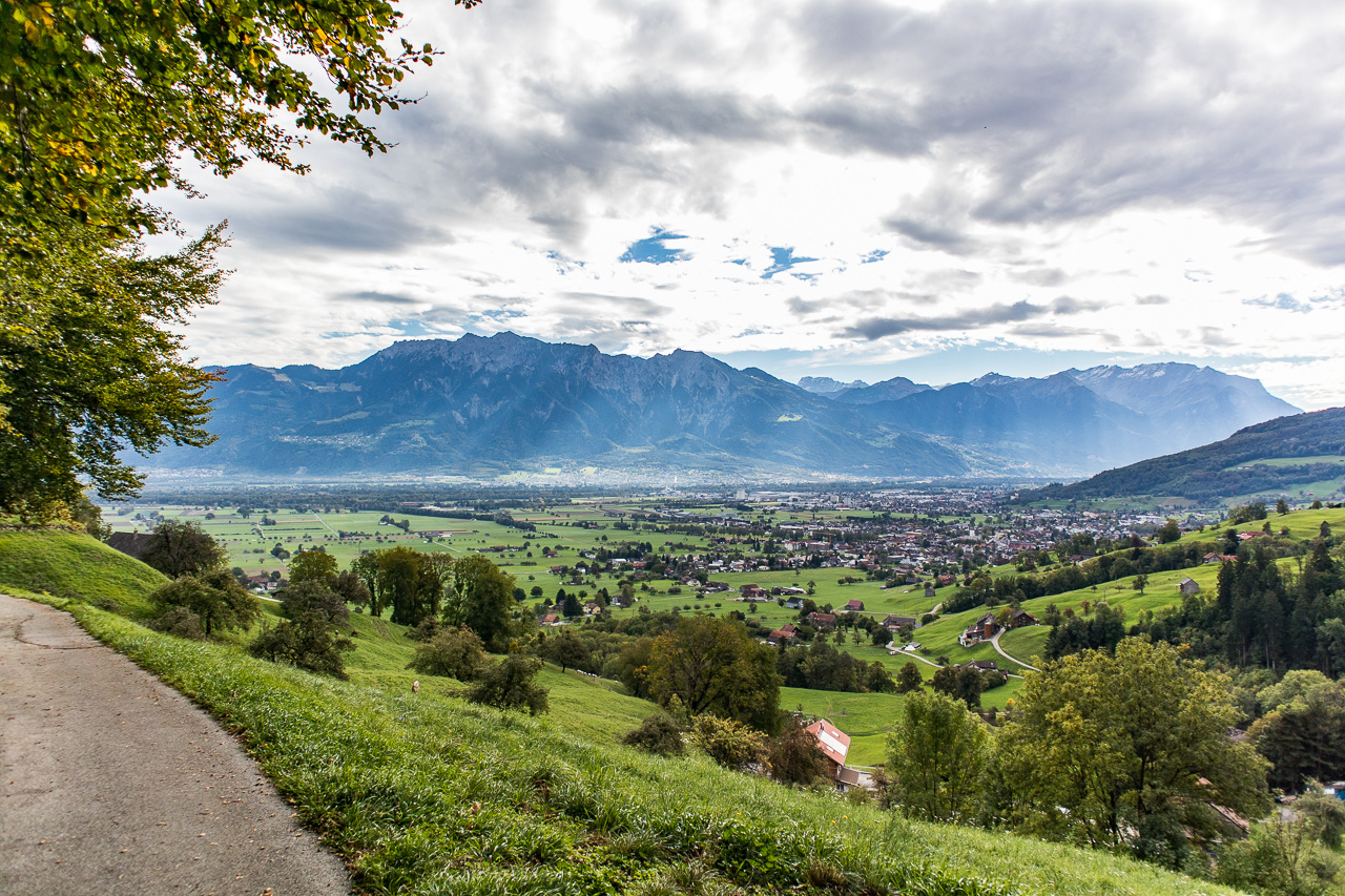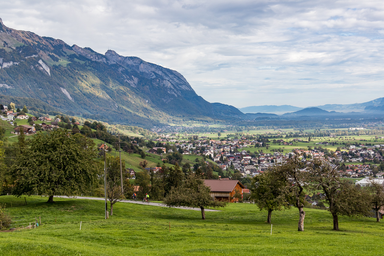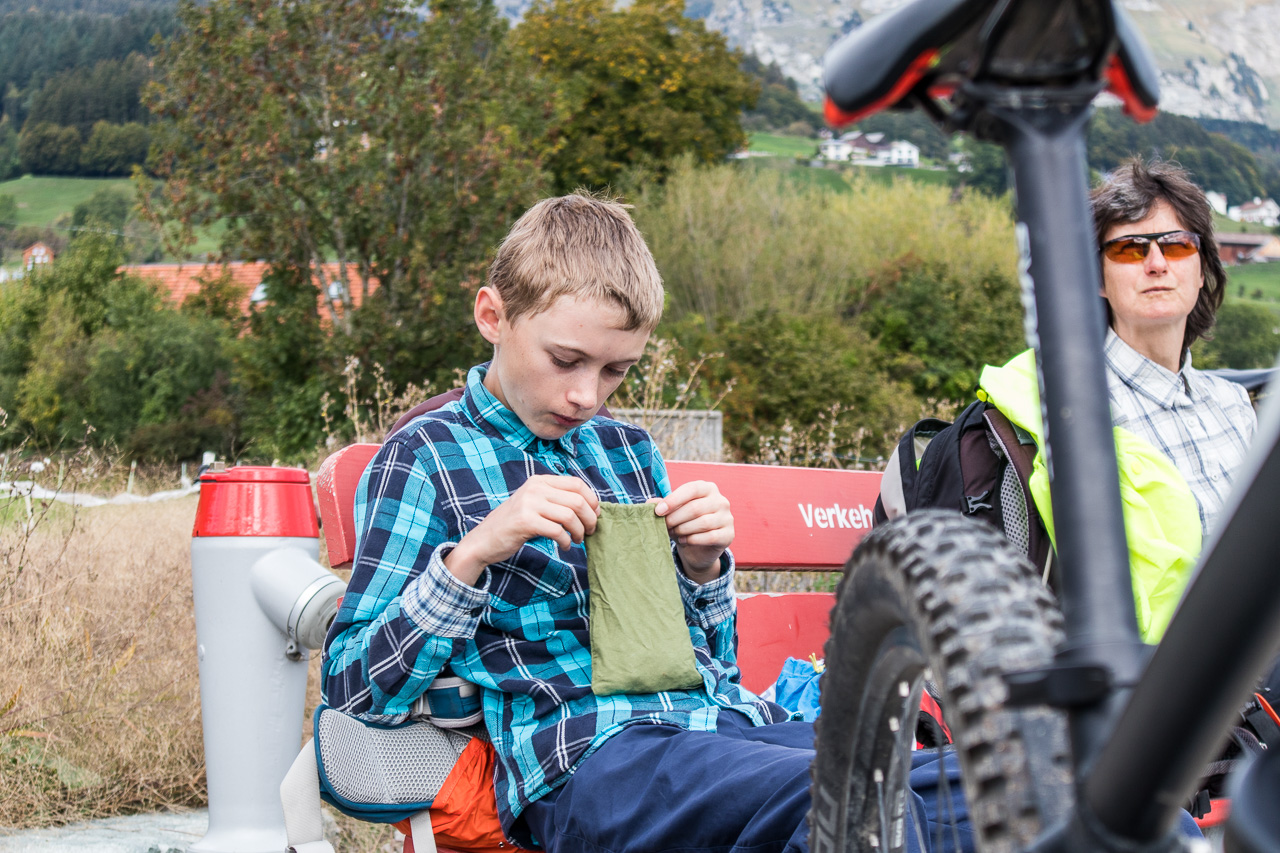 Nun würde die Route schön brav auf der Strasse verlaufen. Ich entdecke aber ein Wanderwegzeichen, und dieser sieht nach einem perfekten Singletrail aus. Da weit und breit keine Wanderer in Sicht sind, gebe ich das Startsignal und Fabian prescht jauchzend los. Der Trail ist wirklich cool, ohne den gäbe es gar keinen richtigen Singletrail auf der Route. Vielleicht sollten sich die Routendesigner das noch überlegen. Kurz darauf erreichen wir den tiefsten Punkt der Tour in Grabs, wo praktischerweise Bänke und ein Brunnen stehen. Wir stärken uns nochmals, bevor nun die Route ununterbrochen ansteigt. Die Bikeroute 460, unsere, trifft bald auf die Thurveloroute 95.