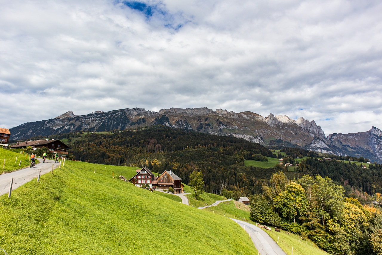 Diese Biketour wird als „Königstour“ bezeichnet, verlangt sie den Beinen doch einiges ab. Von Wildhaus fahren wir ab ins Rheintal, dann heisst es ordentlich in die Pedalen treten, hoch zur Ölberg-Alp, von gut 500 müM. bis auf über 1400 müM.