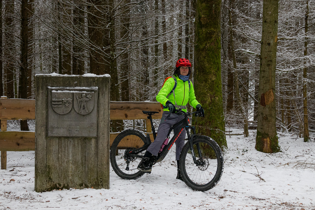Die Jungs waren auf Skitour, derweil die Frau und ich uns aufs Bike setzten. Ich wollte unbedingt in den Schnee! Da der Stierenberg bekanntlich der höchste Aargauer Berg ist, sollte es da auch etwas davon haben. So radelten wir via Niederwil bei Rickenbach hoch auf den Gipfel. Wir mussten bis zum letzten Bauernhof fahren, bis wir endlich im Schnee waren. Es war wunderschön, der Wald tief verschneit! So etwas erleben wir leider nur noch selten, der Klimawandel lässt grüssen. Vom höchsten Punkt fuhren wir die sogenannte Nordstrasse vorsichtig hinunter, es gab auch hier im Wald eisige Stellen, verursacht hauptsächlich durch Autospuren. Warum es hier oben Spuren von Autos gibt, wo doch ein Fahrverbot ist, verwunderte uns schon. Die kurze Tour endete dann wieder im Grün des Talbodens.