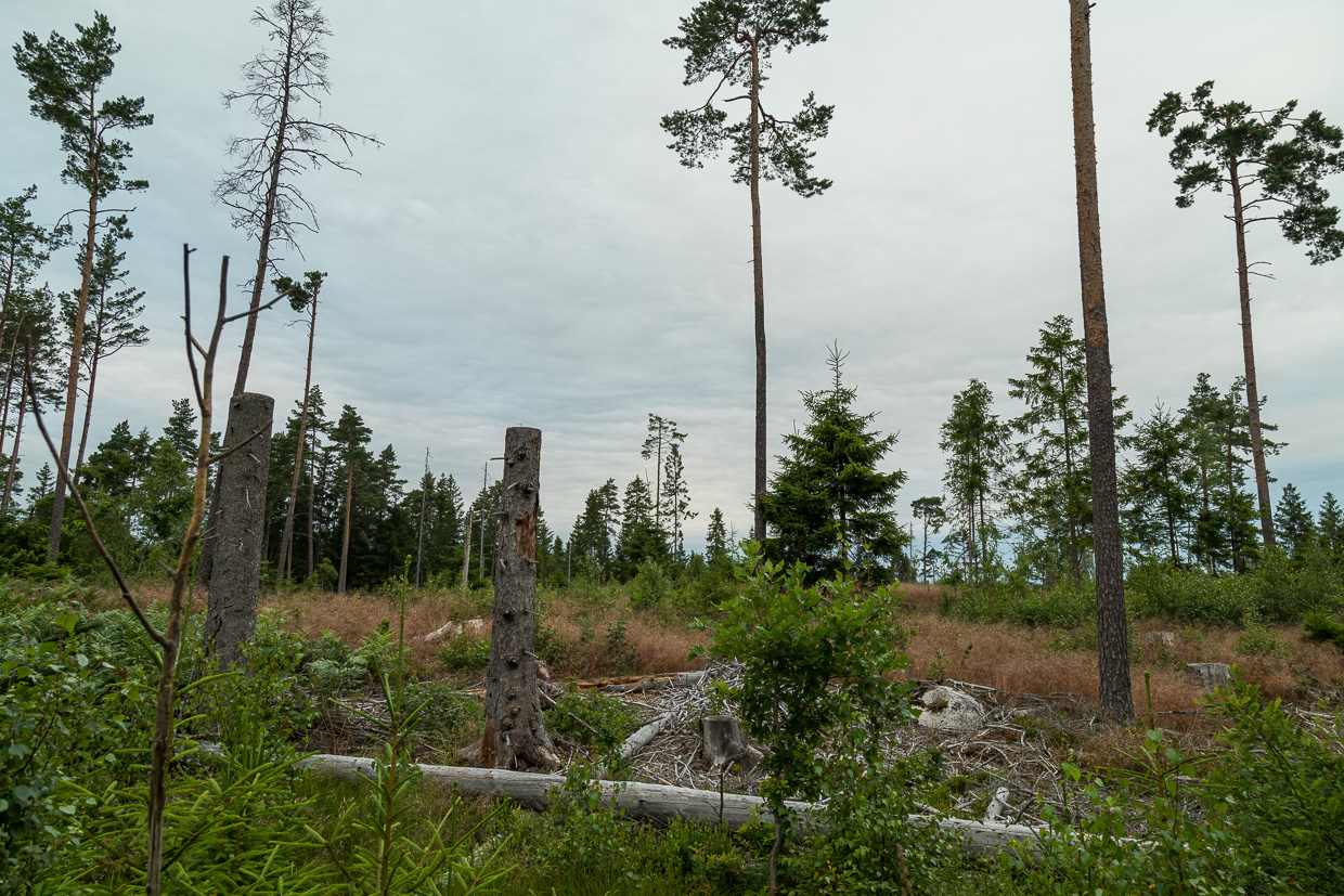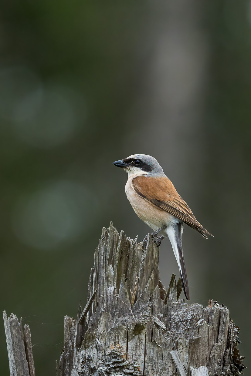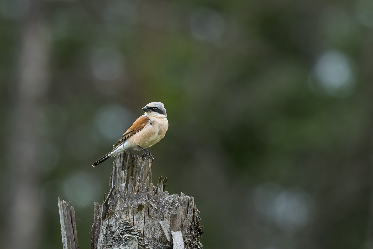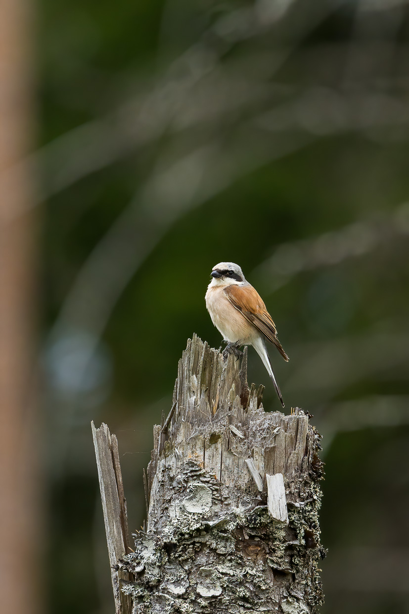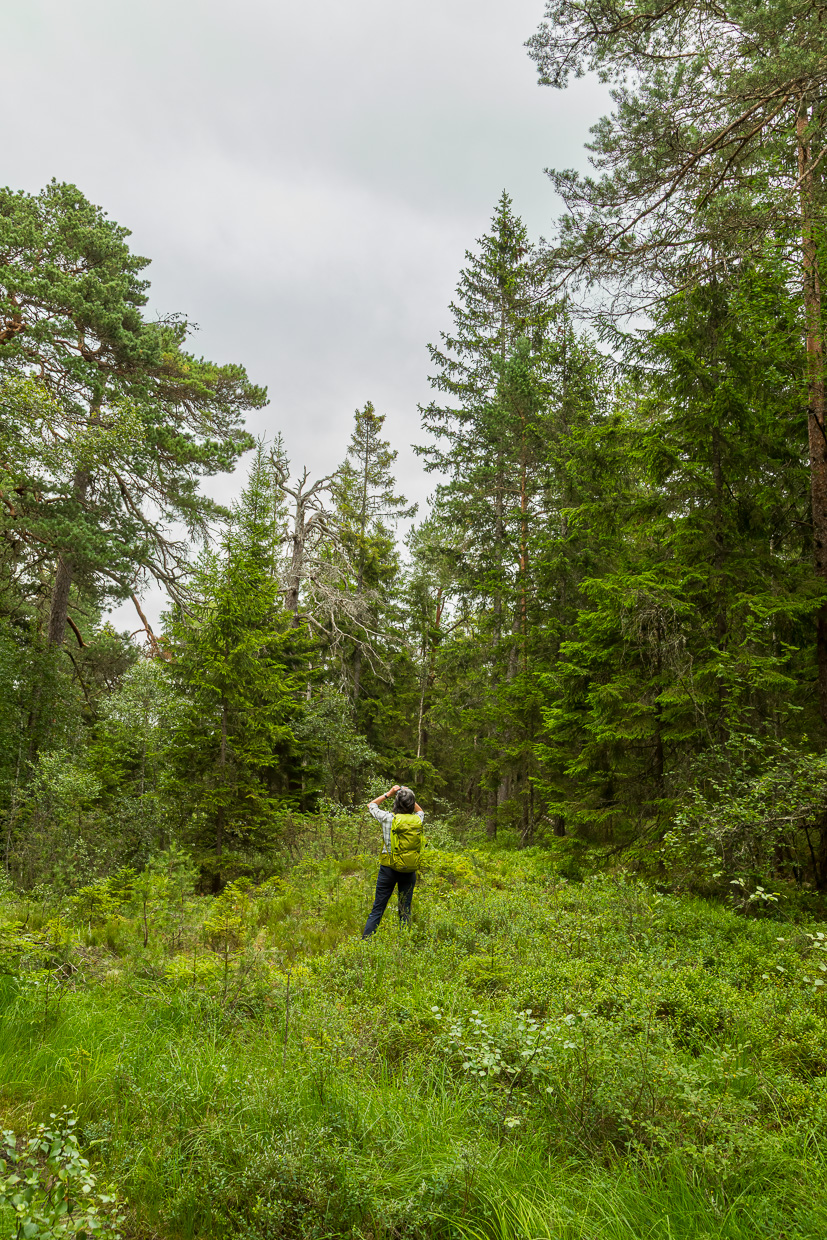 Endlich kommen wir von der Strasse weg, gehen auf schmalem Pfad durch den Wald. Auf jeder kleinen Lichtung vermuten wir einen Elch, sehen aber nie einen. Dann kommen wir auf eine grosse Lichtung, auf einem abgestorbenen Baumstamm sitzt ein Vogel. Mit dem Fernglas erkennen wir einen Neuntöter, mitten im Wald, zwar auf einer Lichtung. Auf der nächsten Lichtung sehen wir gleich wieder einen, den ich auch gut fotografieren kann. Der Neuntöter ist hier wohl auch ein Waldvogel.