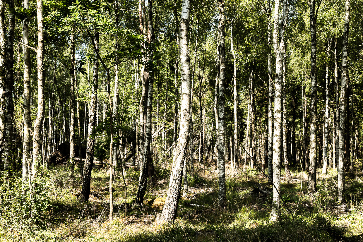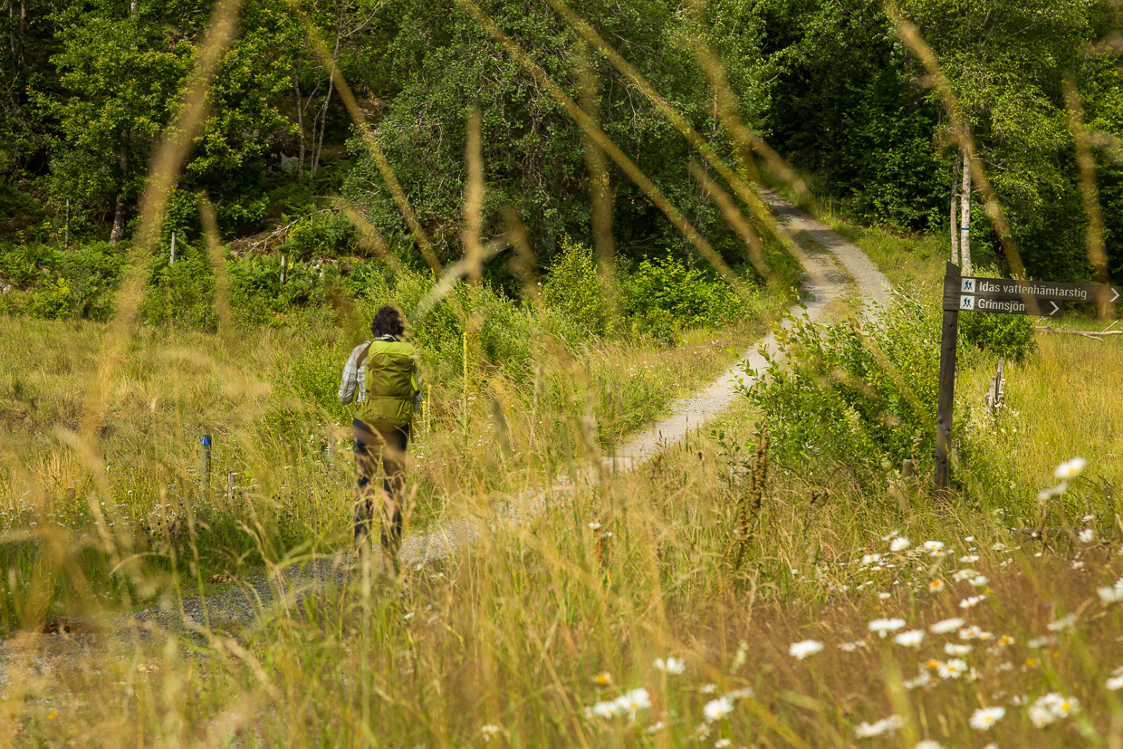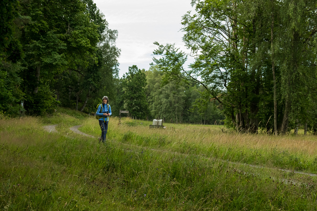 Den Rückweg zum Parkplatz wählen wir etwas anders, mehr dem See entlang, um etwas Abwechslung rein zu bringen. Die offizielle Route, der wir folgen, sagt nun, dass wir geradeaus der Strasse gehen sollen. Was für ein Blödsinn! Wir studieren die Karte und gehen auf einem Waldweg, der auch durch offenes Gelände führt, runter zum Hallsjön.