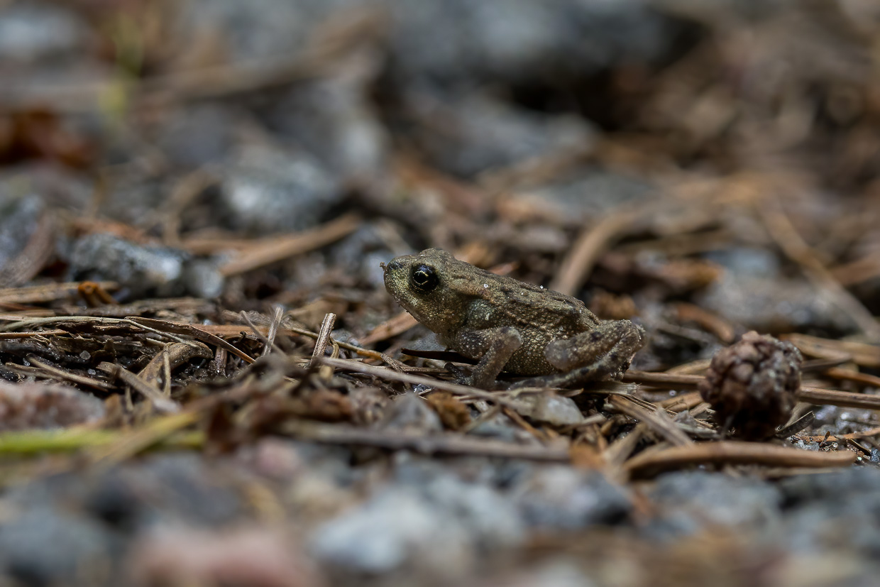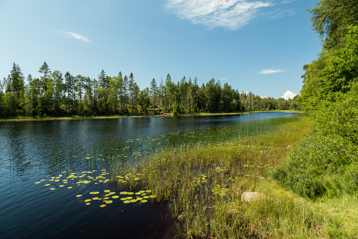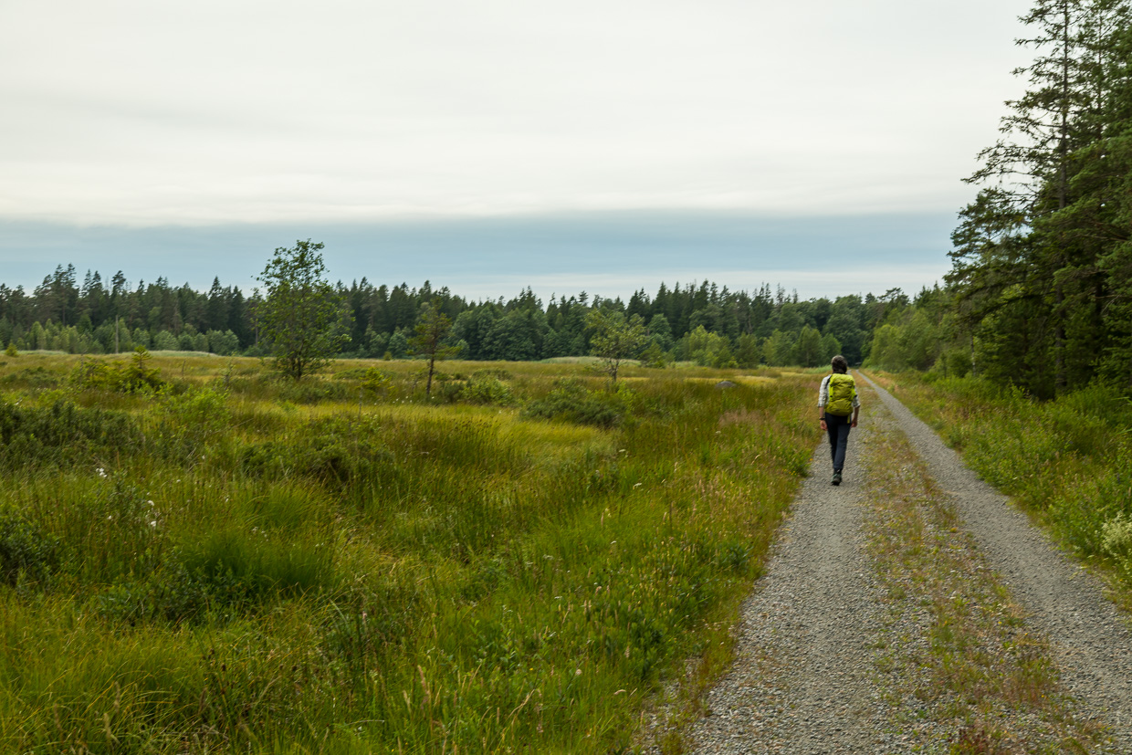 Wir wandern im gleichen Muster weiter, Stege, Waldwege, Waldstrassen, Lichtungen, Weiden. Wir passieren den Bergsjön, dessen Wasser tiefschwarz ist vom Moor. Auf den Wegen müssen wir aufpassen, es wimmelt nur so von kleinen Fröschen und Kröten. Kurz vor dem Ziel diskutieren wir, was wir als nächstes machen werden. Es gibt hier das Kungajaktmuseet Älgens Berg mit Informationen über die Tiere hier und die Jagd, das wäre sicher interessant, und etwas zu trinken wird es auch geben. Wir kommen zum Parkplatz zurück und uns trifft fast der Schlag: Alles voller Autos und es wimmelt nur so von Leuten! Nach der einsamen Wanderung ist das wie ein Kulturschock und wir entscheiden uns für die Flucht.