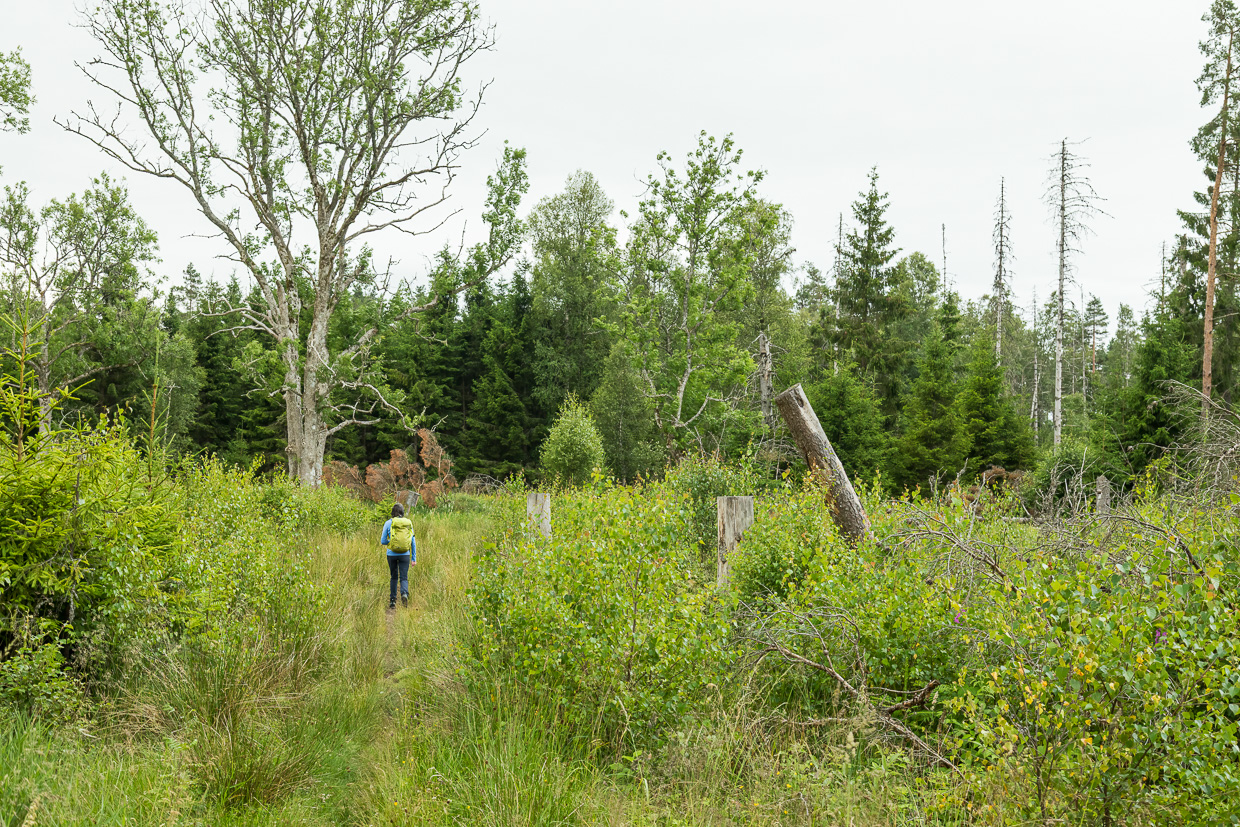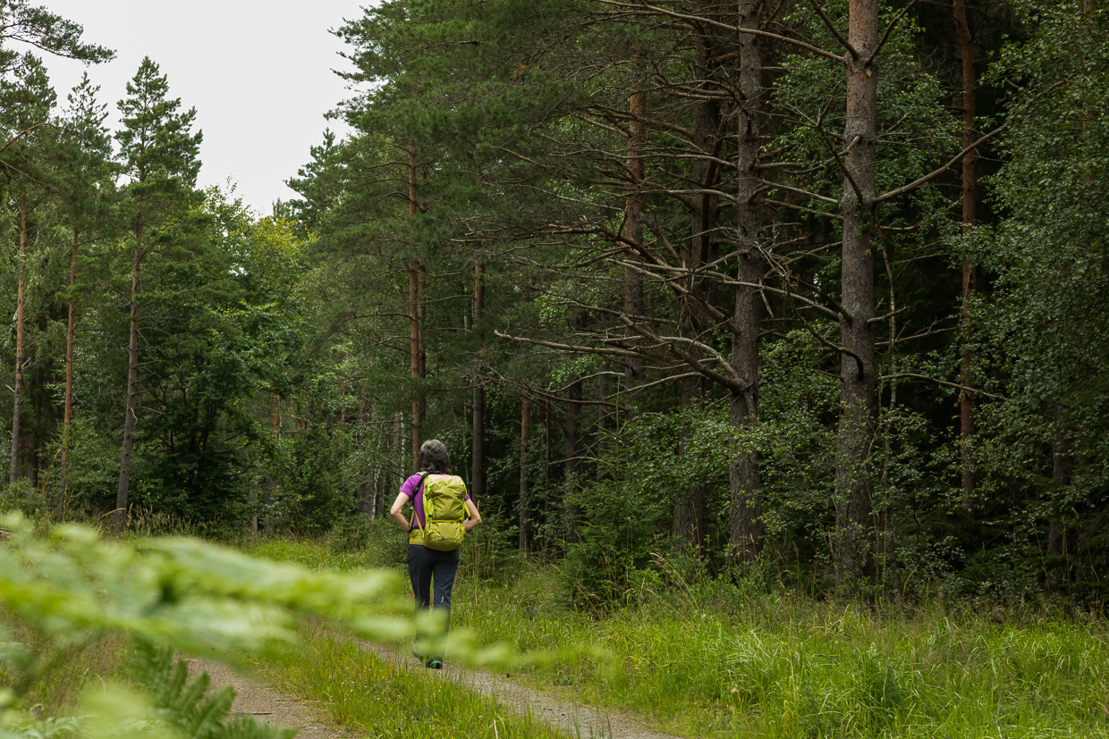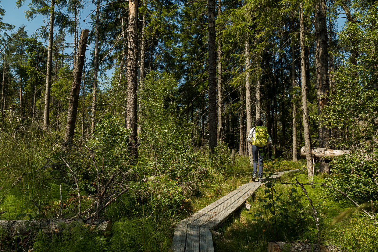 Wald wechselt sich mit offenen Flächen ab, wir gehen mal auf Holzstegen, mal auf Waldstrassen, mal auf weichen, vermoosten Waldwegen. Irgendwo mittendrin machen wir nach gut zwei Stunden wandern Pause. Da geht doch tatsächlich eine erste Person hinter uns durch! Es wird bis fast zum Schluss auch die einzige sein.