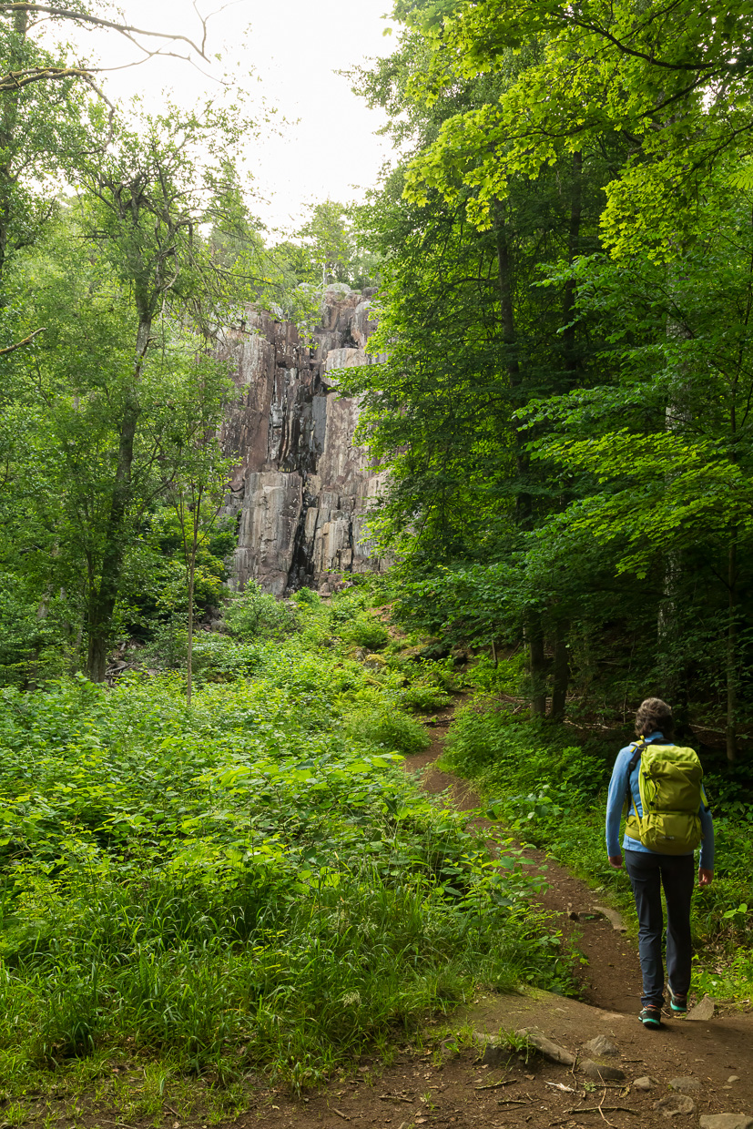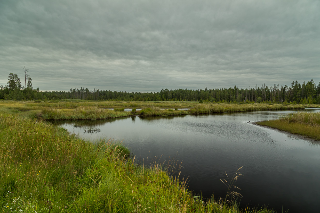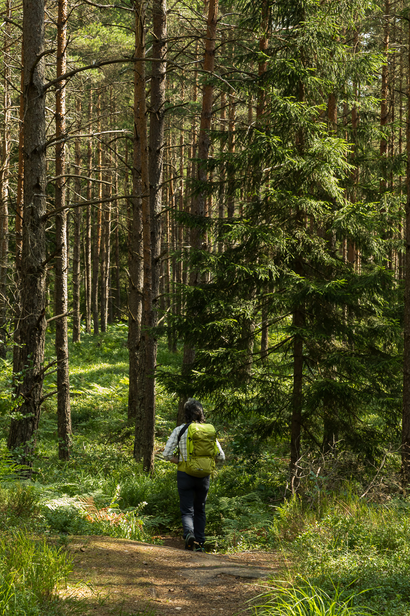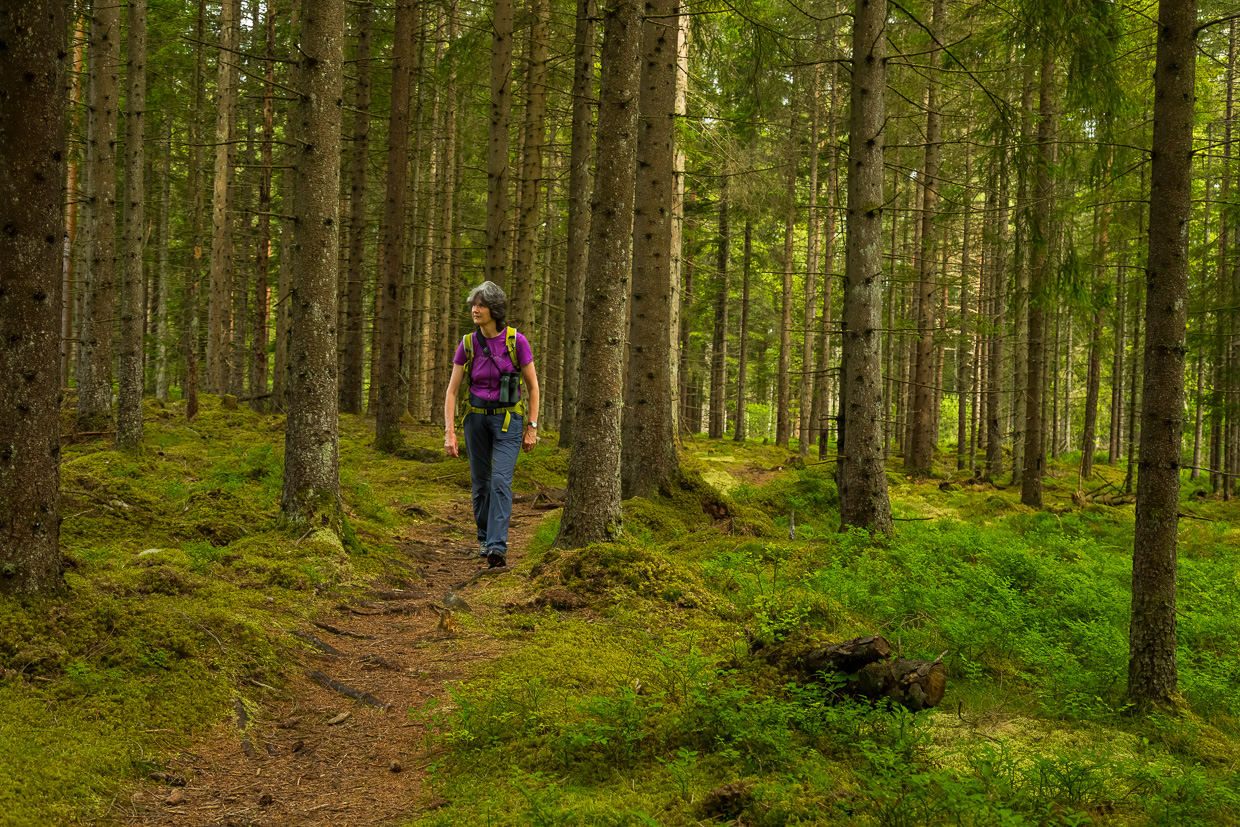 Wald wechselt sich mit offenen Flächen ab, wir gehen mal auf Holzstegen, mal auf Waldstrassen, mal auf weichen, vermoosten Waldwegen. Irgendwo mittendrin machen wir nach gut zwei Stunden wandern Pause. Da geht doch tatsächlich eine erste Person hinter uns durch! Es wird bis fast zum Schluss auch die einzige sein.