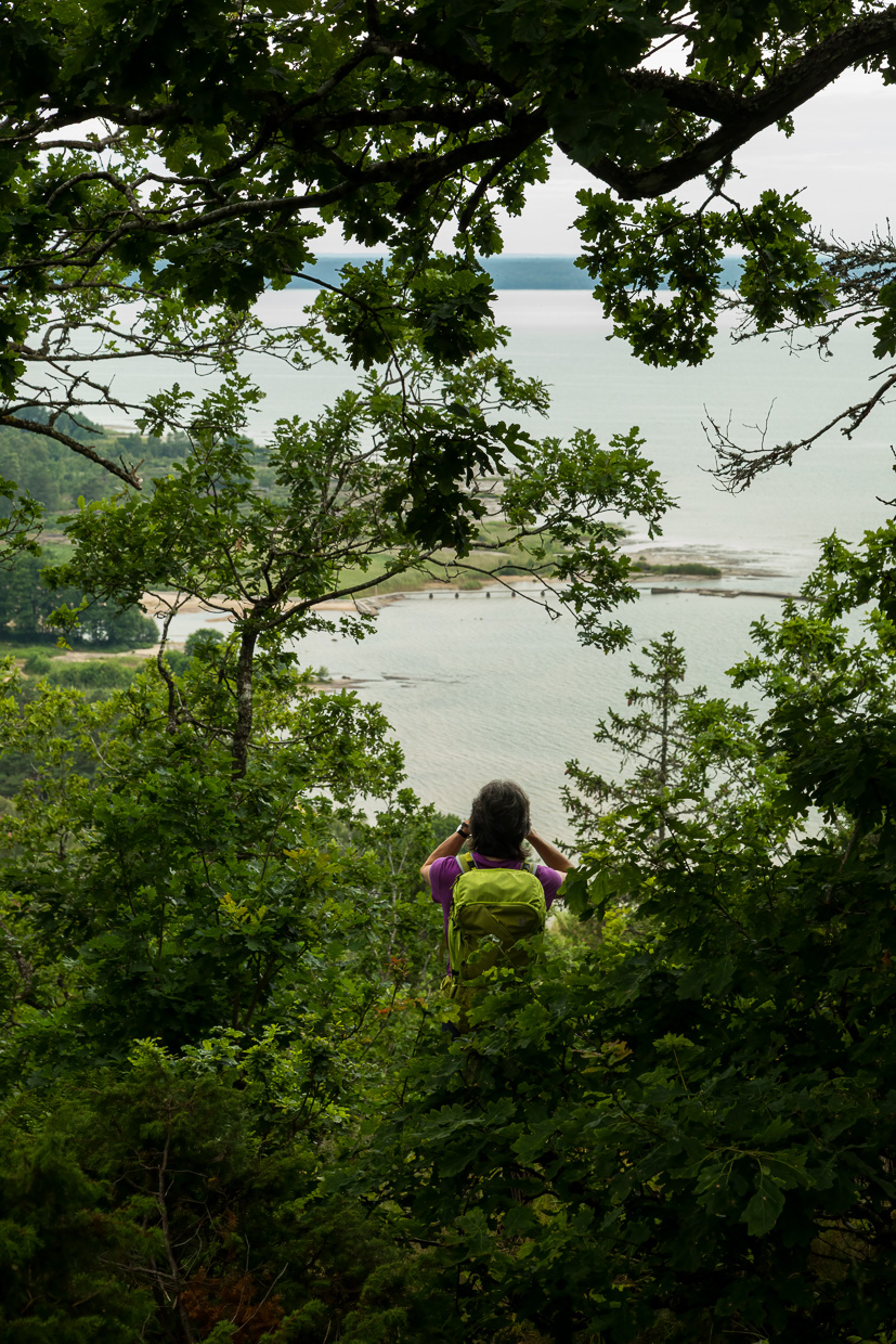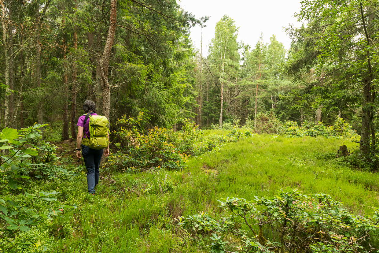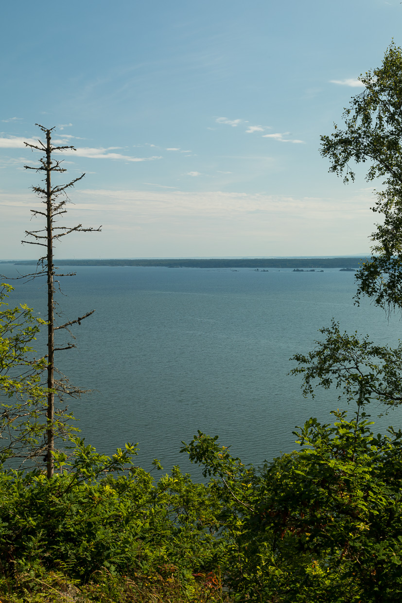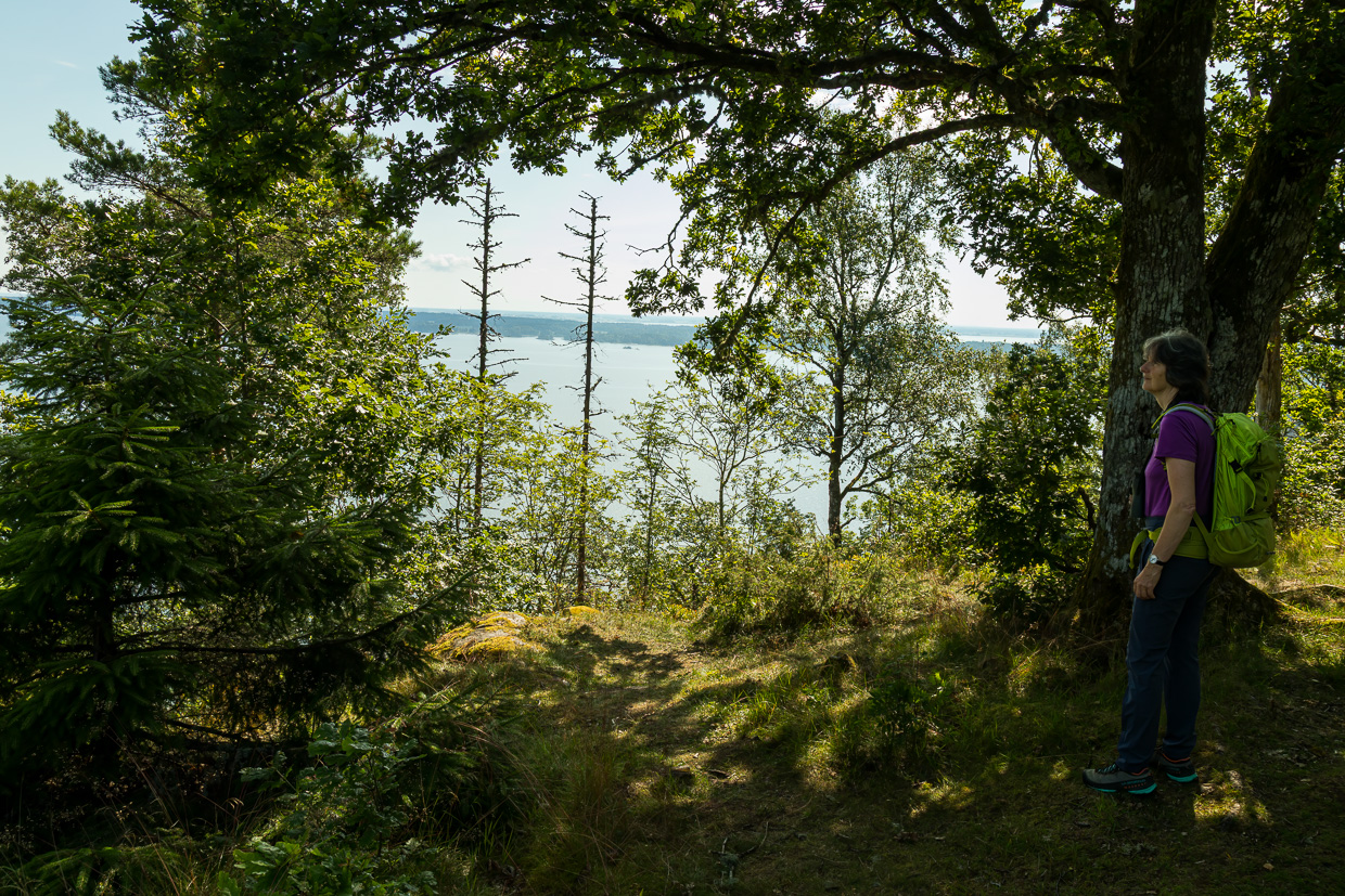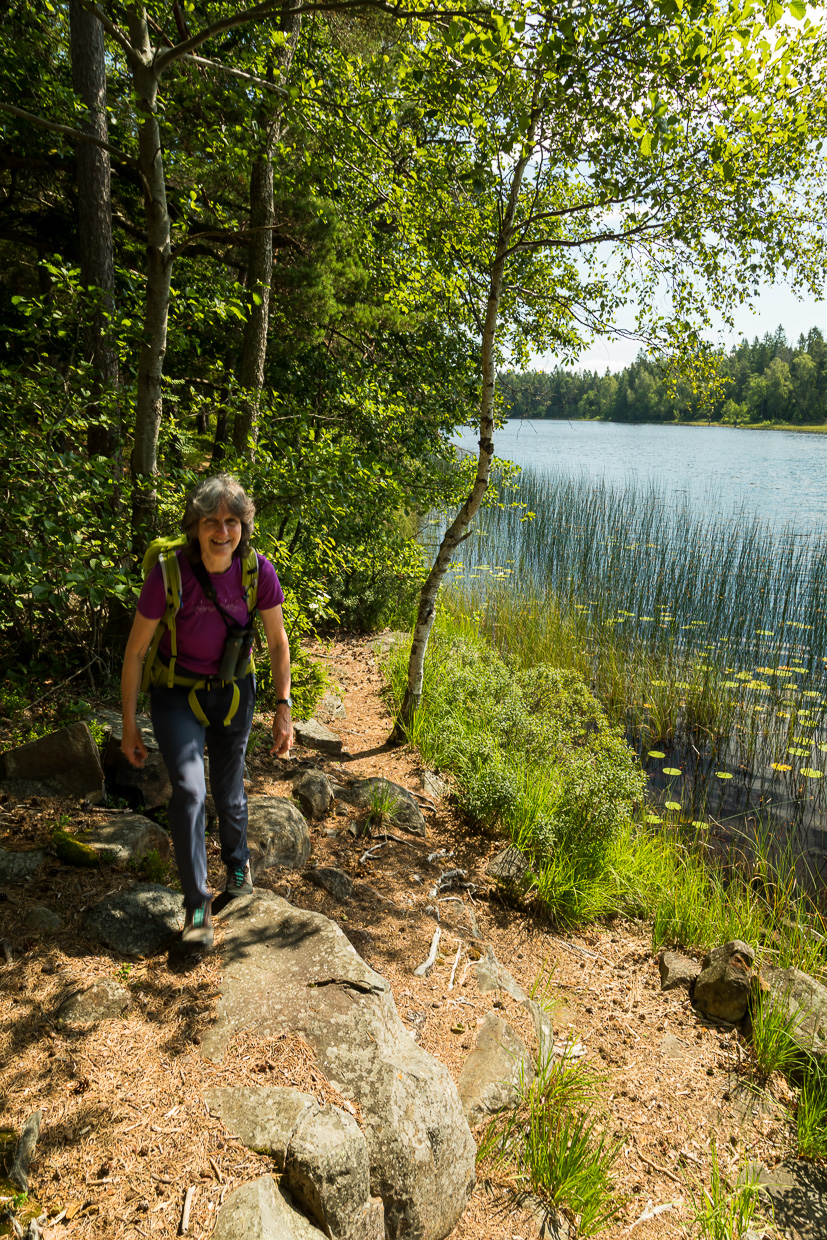 Wir wandern weiter durch den Wald, ohne erfolgreiche Elchsichtung, deretwegen wir ja wieder so früh aufgestanden sind. Wir geniessen dafür die Einsamkeit, bis uns nach Stunden jemand entgegen kommt. Da ist wohl ein Parkplatz in der Nähe. Tatsächlich, einige Minuten später stehen da ein Auto und ein Camper. Ab hier gibt es eine kurze Rundwanderung zum Predikstolen, dem Predigerstuhl, der die Aussicht auf den Vänern freigibt. Wir wandern in leichtem Auf und Ab dort hin – und treffen auf die nächsten Leute, einem älteren schwedischen Ehepaar, das die Aussicht geniesst. Die erste Frage ist natürlich, woher wir kämen. „Oh, dann seid ihr dieses Gelände gewohnt (es ist felsig hier). Die Schweden sind nicht so gut in felsigem Terrain.“, meint sie. Wir geniessen die Aussicht ebenfalls und stärken uns.
