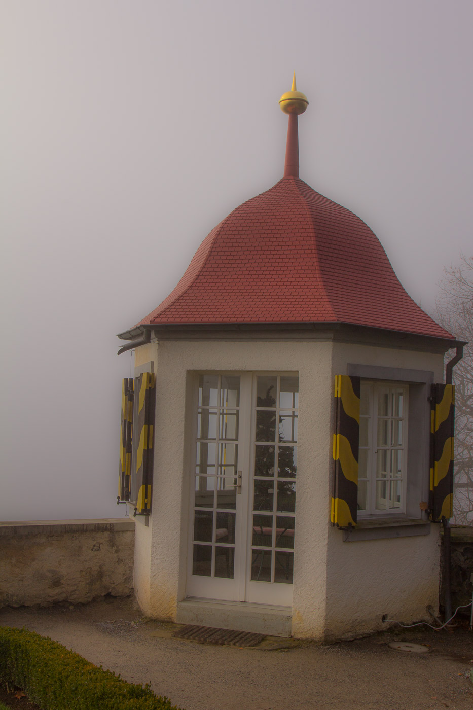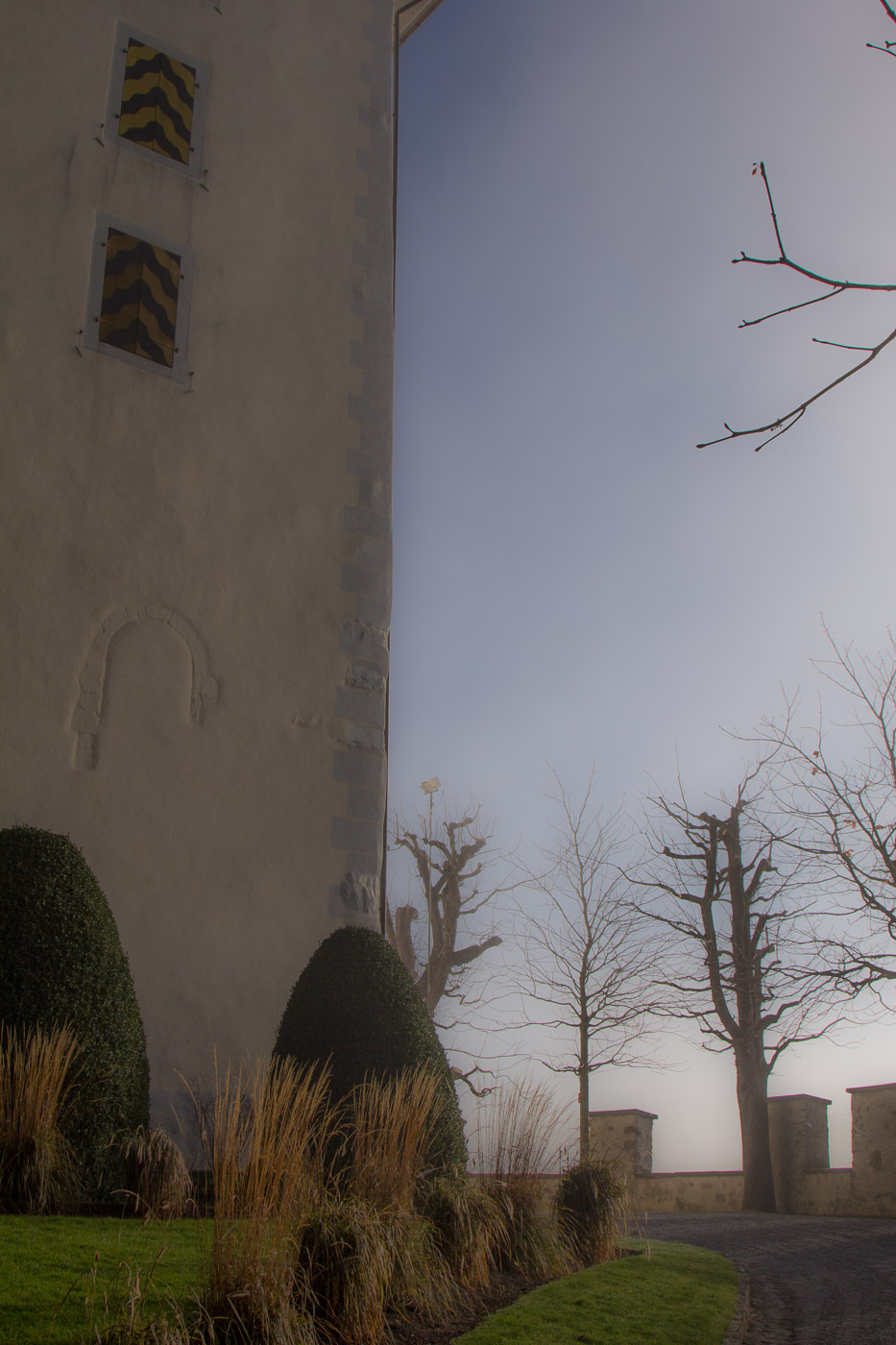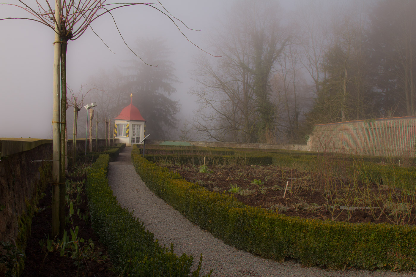 Das Schloss ist mal mehr, mal weniger in Nebel gehüllt. Oben sehen wir aber den blauen Himmel, zwischendurch sogar die Sonne. Wir hoffen immer noch, dass es ganz aufreisst. Das Schloss kann man um diese Jahreszeit nicht besuchen, entsprechend ist natürlich auch das Schloss-Café geschlossen. Der Rosengarten, für den das Schloss bekannt ist, besucht man auch besser, wenn die Rosen blühen. Dafür erleben wir wieder so eine unheimliche, gespenstische Stimmung.