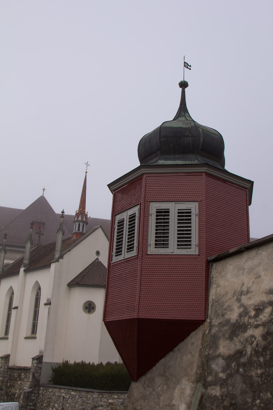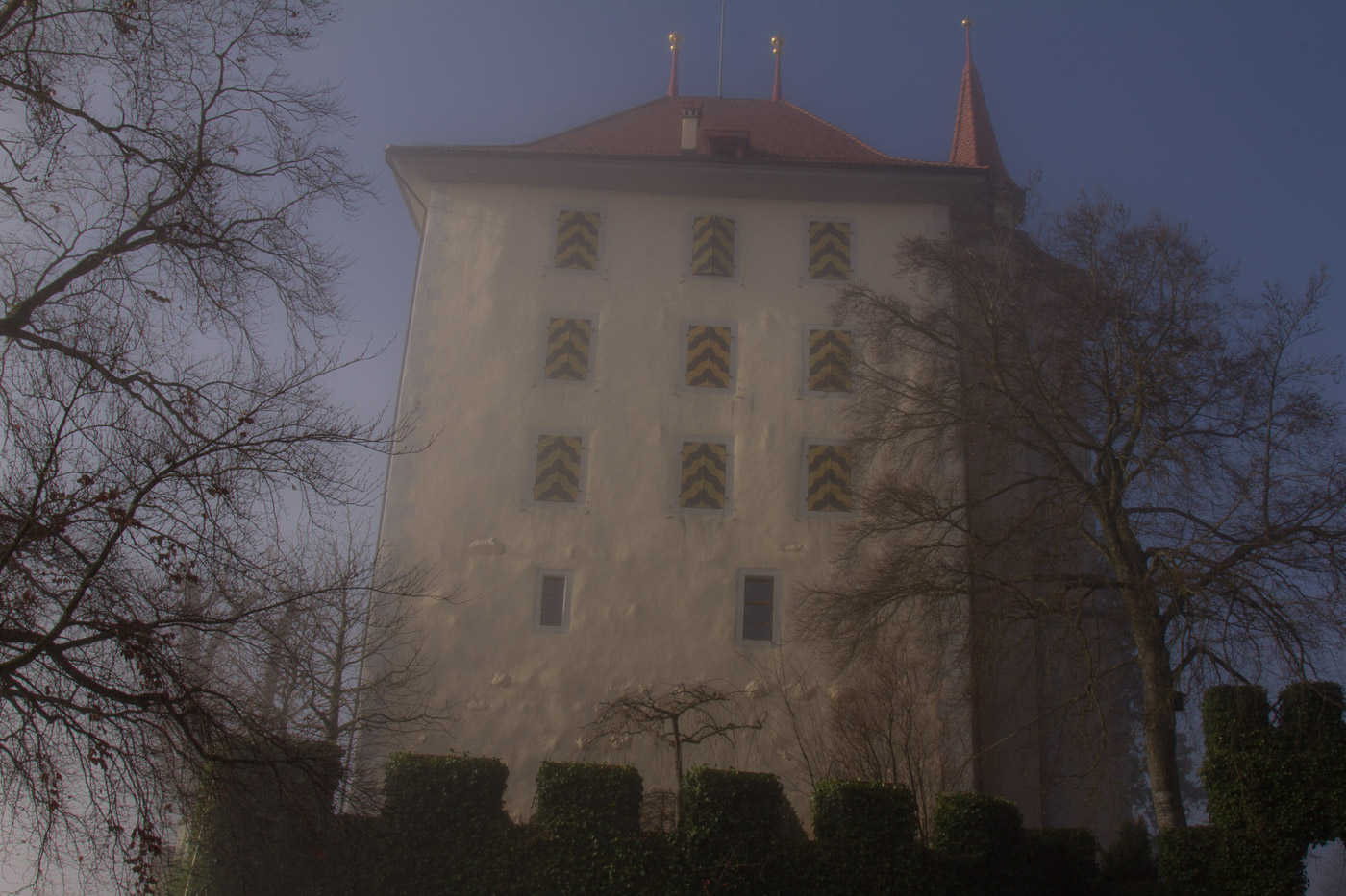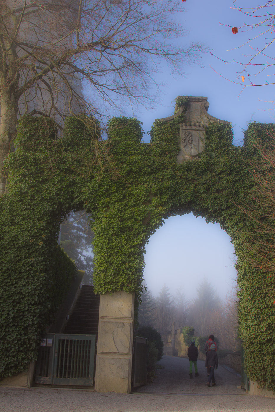 Das Schloss ist mal mehr, mal weniger in Nebel gehüllt. Oben sehen wir aber den blauen Himmel, zwischendurch sogar die Sonne. Wir hoffen immer noch, dass es ganz aufreisst. Das Schloss kann man um diese Jahreszeit nicht besuchen, entsprechend ist natürlich auch das Schloss-Café geschlossen. Der Rosengarten, für den das Schloss bekannt ist, besucht man auch besser, wenn die Rosen blühen. Dafür erleben wir wieder so eine unheimliche, gespenstische Stimmung.