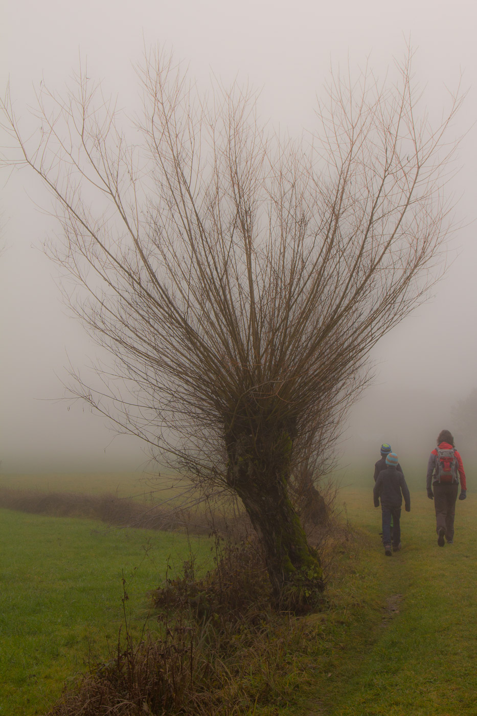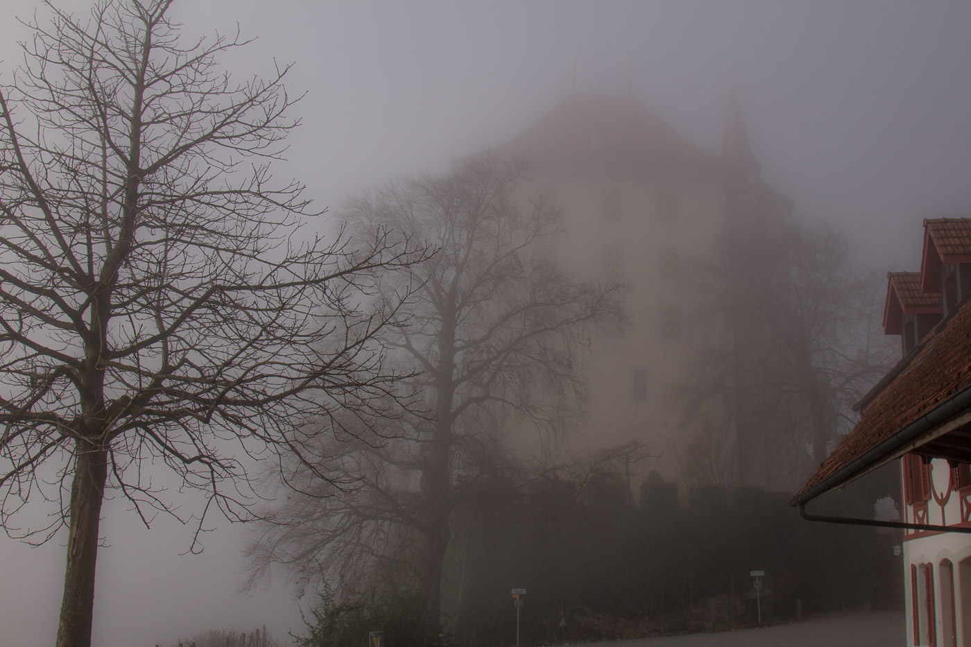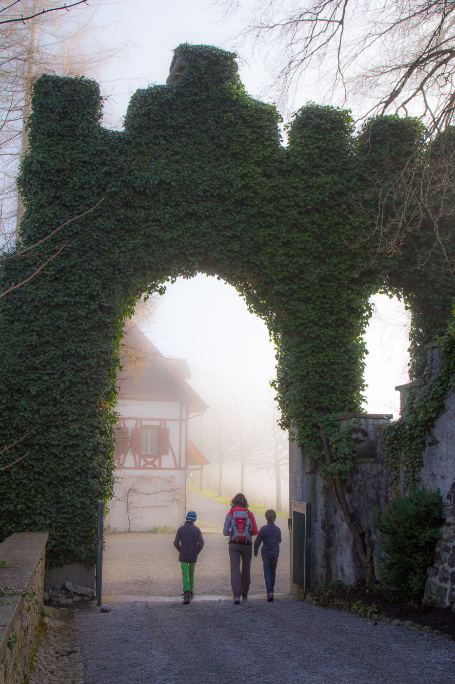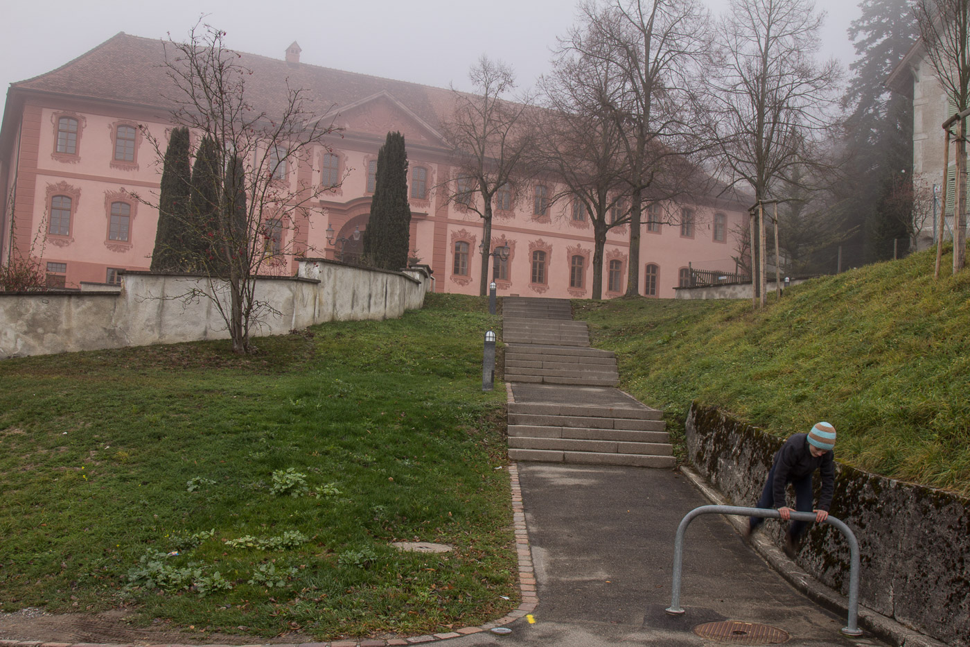 In Hitzkirch entsteigen wir dem Zug, dasselbe Grau umgibt uns auch hier. Wir streben dem Dorf entgegen (der Bahnhof liegt etwas ausserhalb), lassen alle Cafés links liegen. Auch die riesige Kirche mit der Deutschordens-Kommende betrachten wir nur von aussen. Hitzkirch wurde unter dem Namen Hiltis-Chilche 1230 erstmals urkundlich erwähnt. Von 1173 bis 1263 herrschten die Kyburger, danach bis 1415 die Habsburger, dann die Eidgenossen. Wir streben weiter auf dem Wanderweg dem Schloss Heidegg zu. Über Felder gelangen wir in ein bewaldetes Tobel, dem durch den Nebel ein gewisser Zauber inne wohnt. Wir gehen quasi durch eine weichgezeichnete Landschaft. Und wir sind einmal mehr ganz alleine unterwegs. Im Sommer wird hier ein ziemlicher Trubel sein, ist das Schloss doch ein beliebtes Ausflugsziel in der Gegend. Der Jüngste zeigt uns noch den Ort, wo sie Filmaufnahmen gedreht haben für ihr Schul-Theater.