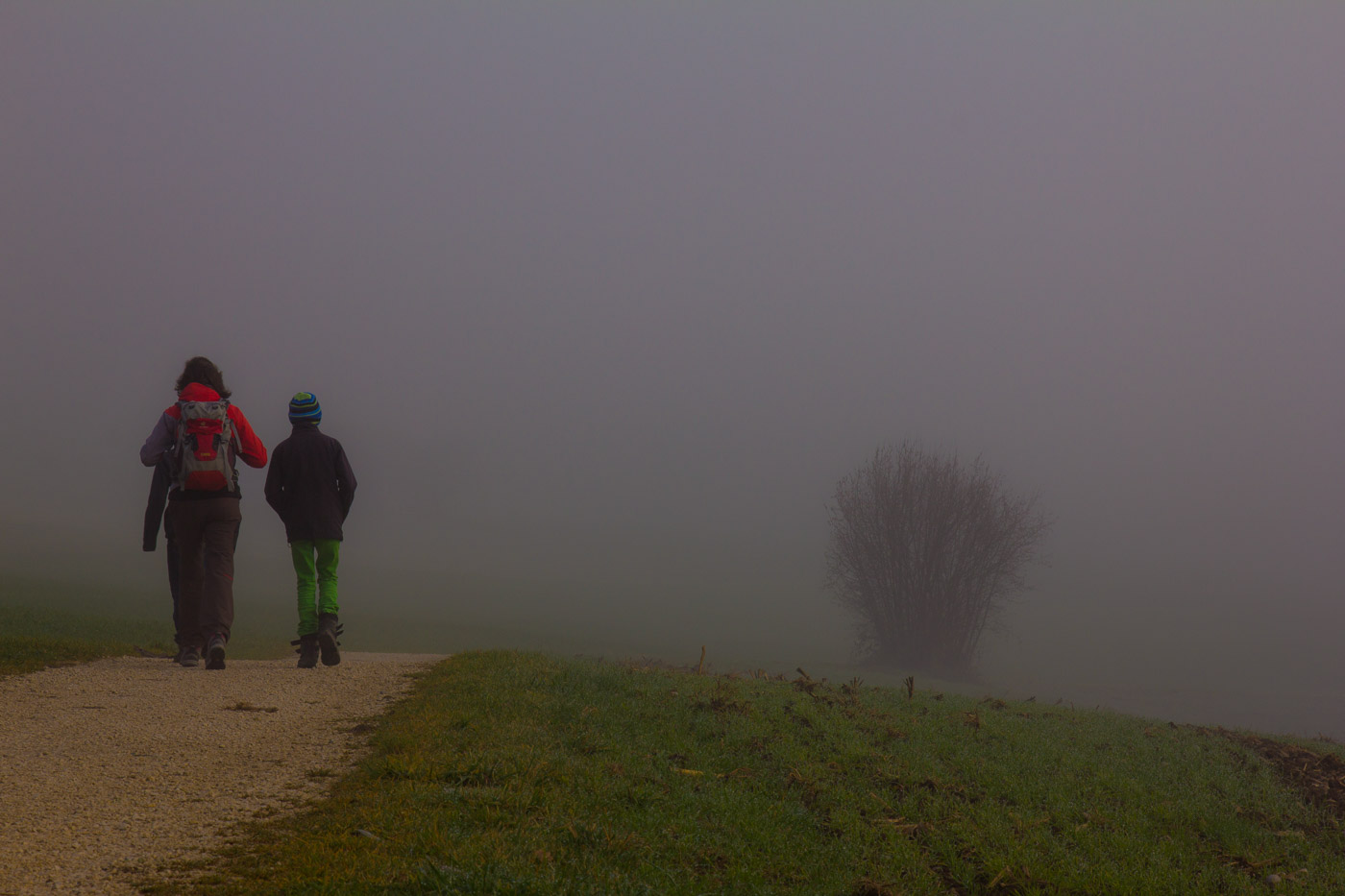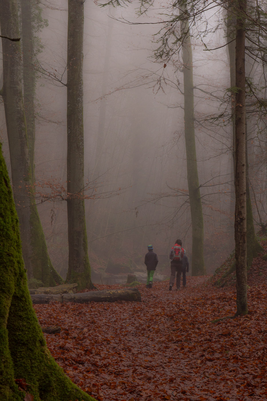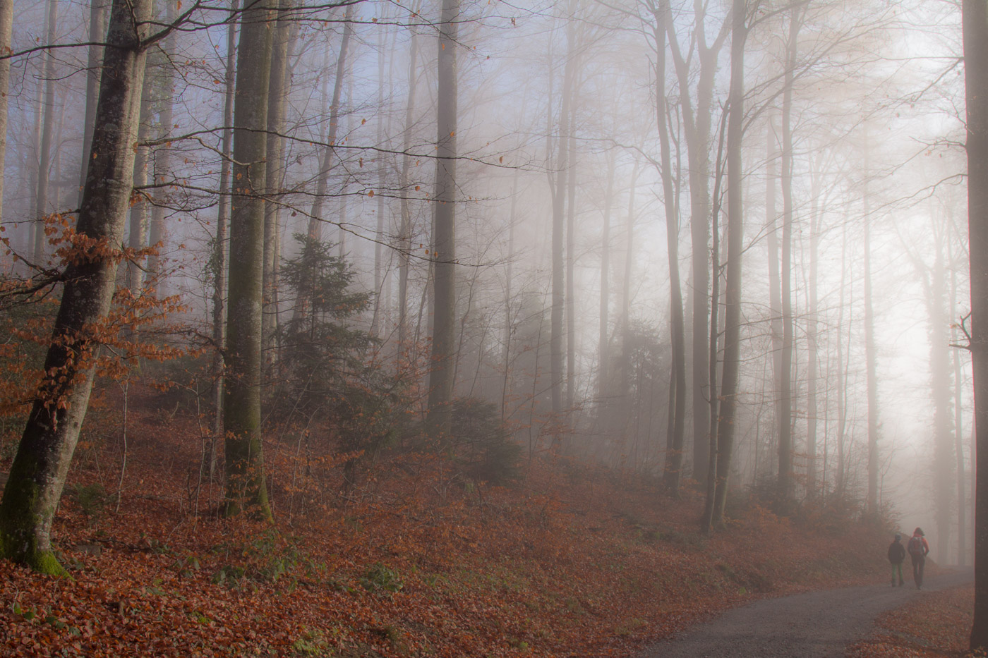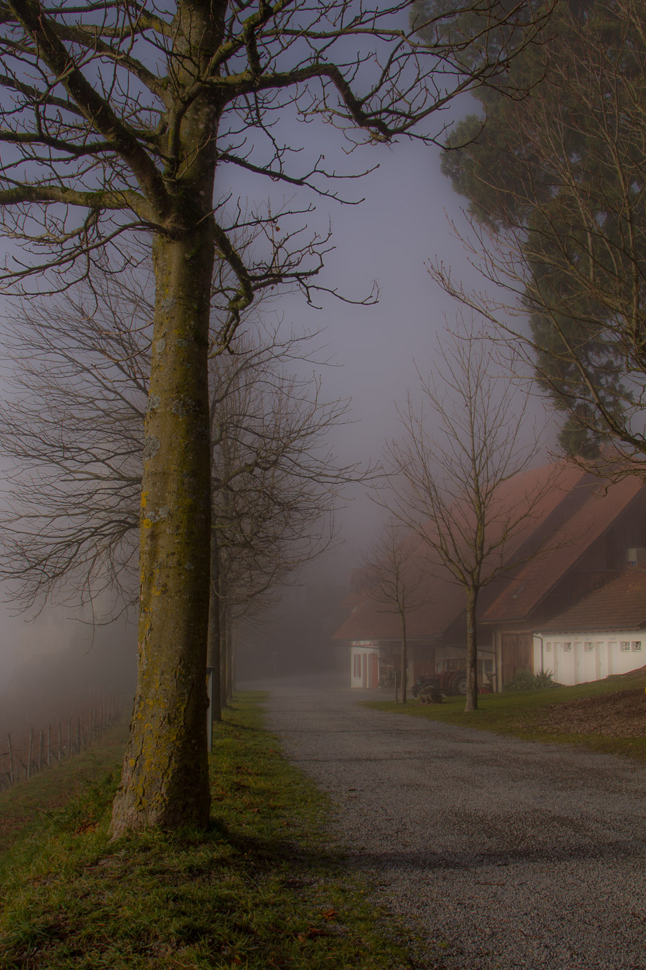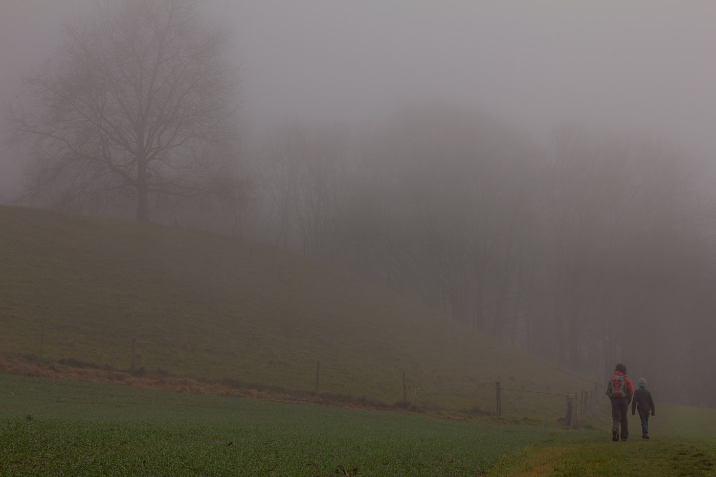 In Hitzkirch entsteigen wir dem Zug, dasselbe Grau umgibt uns auch hier. Wir streben dem Dorf entgegen (der Bahnhof liegt etwas ausserhalb), lassen alle Cafés links liegen. Auch die riesige Kirche mit der Deutschordens-Kommende betrachten wir nur von aussen. Hitzkirch wurde unter dem Namen Hiltis-Chilche 1230 erstmals urkundlich erwähnt. Von 1173 bis 1263 herrschten die Kyburger, danach bis 1415 die Habsburger, dann die Eidgenossen. Wir streben weiter auf dem Wanderweg dem Schloss Heidegg zu. Über Felder gelangen wir in ein bewaldetes Tobel, dem durch den Nebel ein gewisser Zauber inne wohnt. Wir gehen quasi durch eine weichgezeichnete Landschaft. Und wir sind einmal mehr ganz alleine unterwegs. Im Sommer wird hier ein ziemlicher Trubel sein, ist das Schloss doch ein beliebtes Ausflugsziel in der Gegend. Der Jüngste zeigt uns noch den Ort, wo sie Filmaufnahmen gedreht haben für ihr Schul-Theater.
