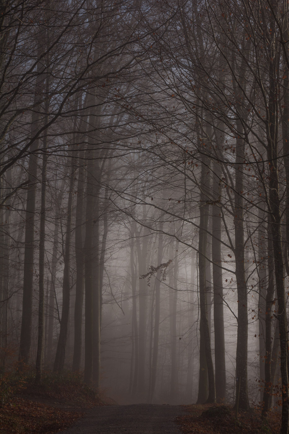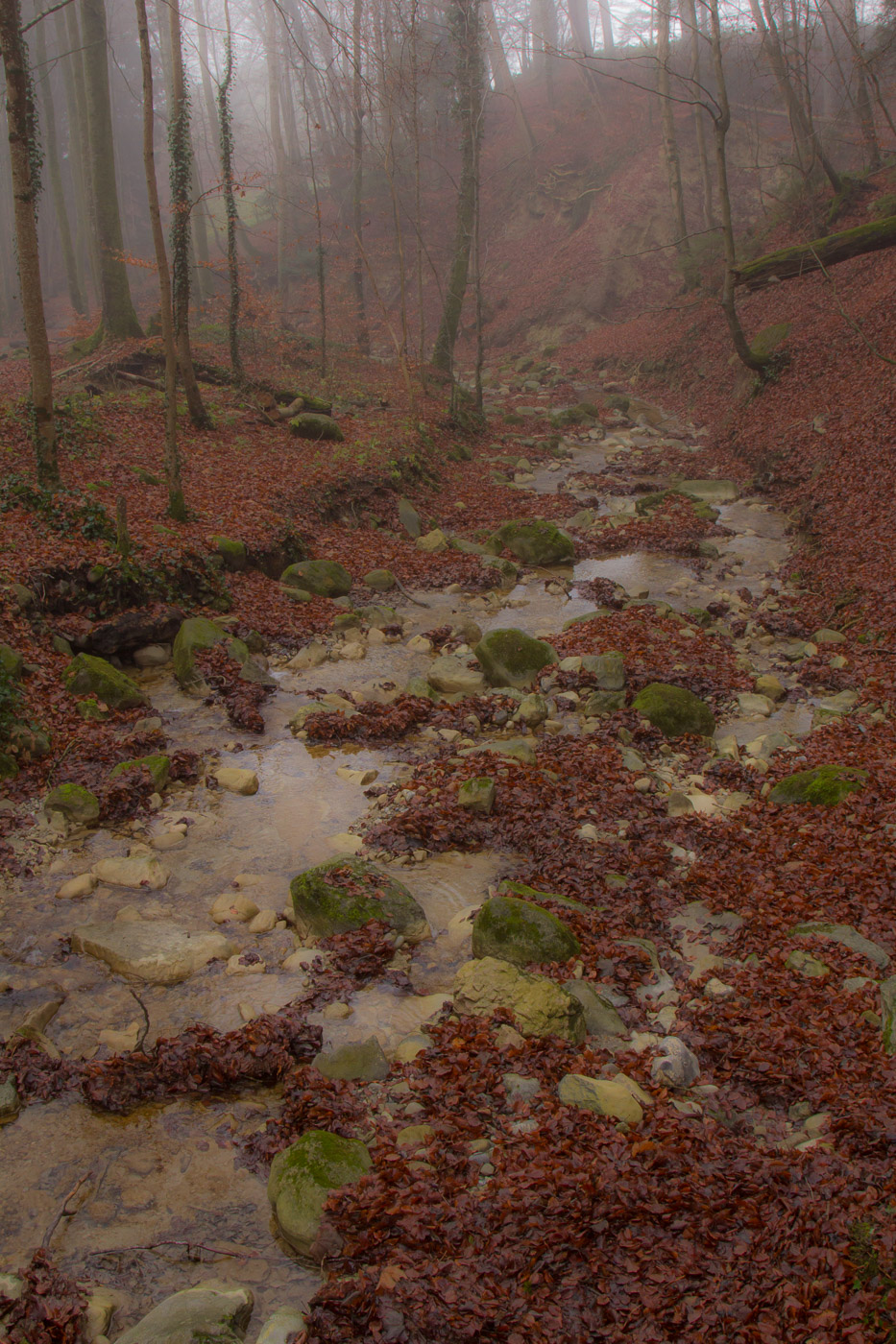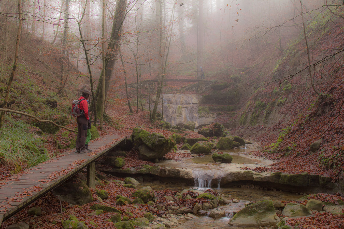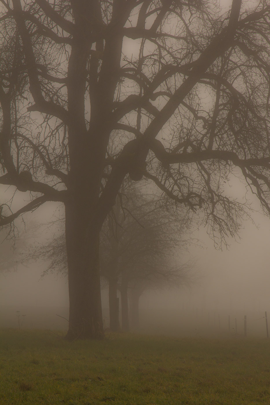 In Hitzkirch entsteigen wir dem Zug, dasselbe Grau umgibt uns auch hier. Wir streben dem Dorf entgegen (der Bahnhof liegt etwas ausserhalb), lassen alle Cafés links liegen. Auch die riesige Kirche mit der Deutschordens-Kommende betrachten wir nur von aussen. Hitzkirch wurde unter dem Namen Hiltis-Chilche 1230 erstmals urkundlich erwähnt. Von 1173 bis 1263 herrschten die Kyburger, danach bis 1415 die Habsburger, dann die Eidgenossen. Wir streben weiter auf dem Wanderweg dem Schloss Heidegg zu. Über Felder gelangen wir in ein bewaldetes Tobel, dem durch den Nebel ein gewisser Zauber inne wohnt. Wir gehen quasi durch eine weichgezeichnete Landschaft. Und wir sind einmal mehr ganz alleine unterwegs. Im Sommer wird hier ein ziemlicher Trubel sein, ist das Schloss doch ein beliebtes Ausflugsziel in der Gegend. Der Jüngste zeigt uns noch den Ort, wo sie Filmaufnahmen gedreht haben für ihr Schul-Theater.