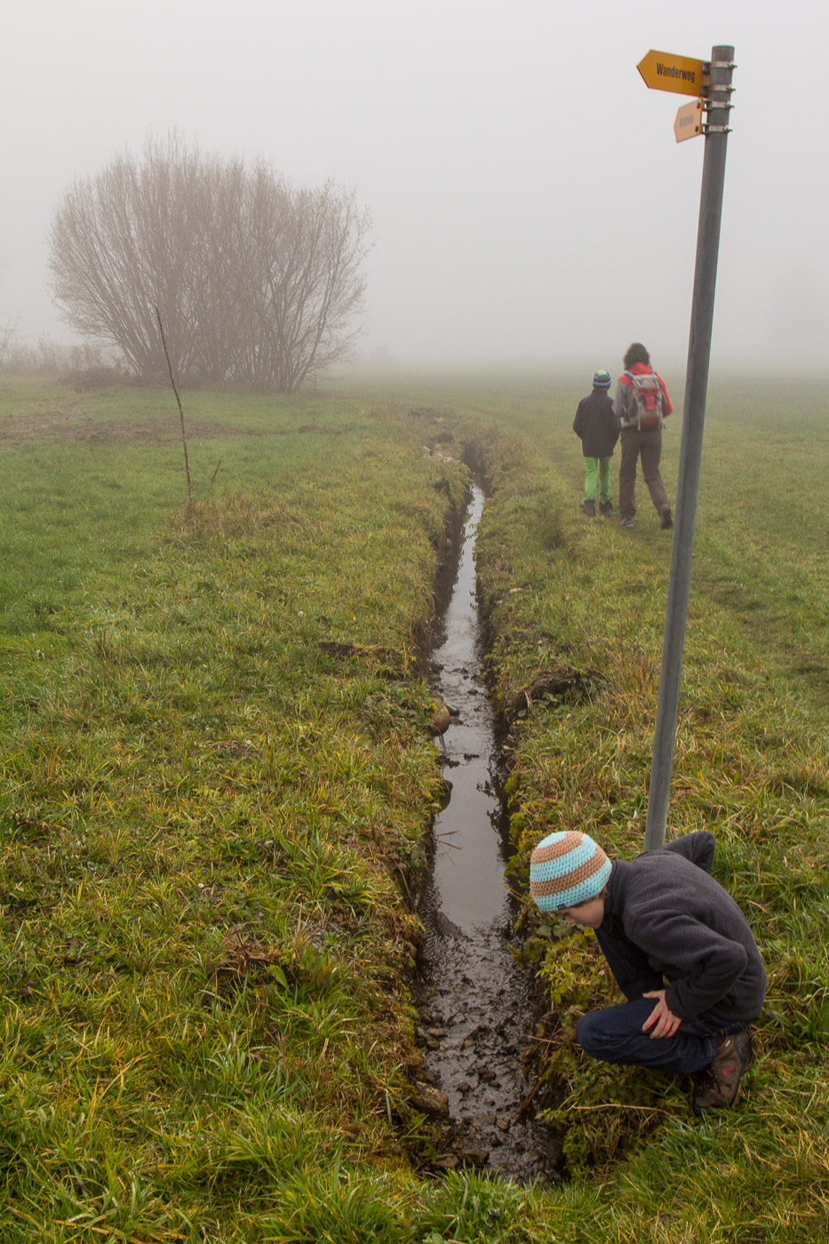 Wir wandern weiter durch den Wald, bergen einen Geocache in einem originellen Versteck. Beim Waldausgang können wir dann tatsächlich ein paar Sonnenstrahlen geniessen, bevor wir wieder in den Nebel eintauchen, der uns bis zum Schluss umhüllen wird. Erfreut stellen wir fest, dass hier ein Radweg durchführt. Müssen wir mal ausprobieren! Wir erreichen Ferren bei dichtem Nebel und entscheiden hier, uns Baldegg zuzuwenden.