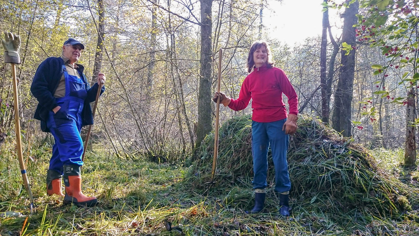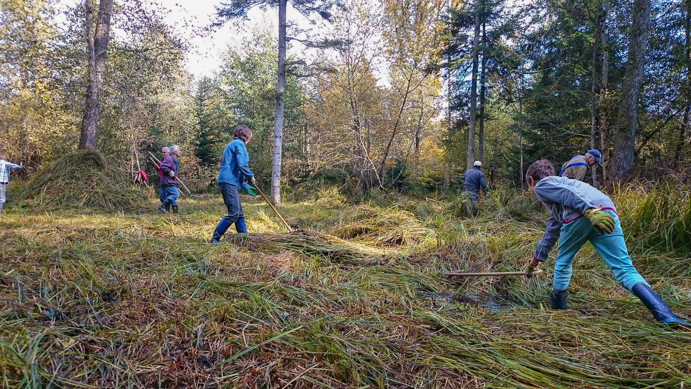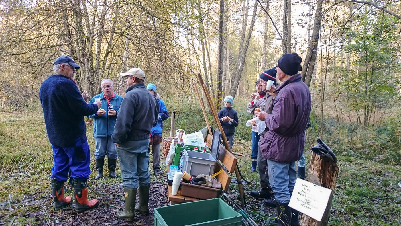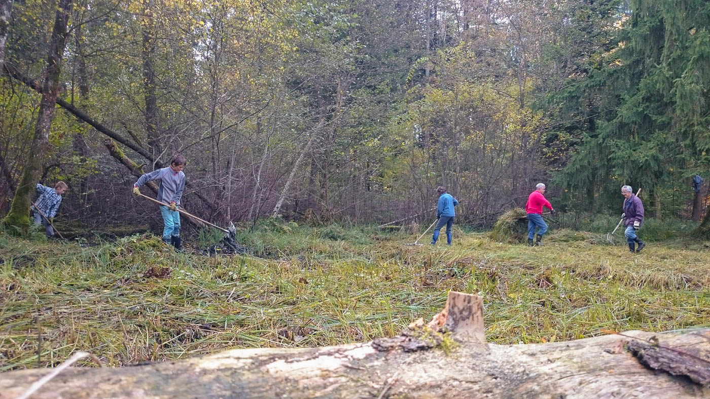 Nach der Mittagspause im Restaurant (das Essen wurde vom Verein offeriert) kehrten wir in den Wald zurück, aber an einen anderen Standort, als „Möösli“ oder „Geisterweiher“ bekannt. Viel ist von dem Weiher tatsächlich nicht mehr übrig, der Verlandungsprozess ist hier schon ziemlich fortgeschritten. Wieder packten alle an, nach zwei Stunden war das Gras gemäht und zu Hügeln aufgeschichtet. Den Rest des schönen Tages konnten wir an der Sonne geniessen.