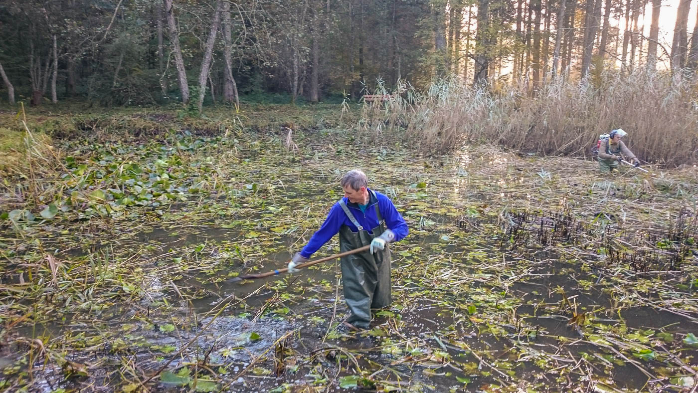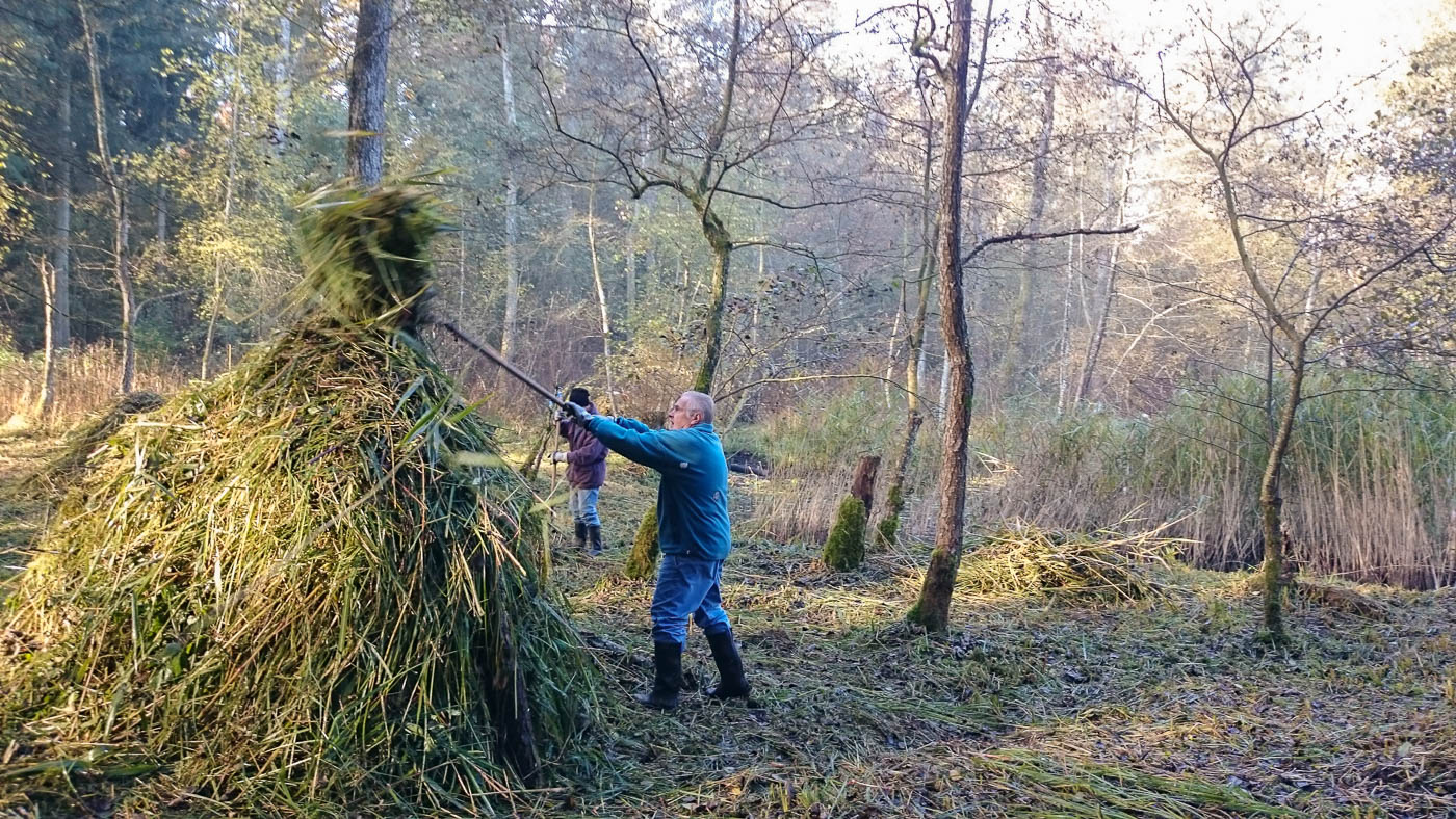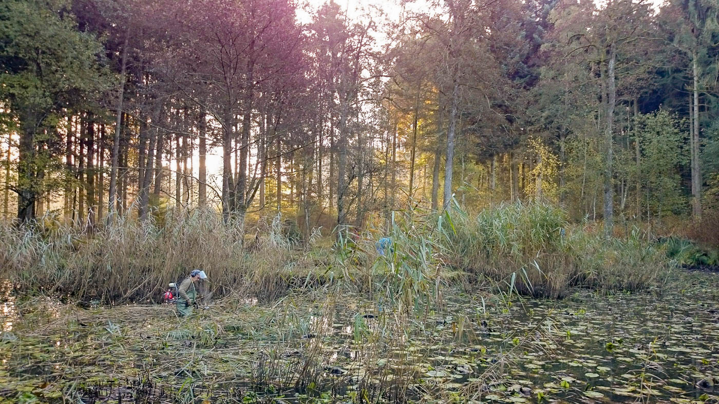 Eine Arbeit bestand darin, das Schilf zu schneiden und an Land zu bringen. Ich war für zweiteres eingeteilt. In Fischerhosen watete ich im Wasser, was nicht ganz einfach war bei dem schlammigen Untergrund. Jedenfalls war ich froh, dass Stiefel und Hosen ein Stück waren, ich hätte oft den Stiefel verloren. Warum aber das Schilf entfernen? Wenn man nichts macht, verlandet der Weiher innert kürzester Zeit. Irgendwann wird man ihn wohl ausbaggern müssen.