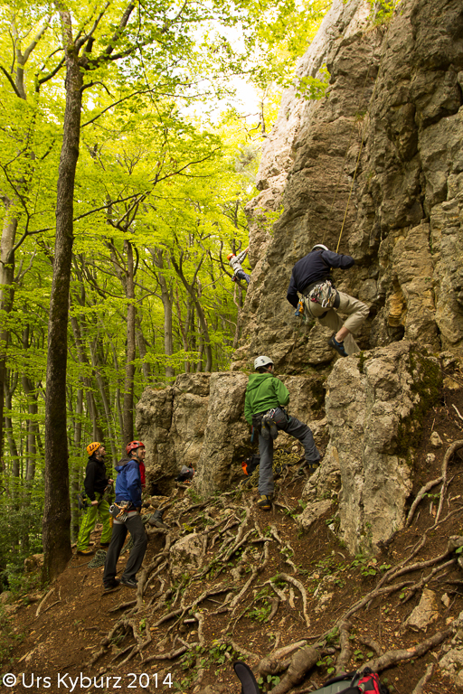 Nach dem Mittagslunch fassten wir endlich den Felsen an, der inzwischen auch etwas wärmer und trockener wurde. Sofort wurde das Gelernte umgesetzt, jeder kletterte seinen Fähigkeiten entsprechend, für die weniger Geübten wurde das Seil zum Topropeklettern (Seil durch die Umlenkung) eingerichtet, damit sie unbeschwert ihre ersten Versuche im Fels machen konnten.