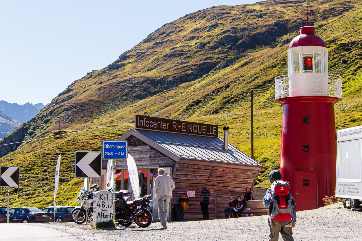 Wir stehen auf dem Oberalppass, bereit für die Wanderung. Rundum erheben sich Berge, Motorräder rasen lärmend an uns vorbei. Nur etwas passt nicht in die Szenerie, nebst den nervenden Motorrädern: Ein roter Leuchtturm steht auf der Passhöhe. Dieser ist eine Nachbildung des Exemplars, das lange in Hoek van Holland stand, wo der Rhein ins Meer fliesst. In dessen Einzugsgebiet leben 50 Millionen Menschen, die alle angeblich davon träumen, einmal die Quelle dieses lebenswichtigen Stromes zu besuchen. Wir wollen nun nicht mehr nur davon träumen, sondern den sagenhaften Tomasee aufsuchen.