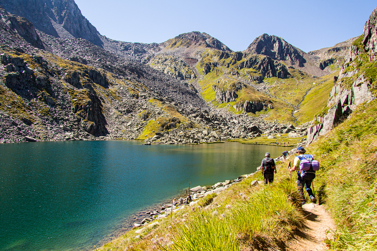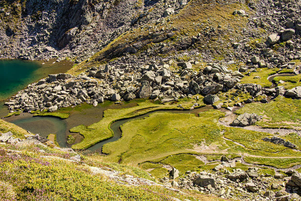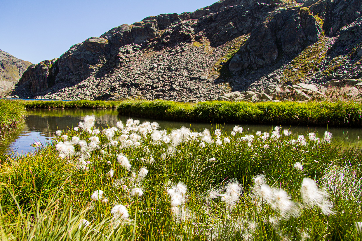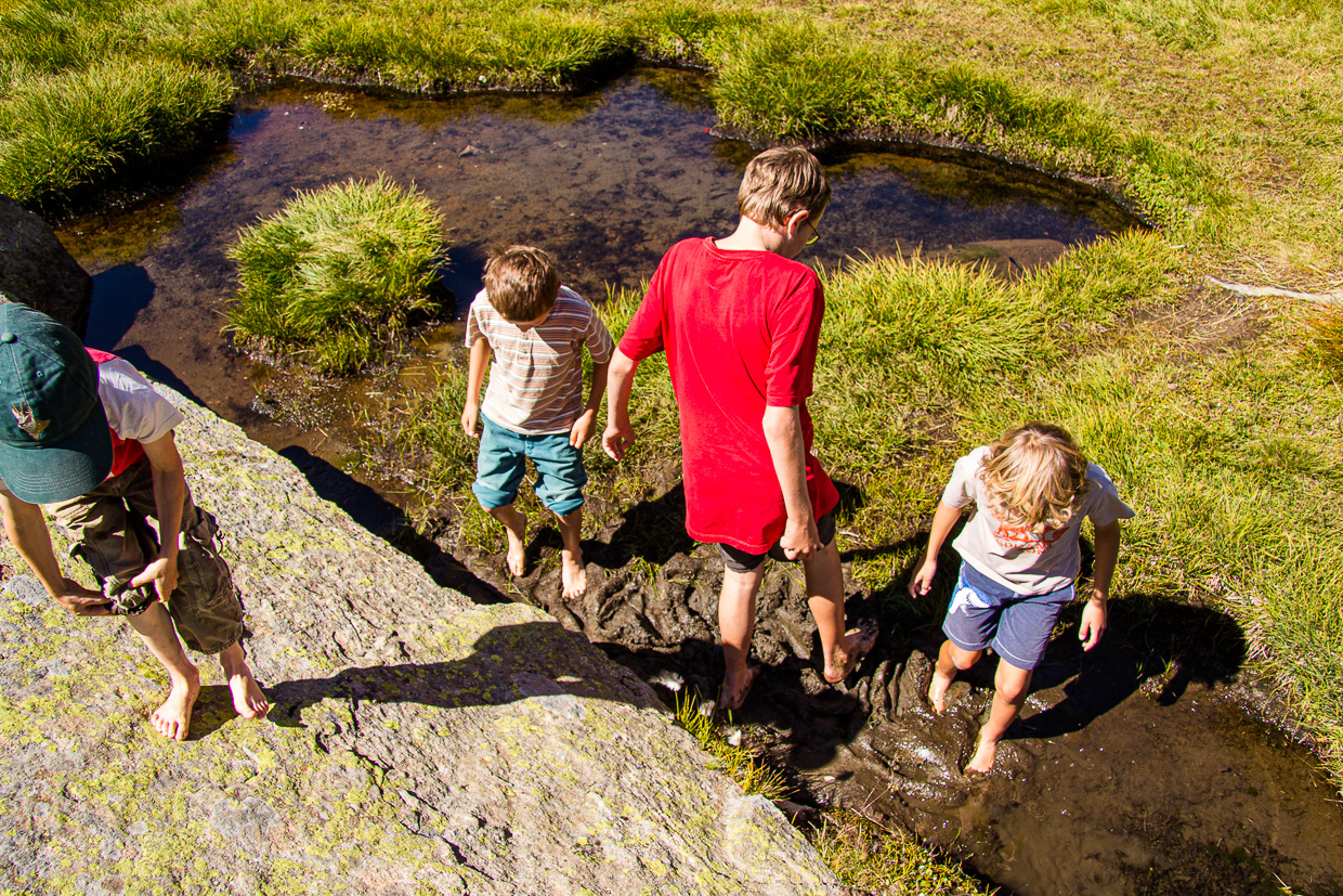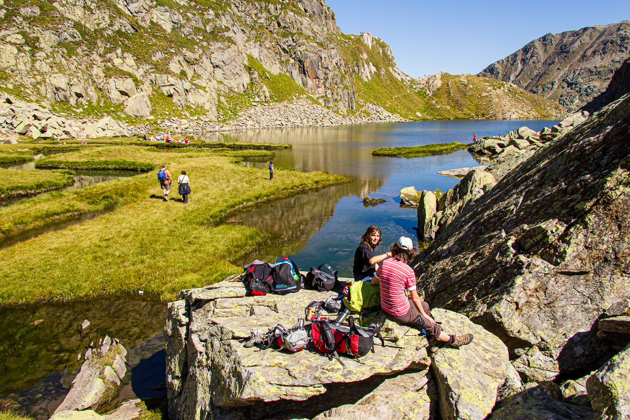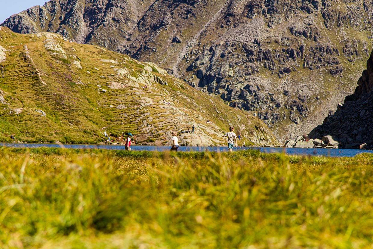 Nun wird der Weg steiler, dafür naht unser erstes Ziel: Der Tomasee. Bald erblicken wir ihn, das Naturwunder, den Kraftort, den Ursprung des wichtigsten Flusses Westeuropas. Als wir die Dutzenden anderen Wanderer erblicken, ist die Mystik aber etwas dahin. Trotzdem, eine Pause ist hier unbedingt erforderlich, wir geniessen die schöne Landschaft, während die Kinder im Wasser herumwaten und im Matsch stampfen.
