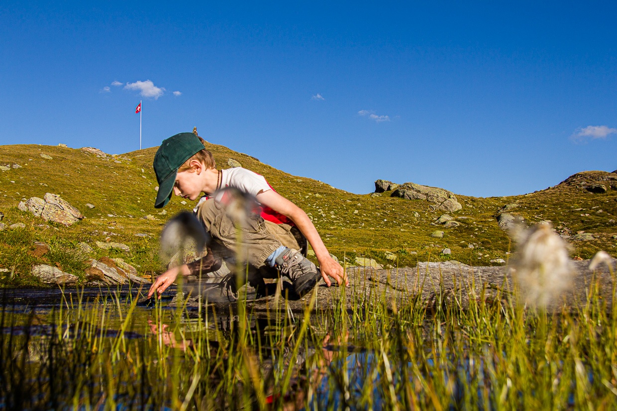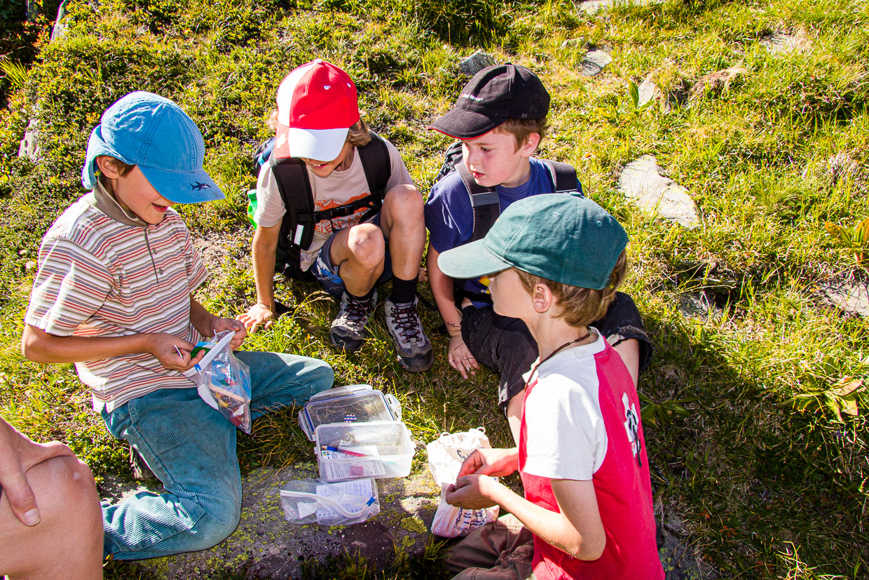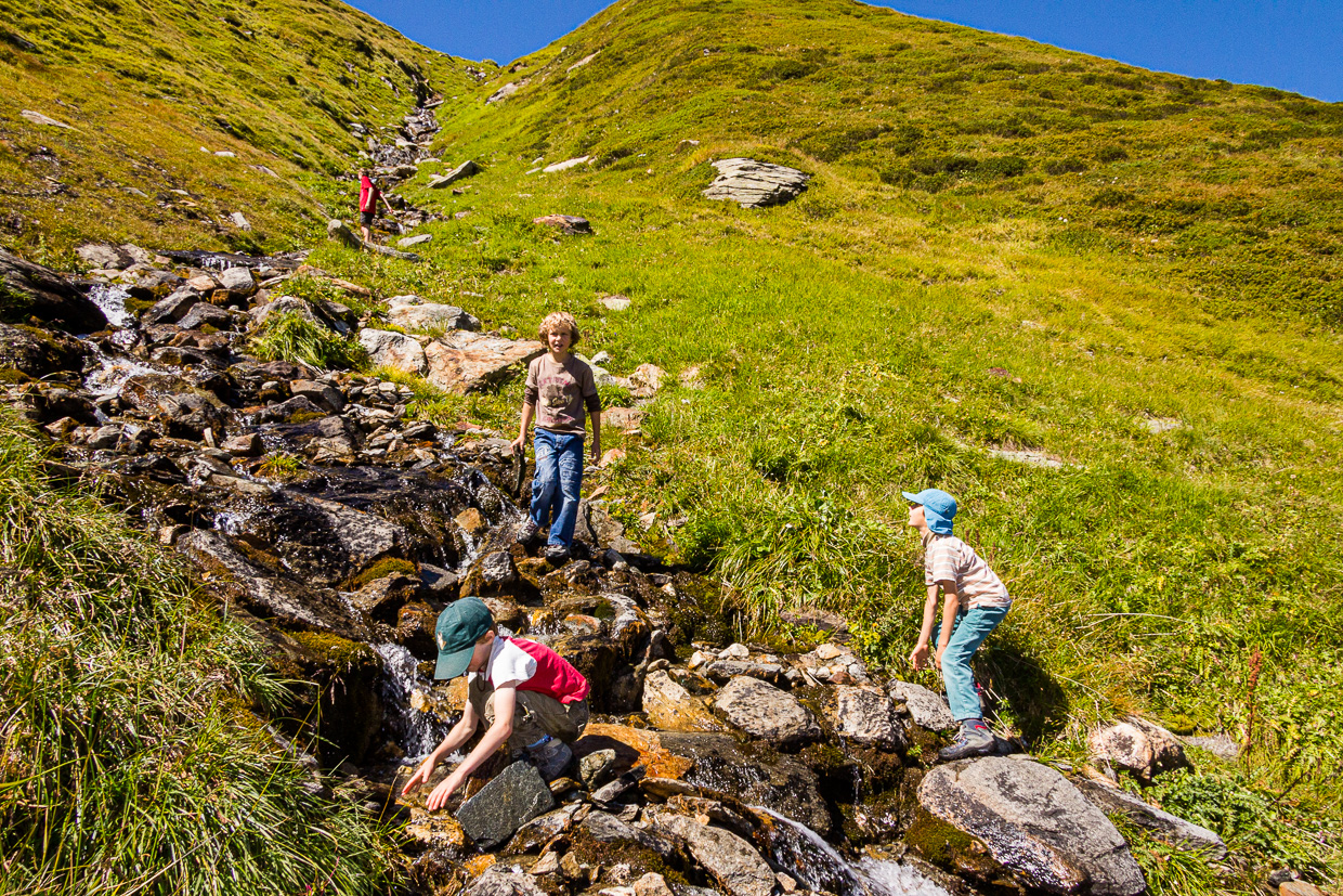 Der Weg führt zuerst neben der lauten Strasse entlang abwärts. Die Kinder fechten auf dem schmalen Weg Positionskämpfe aus, jeder will der Vorderste sein. Nino Schurter, unser Mountainbike-As, hätte seine Freude daran. Bald können wir aber dem Motorenlärm entfliehen, der Weg biegt in südlicher Richtung ab. Es ist September, die Bergwiesen leuchten bereits in herbstlichen Farben, keine Wolke trübt den Himmel. Das Tempo hat nun merklich nachgelassen, die Jungs haben sich ausgetobt. Wir blicken auf die Surselva, die Landschaft „ob dem Wald“ von Flims. Am Fusse des Piz Cavradi liegt die Maighelshütte, ein Ausgangspunkt für weitere schöne Wanderungen im Gebiet. Immer wieder kreuzt ein Bach unseren Weg, an einem davon legen wir eine längere Pause ein.