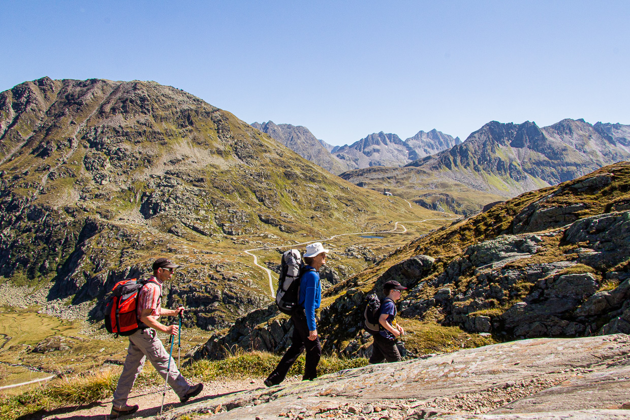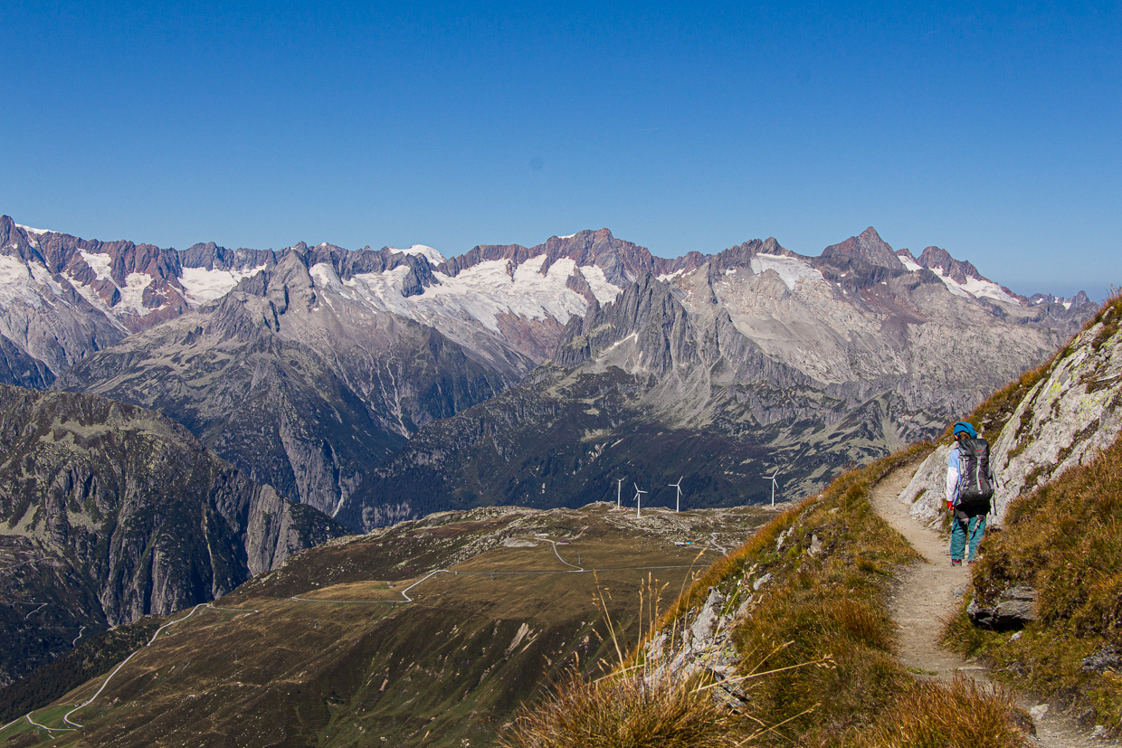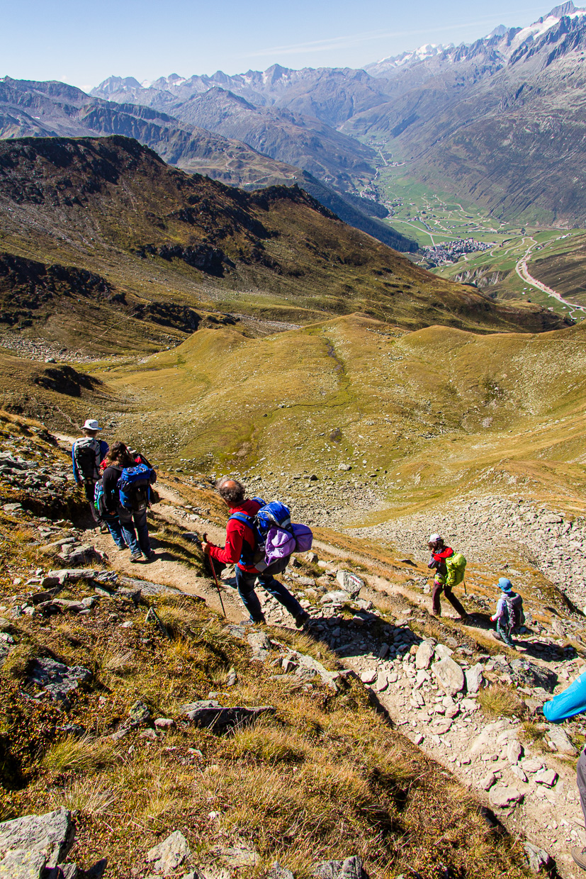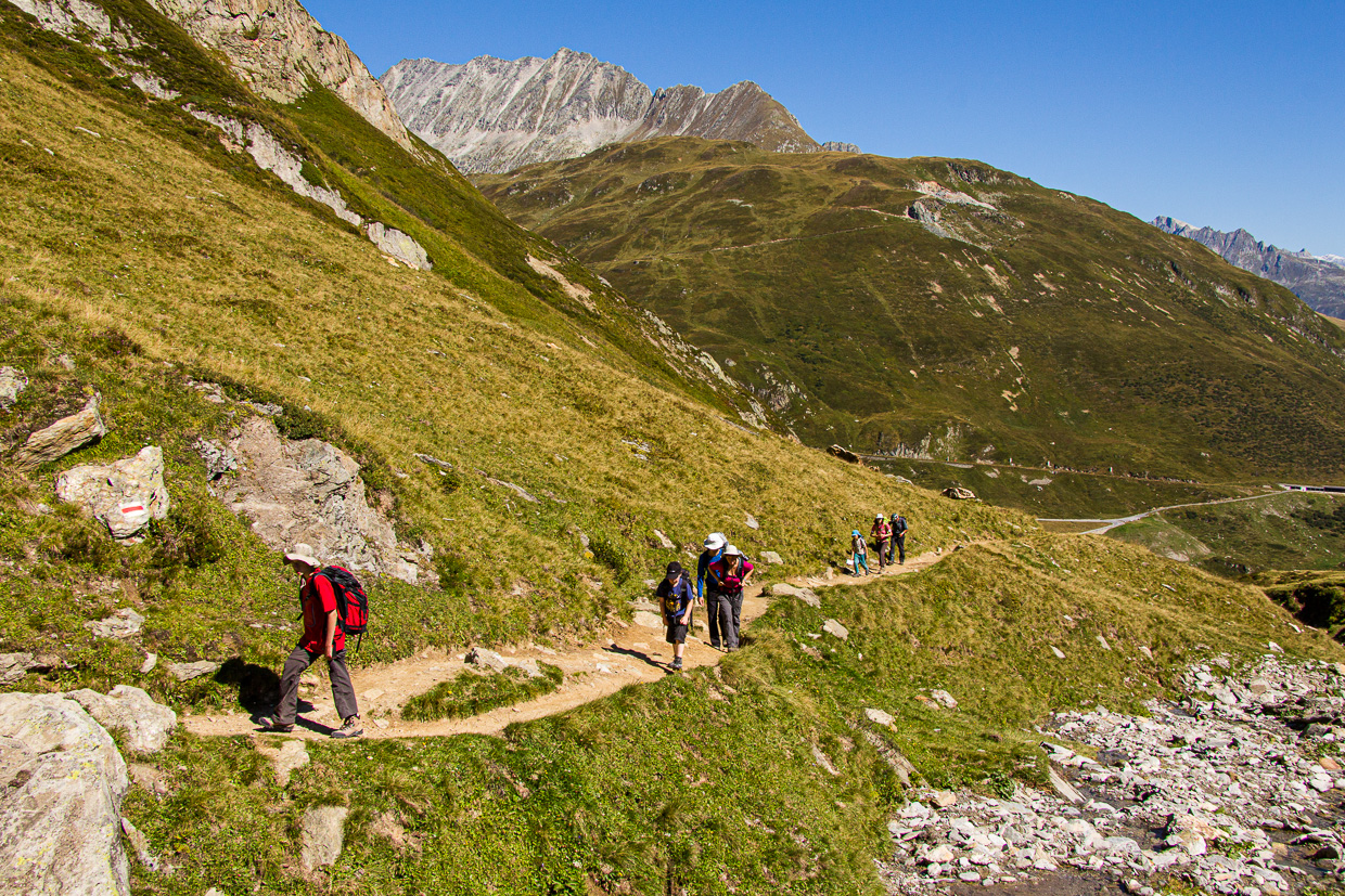 Nach einem kurzen Aufenthalt machen wir uns wieder auf den Rückweg. Der Weg von der Martschallücke zum Pazolastock fällt zur linken Seite steil ab, wir mahnen nochmals zur Konzentration. Auf dem Pazolastock treffen wir die anderen der Gruppe. Die Aussicht ist auch hier fantastisch, wir haben genügend Zeit, die Berge zu bestimmen. Nach der ausgiebigen Pause nehmen wir den steilen Abstieg in Angriff. Auch dieser Weg verlangt volle Konzentration. Mit seinen vielen Kurven gemahnt er an das Stilfser Joch mit seinen endlos vielen Kehren. Wir haben zum Glück nicht so viele zu bewältigen, schon bald wird der Weg flacher. Wir kommen an Stellungen aus dem Zweiten Weltkrieg vorbei. Diese waren Bestandteil des Reduit, der Alpenfestung im Gotthardgebiet. Allmählich dröhnt der Strassenlärm wieder zu uns herauf, das bedeutet, dass wir bald wieder beim Leuchtturm auf der Passhöhe stehen und wir um zwei Gipfelerlebnisse reicher sind.