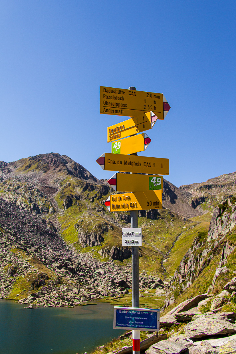 | Route: | 1. Tag: Von der Passhöhe Oberalp östlich Richtung Graubünden zuerst absteigen, dann südwärts dem Hang entlang zum Tomasee aufsteigen. Vom See entweder wieder zurück bis zur Lücke und dem Wegweiser Badushütte folgen, oder beim Tomasee weiter westwärts und auf diesem Weg zur Badushütte