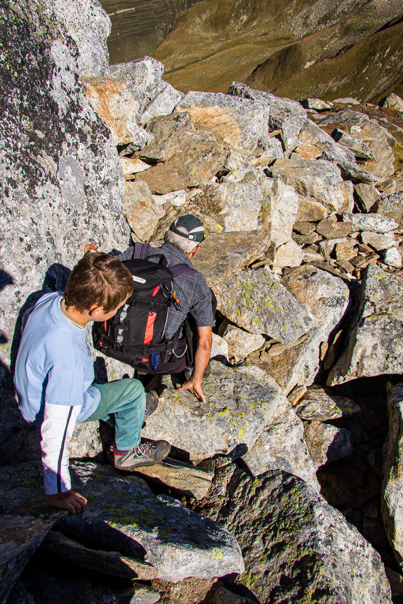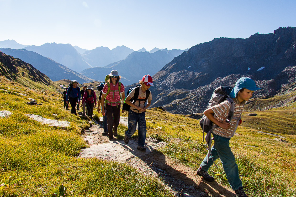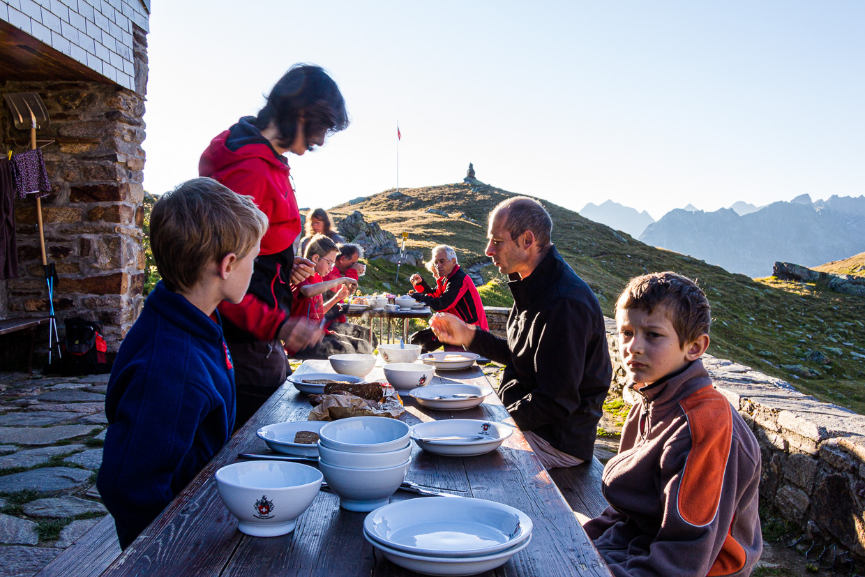 Der Weg zur Badushütte wird nun steiler. Aber schon bald erreichen wir deren sonnenbeschienene Terrasse. Wir geniessen den restlichen Nachmittag, die Kinder sind rund um die Hütte unterwegs, ohne dass man sie ständig im Auge behalten muss. Der temporäre Hüttenwart (die Hütte wird von Freiwilligen der SAC-Sektion Manegg bewartet) erzählt uns nach dem feinen Nachtessen etwas über die Hütte und andere Geschichten.