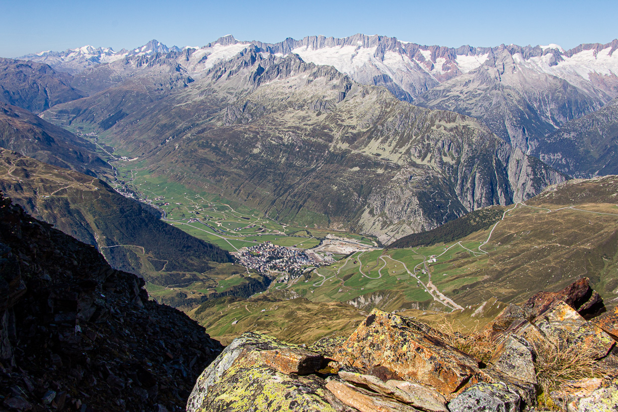 Start am nächsten Morgen, gleich hinter der Hütte steigt der Weg an zur Martschallücke. Immer wieder hören wir Murmeltierpfiffe, ab und zu huscht eines in sein Erdloch. Bald erreichen wir den Grat und erblicken auf der anderen Seite das Urserental sowie die Berge des Furkagebietes. Nun die entscheidende Frage: Wer will auf zwei Gipfel? Eine Handvoll entscheidet sich für den Rossbodenstock, der Rest wandert direkt zum Pazolastock. Um auf ersteren zu gelangen, müssen wir zuerst wieder absteigen und einen schmalen Grat überqueren. Nach einem kurzen Aufstieg, der Trittsicherheit erfordert, erreichen wir den Gipfel, oder besser das Plateau. Er ist nämlich eine grosse Ebene, wo es schwierig ist zu entscheiden, welches wohl jetzt der höchste Punkt ist. Jedenfalls geniessen wir hier eine prachtvolle Aussicht.