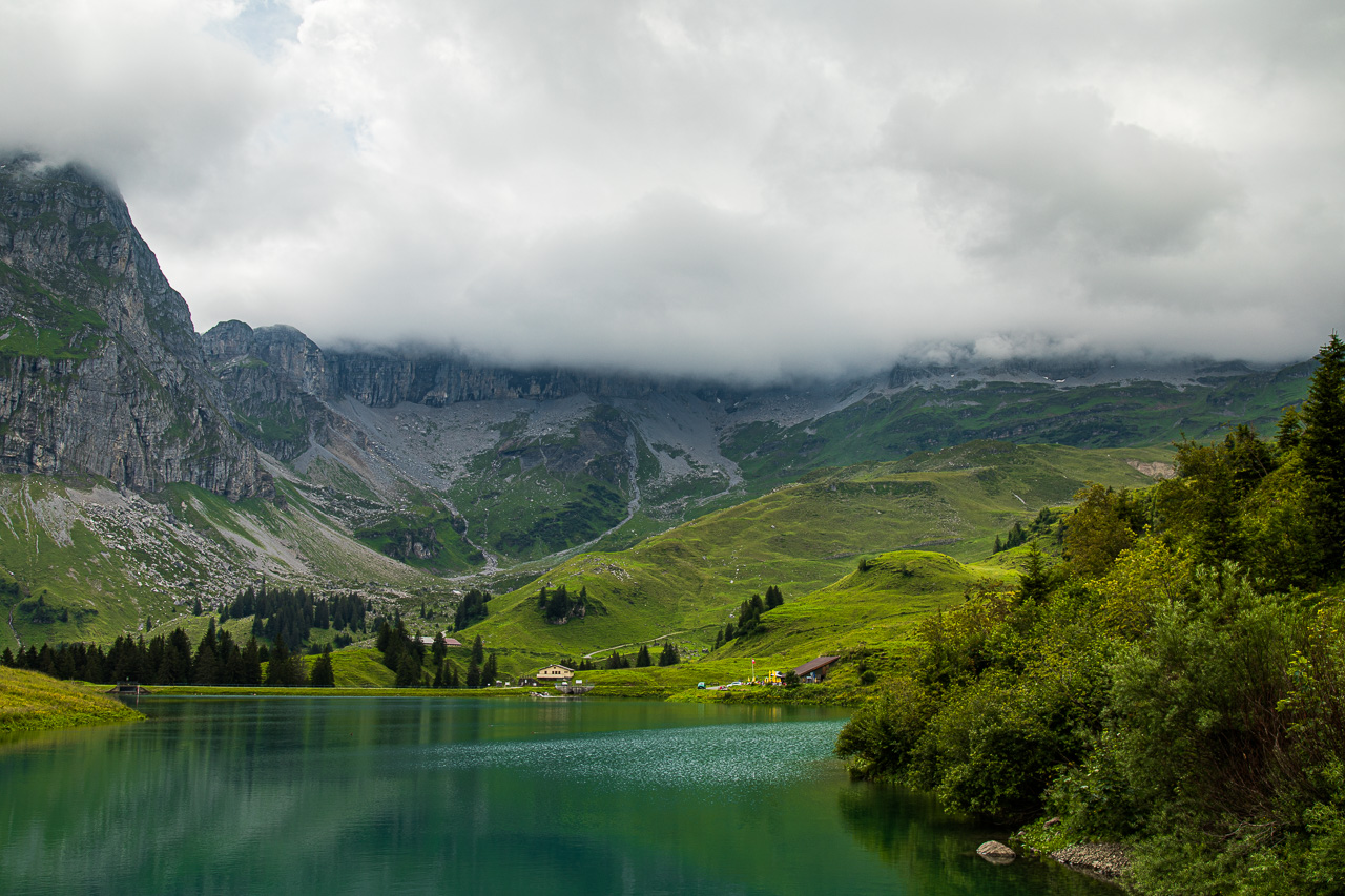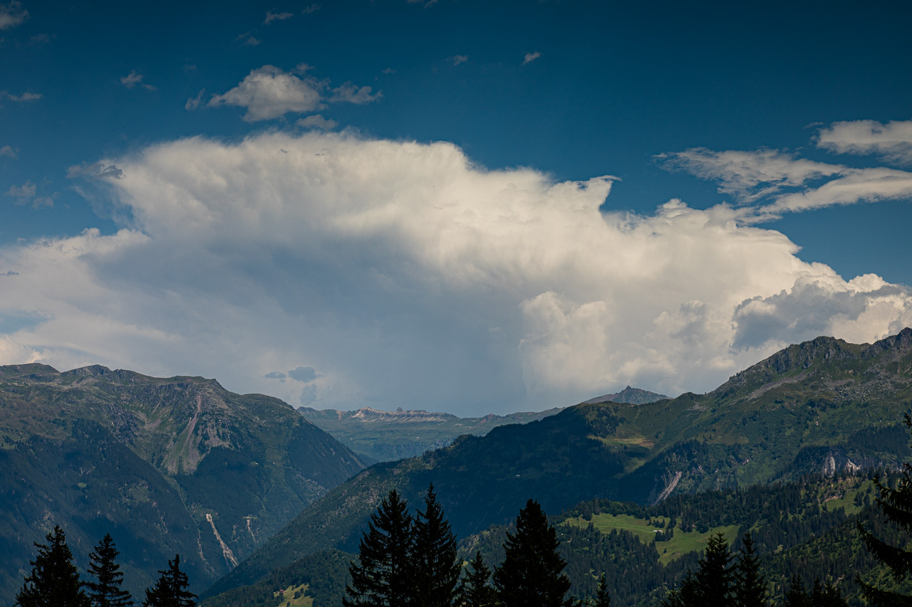 Wir steigen wieder ab zum Wanderweg und auf diesem direkt zum See, wo es jetzt noch mehr Leute hat. Und das Bergrestaurant Bächialp hat Glück, diesmal haben wir Durst und kehren ein. Allerdings nur kurz, denn der Wind frischt auf und der Himmel verdüstert sich. Wir trinken schnell aus und gehen weiter. Die ersten Tropfen fallen, gehen in ein Nieseln über. Aber kaum begonnen, ist der Regen auch schon vorbei. Wir sind nur am Rand des Gewitters, sehen es abziehen Richtung Spitzmeilen. Bei Sonnenschein erreichen wir unser Hotel und löschen erst mal den Durst.