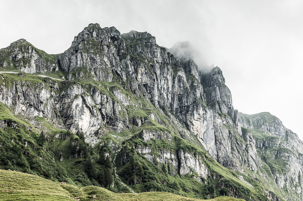 Braunwald ist eine Streusiedlung und nur mit der Bahn erreichbar. Grundsätzlich ist es autofrei, Landwirtschafts- und kleine Transportfahrzeuge können einem aber trotzdem ab und zu begegnen. Wir erkundeten das Dorf an einem eher trüben Tag, es hatte in der Nacht stark geregnet.